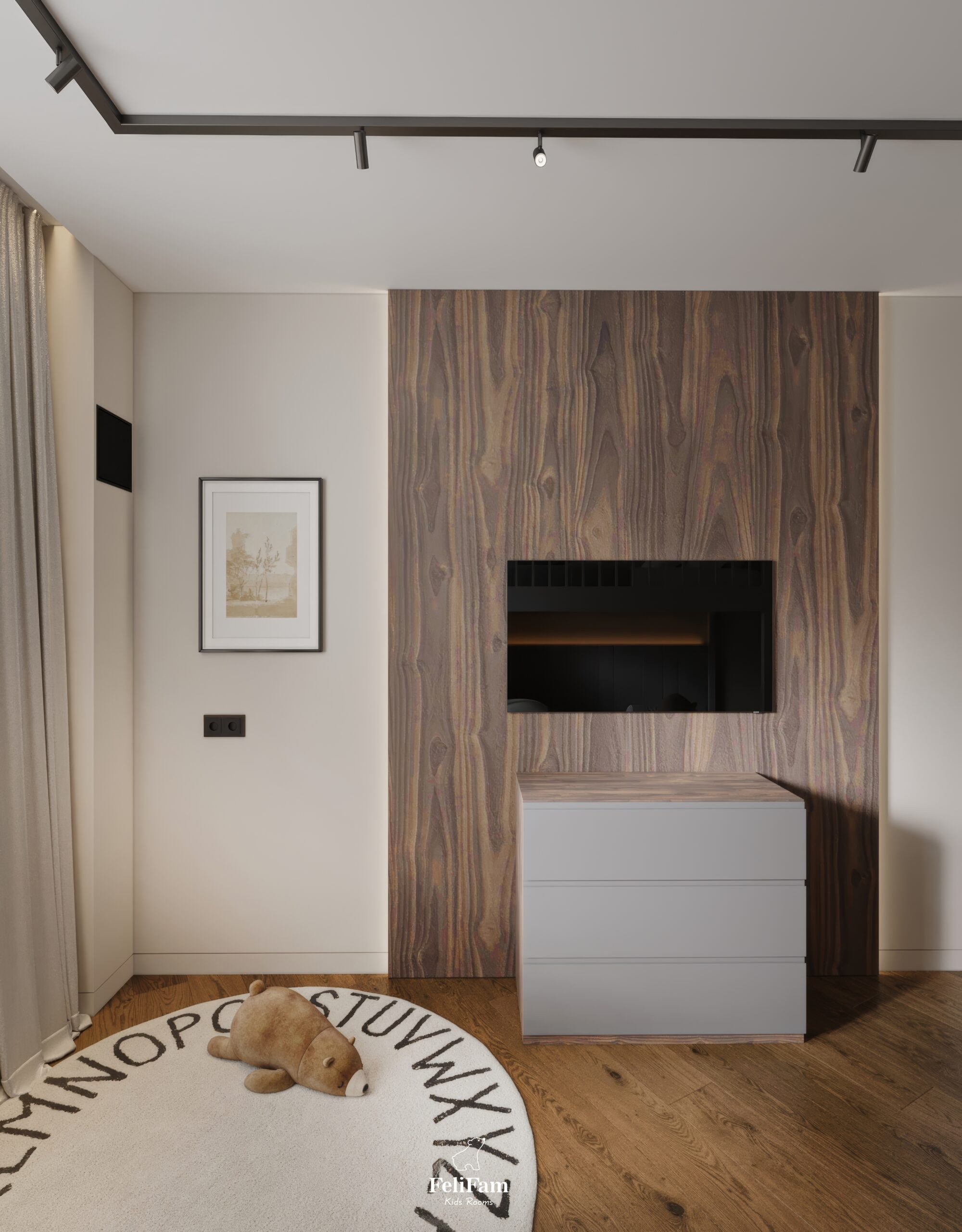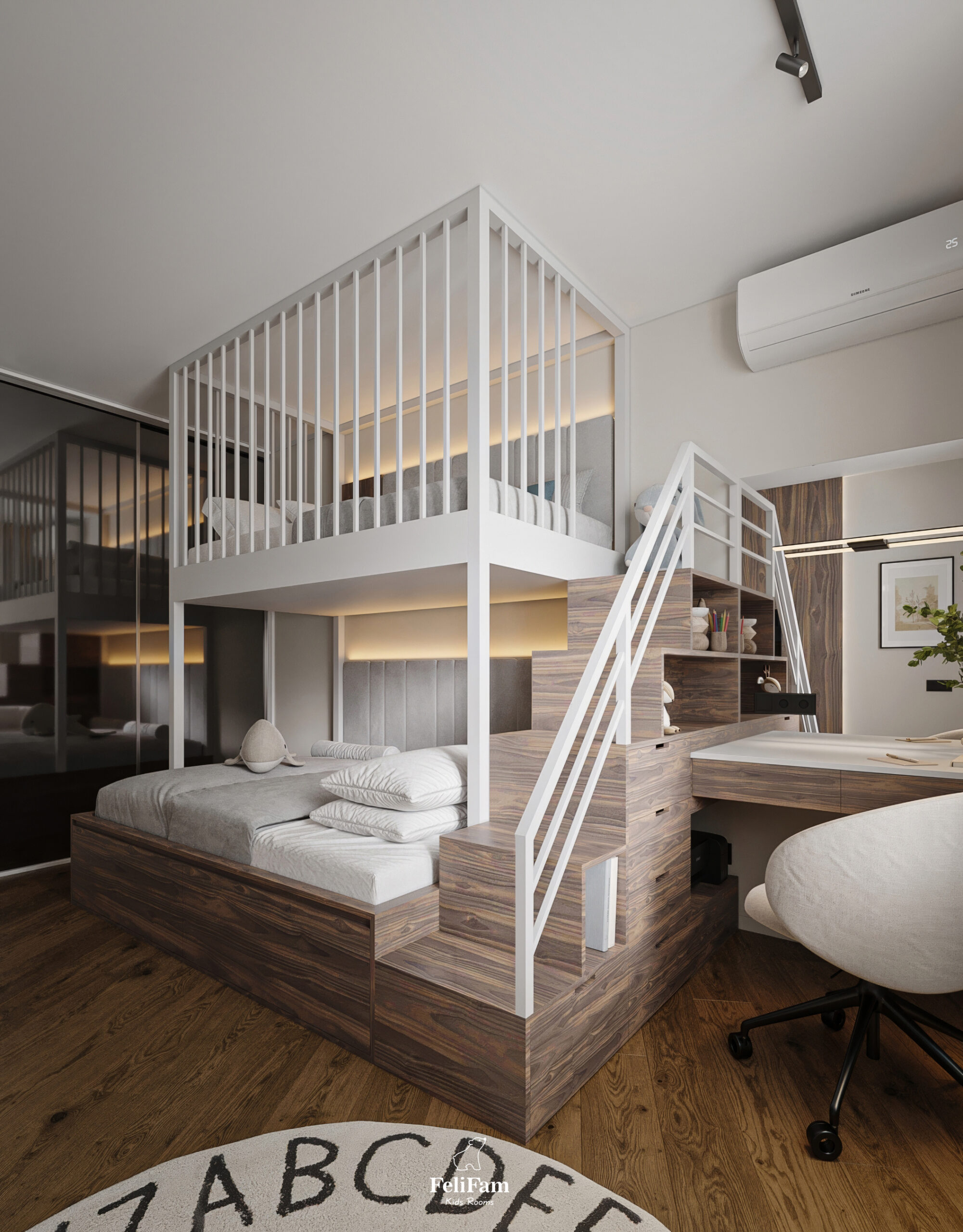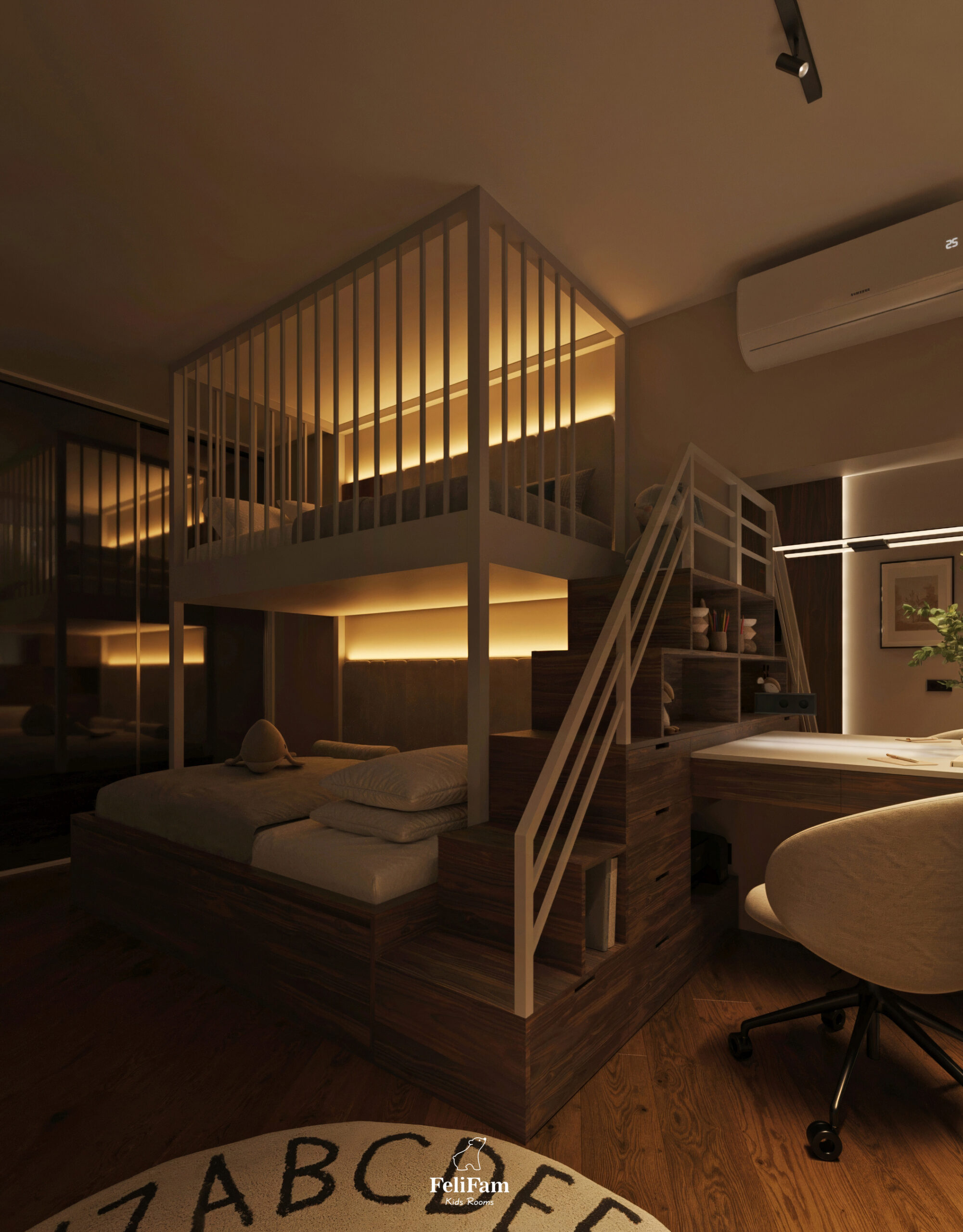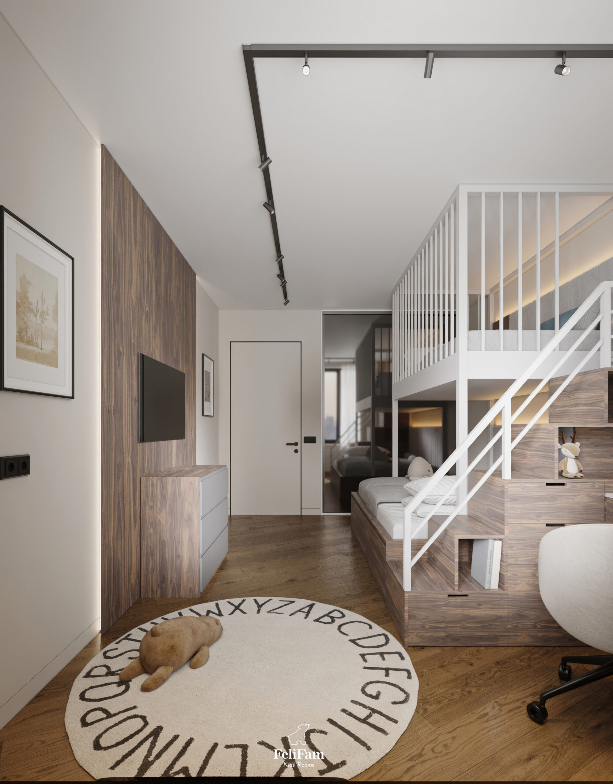 A space for two — harmony, comfort, and style. This room for two girls combines functionality and coziness thanks to thoughtful planning. Two full sleeping places are organized in a bunk bed construction allowing maximum efficient use of space. The natural color palette creates a calm atmosphere, and soft lighting in the sleeping areas adds intimacy and warmth. This is a space where every child can dream, rest, and develop comfortably.