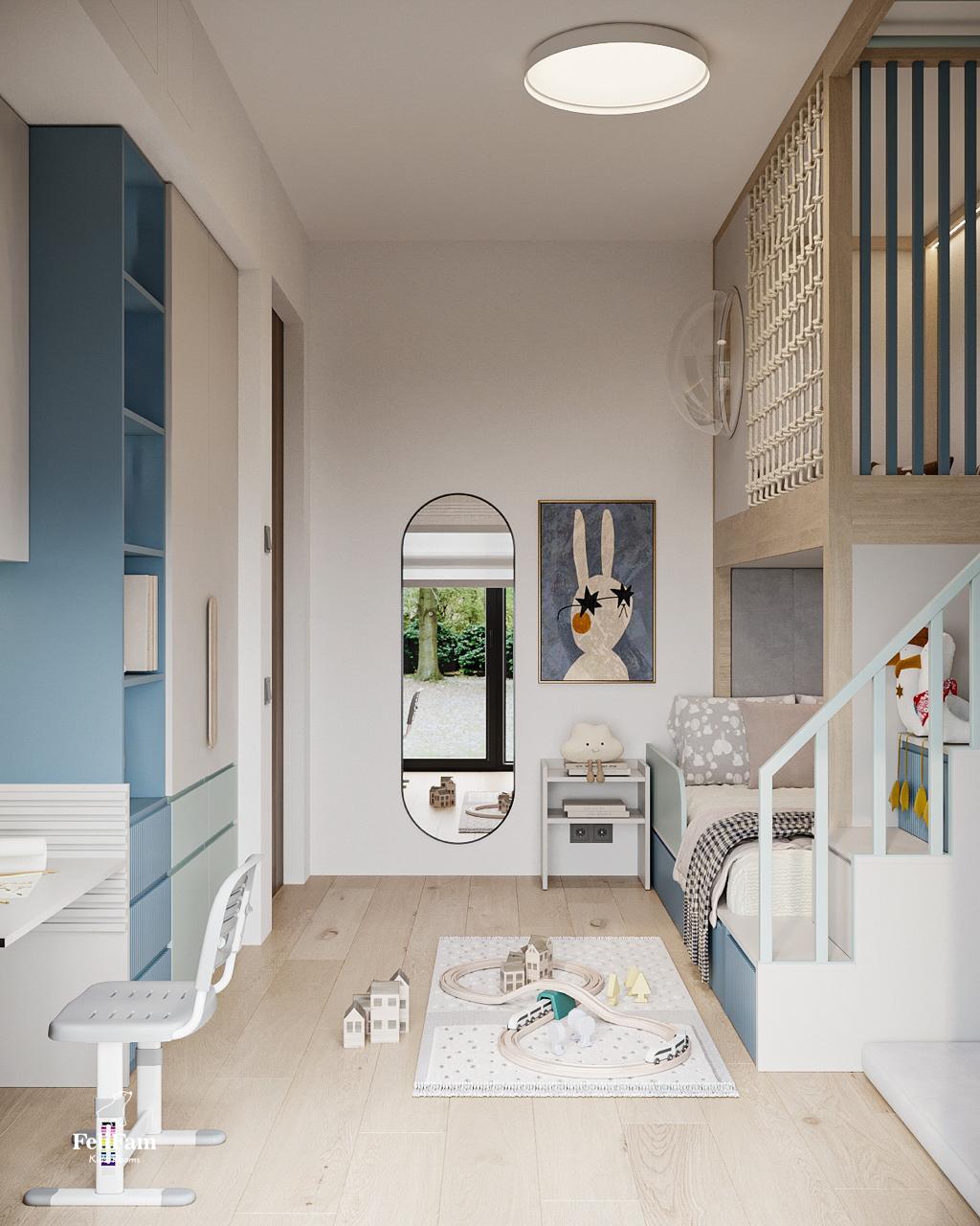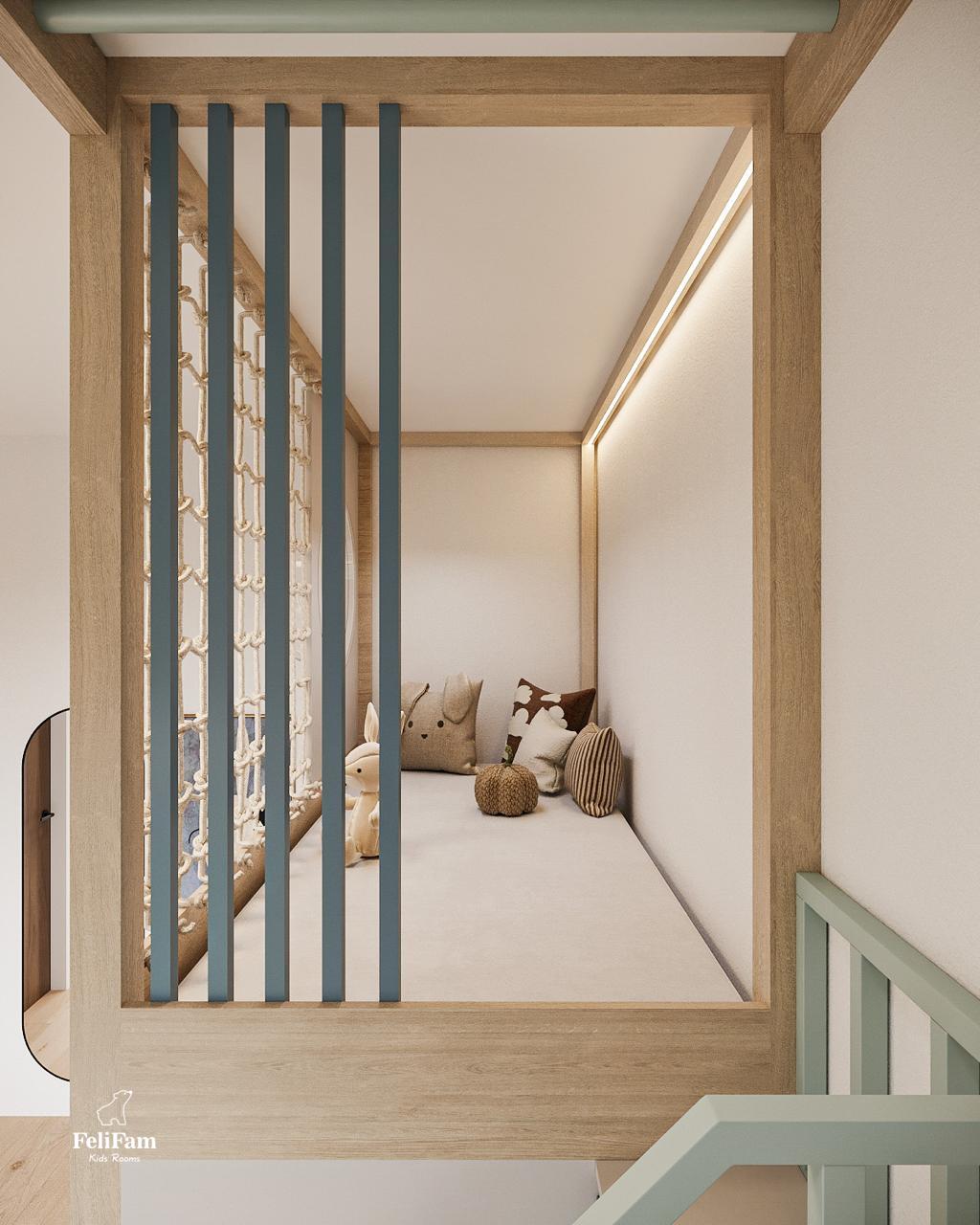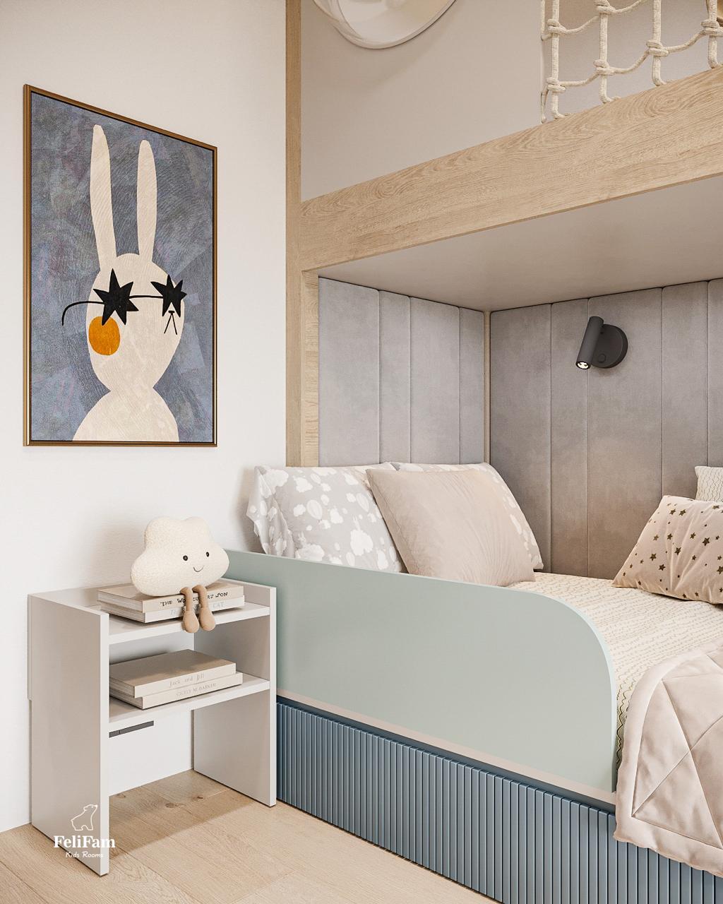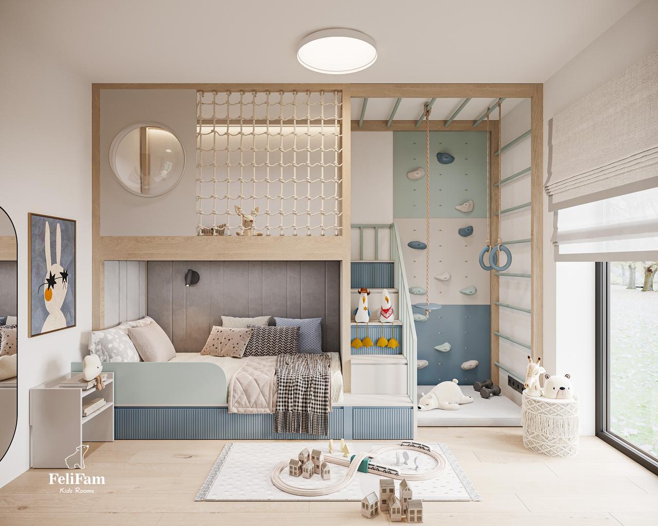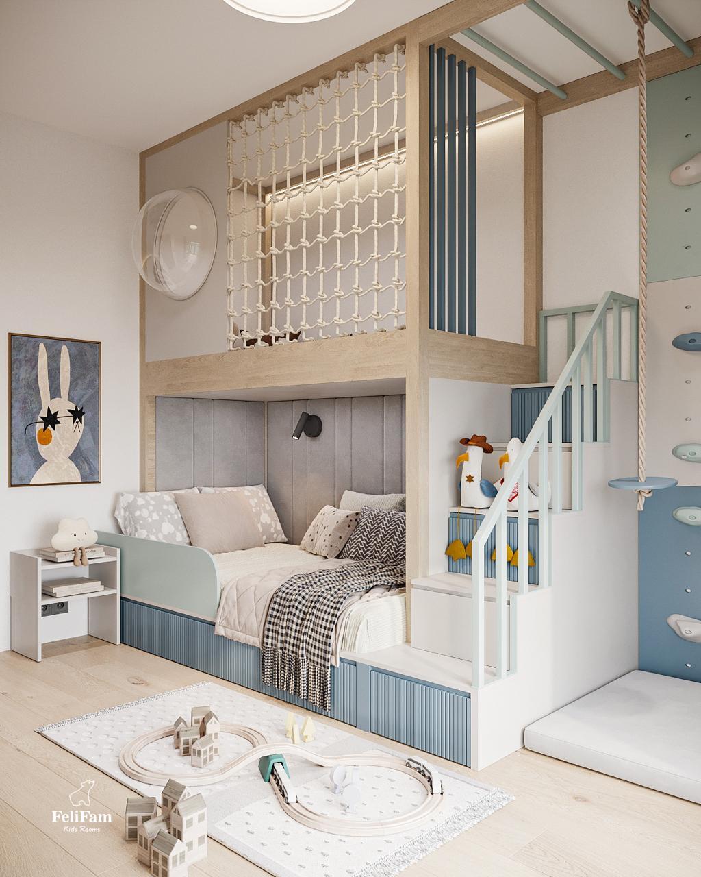 A bright space for children’s dreams and adventures. This room is done in soft light gray and blue shades creating an atmosphere of calm and freshness. The central element of the space is a bunk bed: the lower level is designed for comfortable sleep, and the upper for play and fantasy adventures. Such a solution allows effective use of space while keeping balance between rest and activity. The ideal place for a child’s development in style, comfort, and coziness.