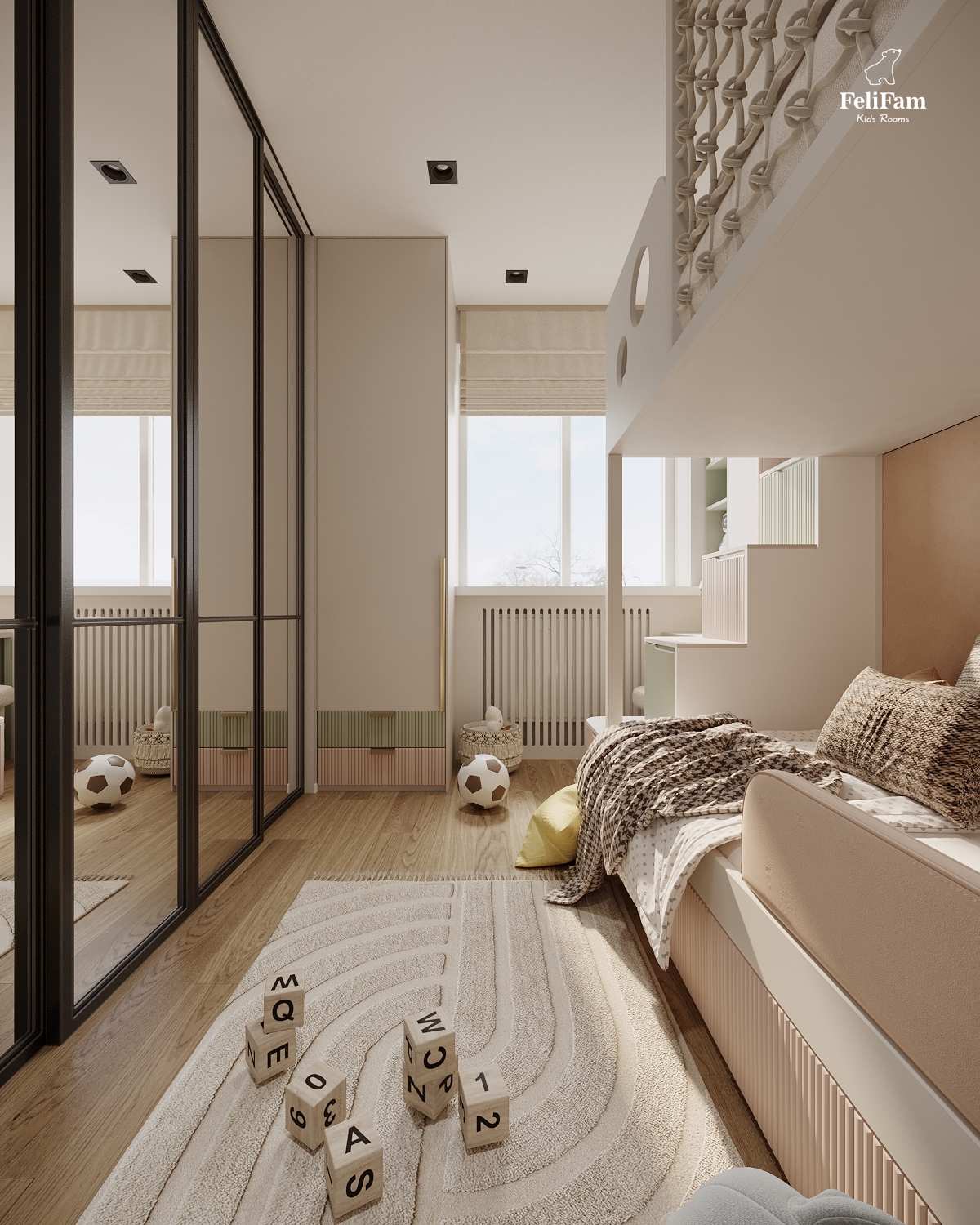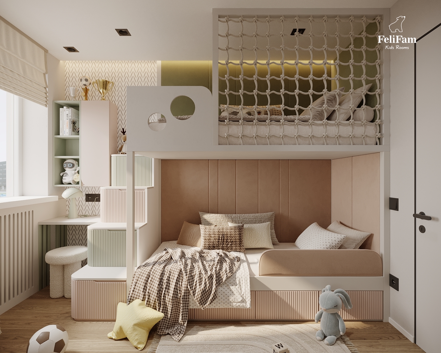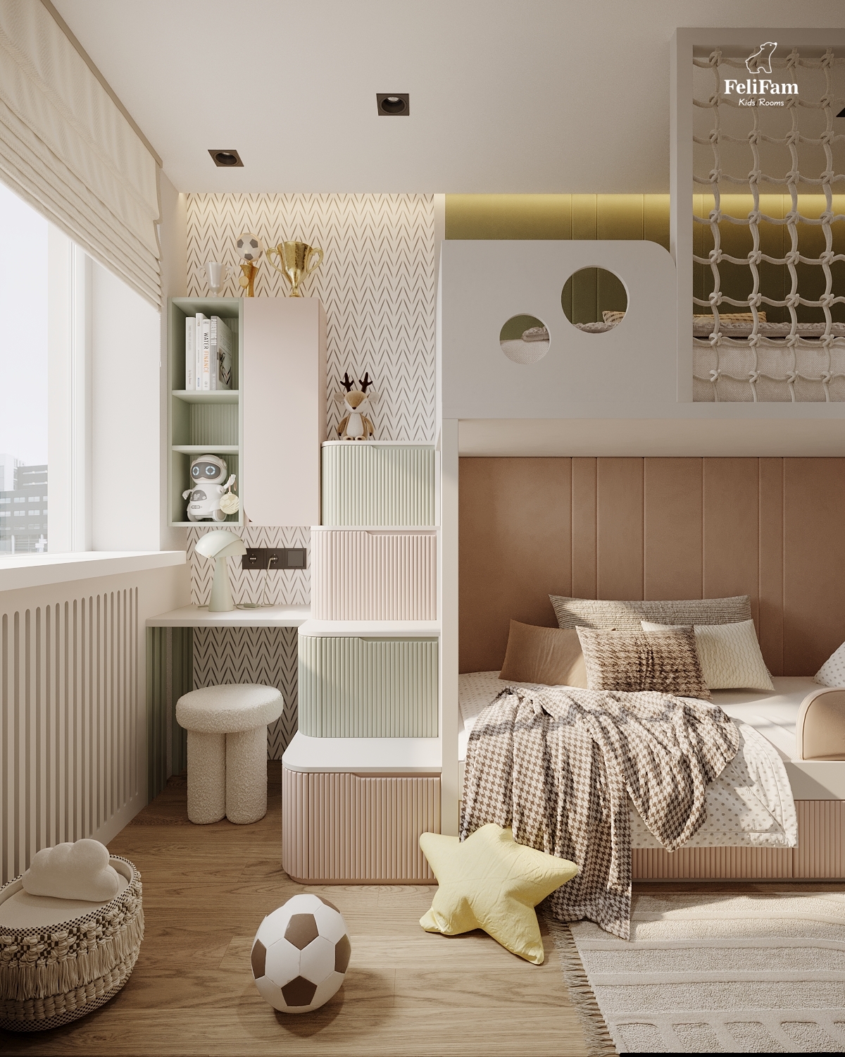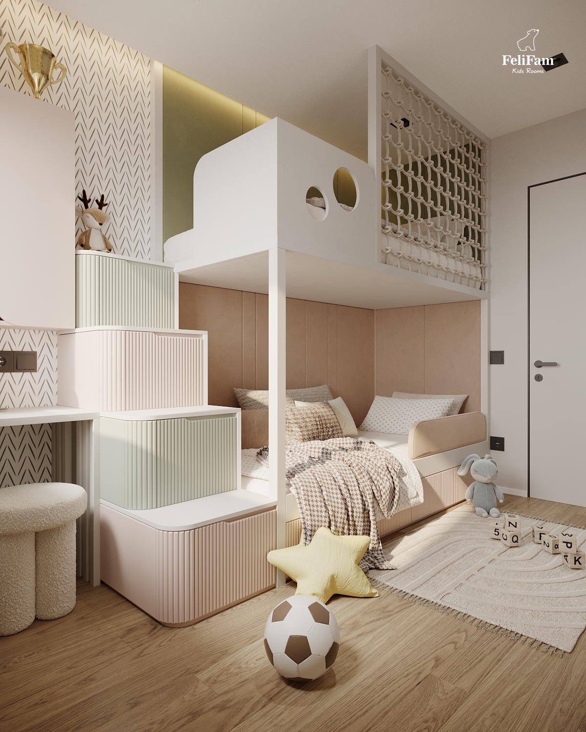 A harmonious room for a boy and a girl. This space is created taking into account the needs of two children of different genders. The bunk bed helps save space and organize separate sleeping zones while maintaining a sense of openness. A large storage system keeps things in order, ensuring comfort and convenience in everyday life. A cozy, functional, and stylish room where every child has their own corner.