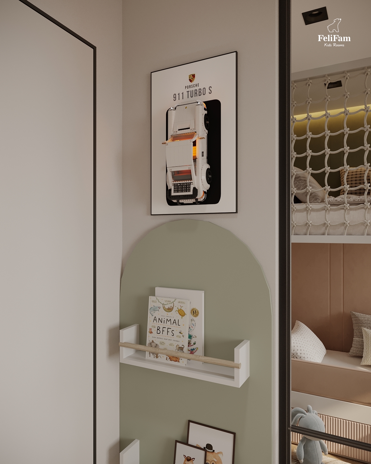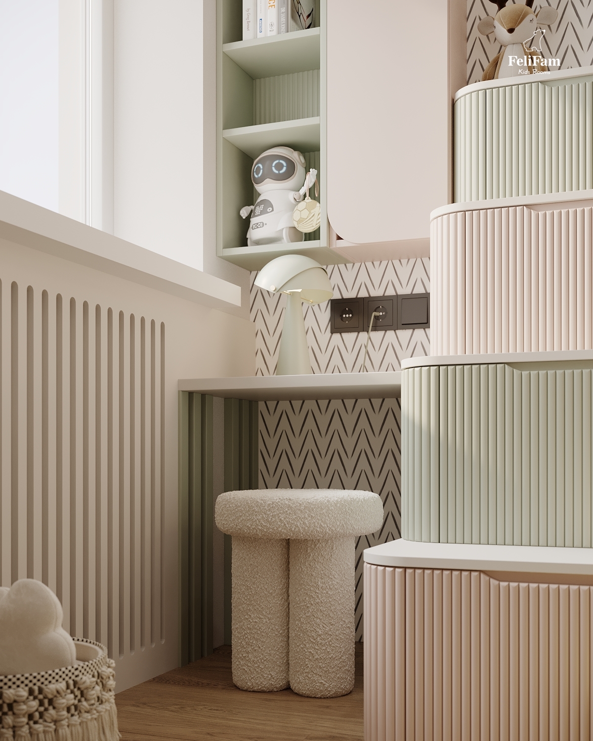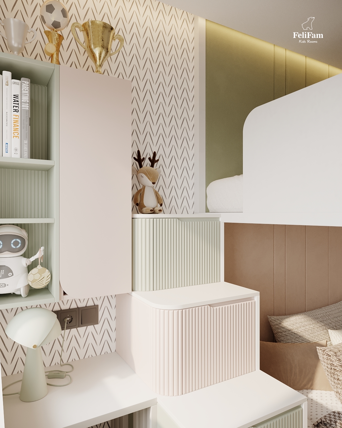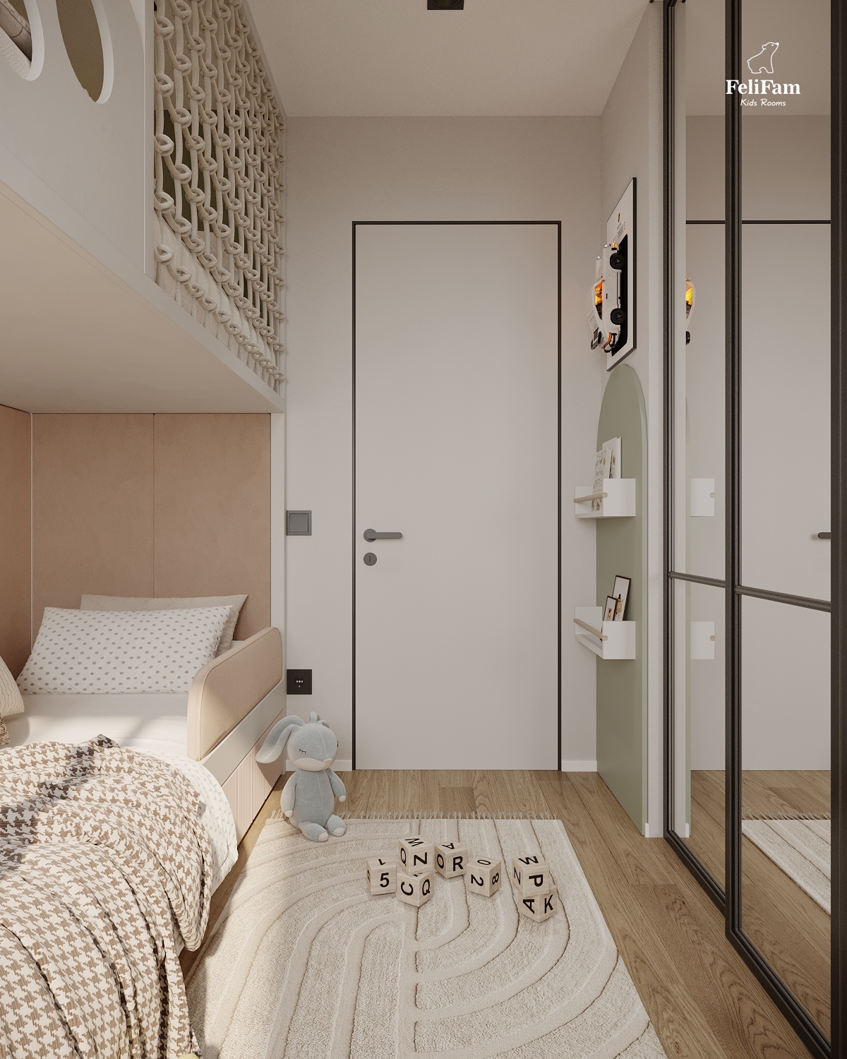 A harmonious room for a boy and a girl. This space is created taking into account the needs of two children of different genders. The bunk bed helps save space and organize separate sleeping zones while maintaining a sense of openness. A large storage system keeps things in order, ensuring comfort and convenience in everyday life. A cozy, functional, and stylish room where every child has their own corner.
