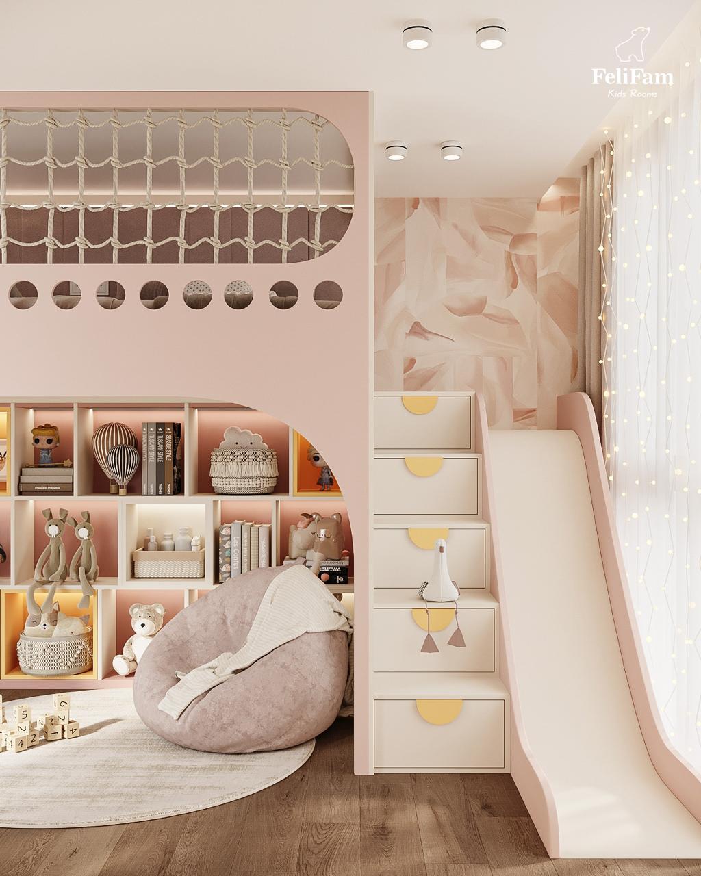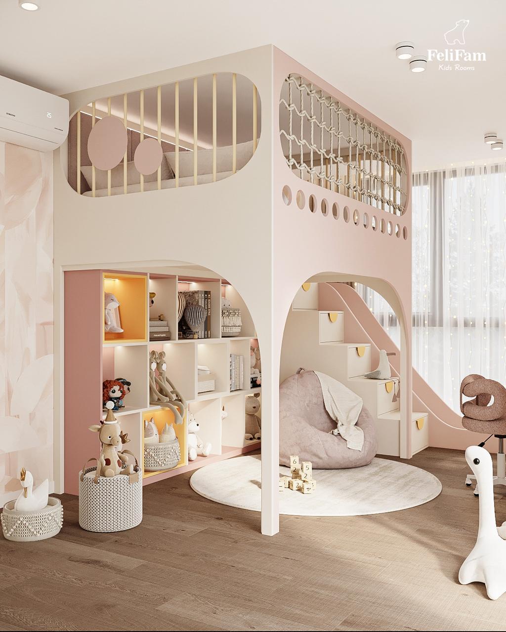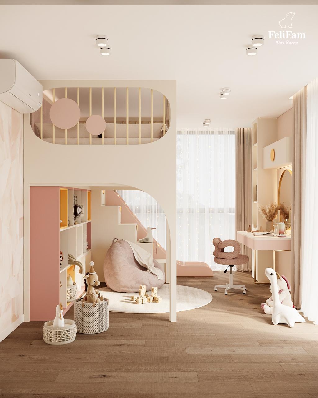 A dream room for a girl: a slide, bunk bed, and relaxation area. This 18 sq.m room for a girl combines play elements and functionality. The bunk bed offers comfort and space for sleep, while the area below is for relaxation, reading, or spending time with friends. A slide adds fun and active play to the room. The dressing table brings a touch of elegance and allows storage of all personal care items. The space is filled with light, and the thoughtfully arranged zones create the perfect place for development, creativity, and play.