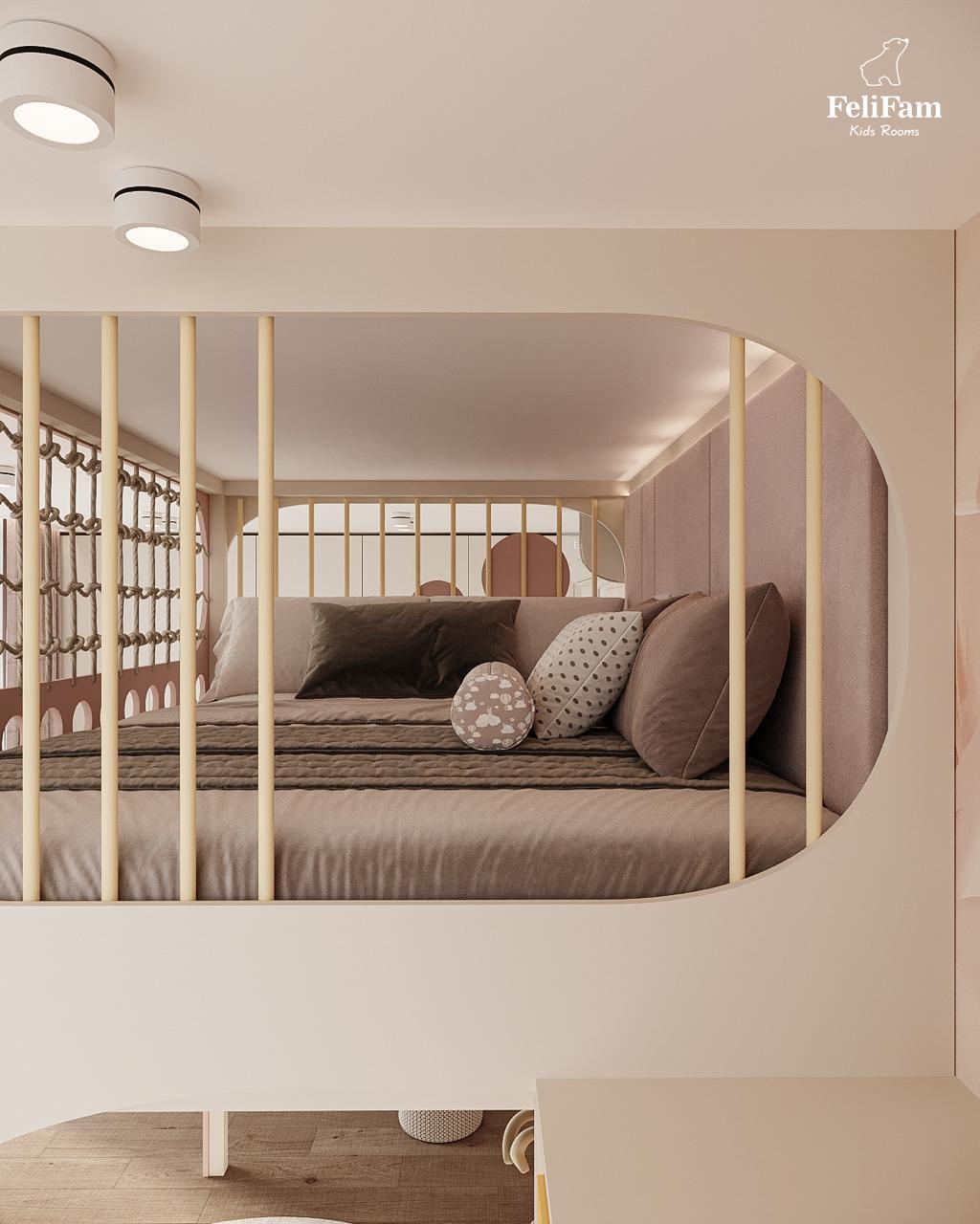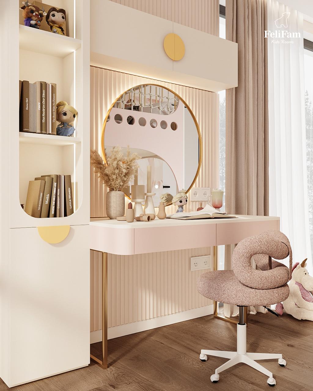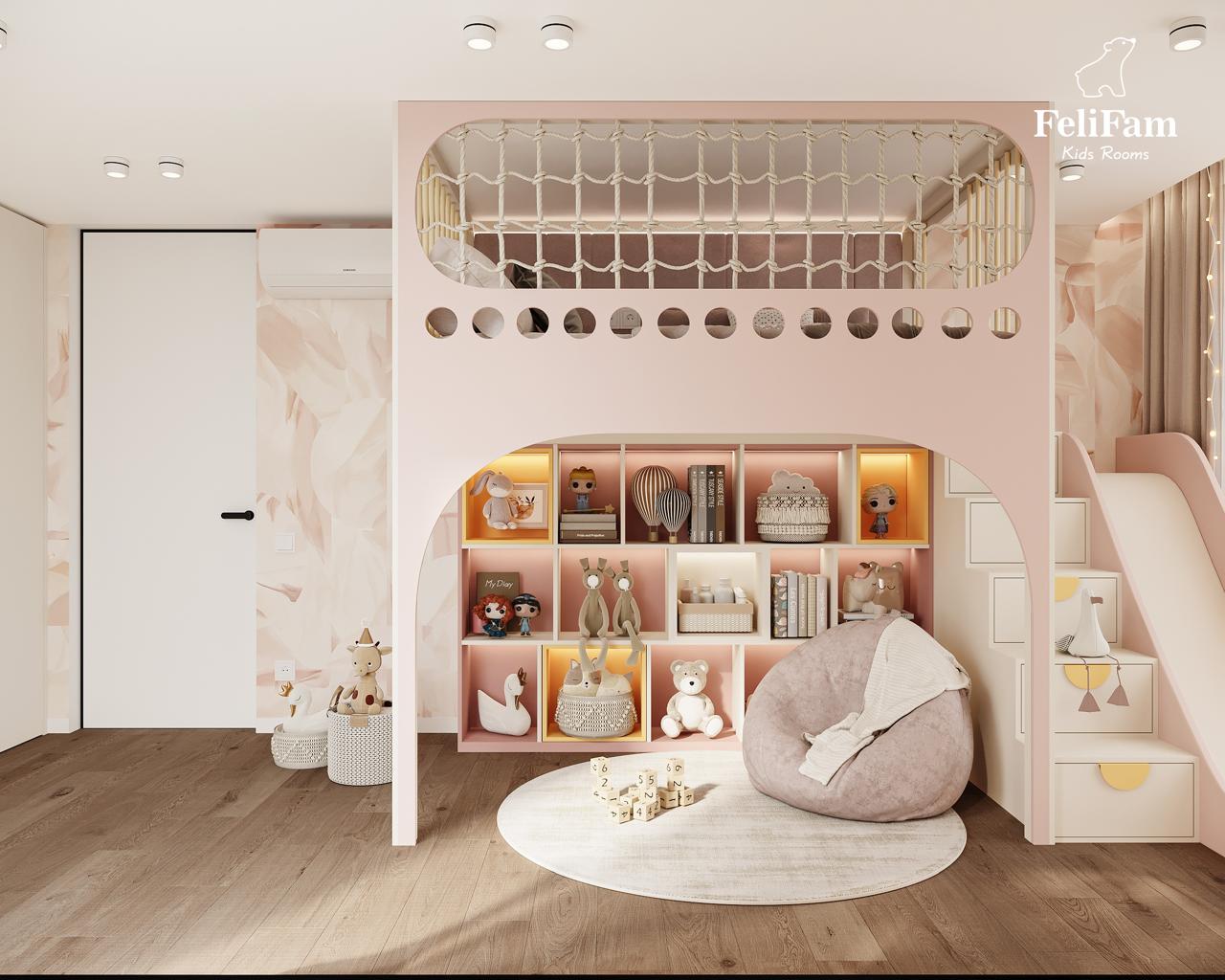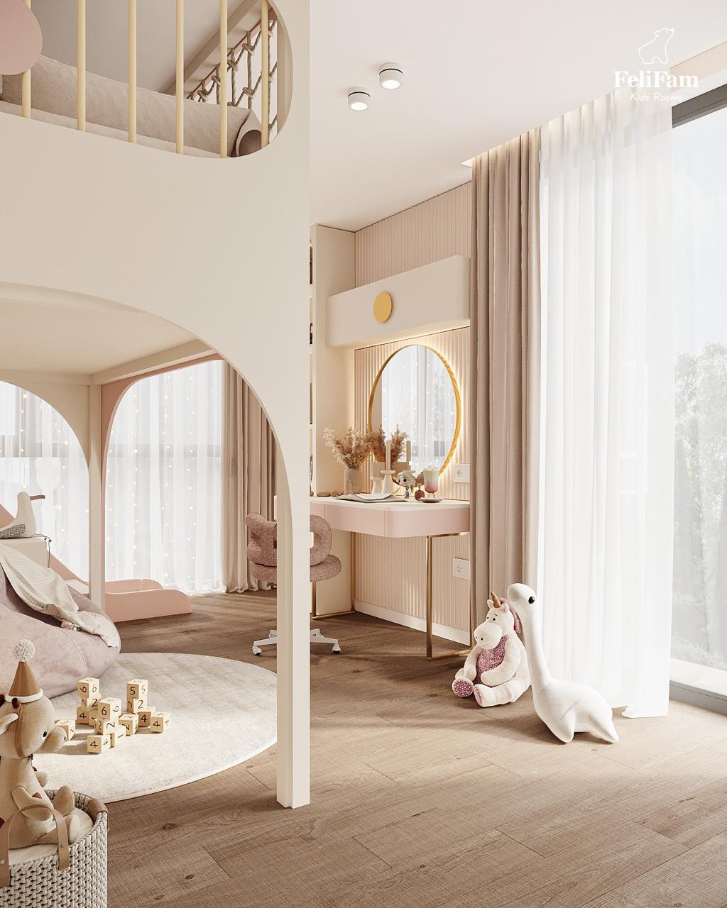 A dream room for a girl: a slide, bunk bed, and relaxation area. This 18 sq.m room for a girl combines play elements and functionality. The bunk bed offers comfort and space for sleep, while the area below is for relaxation, reading, or spending time with friends. A slide adds fun and active play to the room. The dressing table brings a touch of elegance and allows storage of all personal care items. The space is filled with light, and the thoughtfully arranged zones create the perfect place for development, creativity, and play.