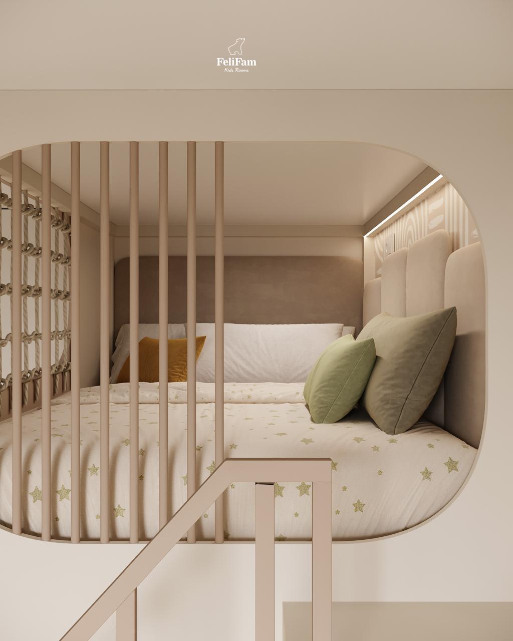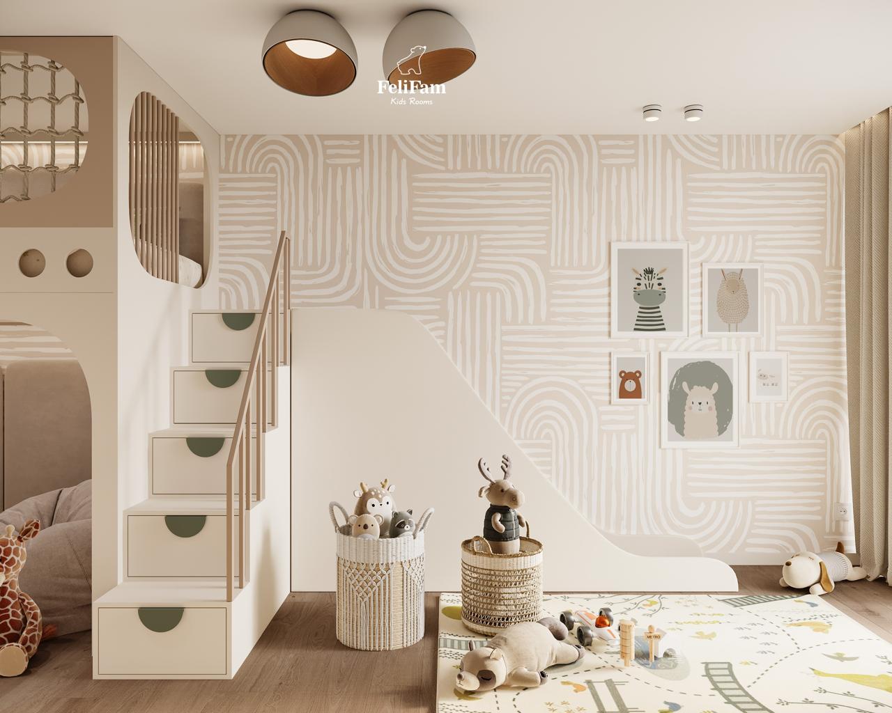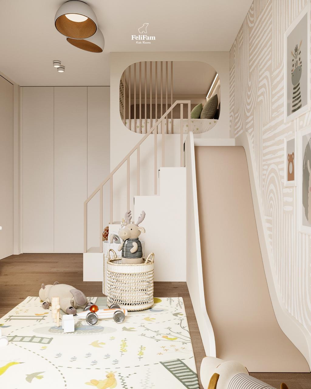 An exciting space for a boy: a room with a slide for active games and relaxation. This boy’s room is full of energy and fun thanks to the slide that brings active games right into the heart of the space. Bright colors and comfortable furniture create a harmonious atmosphere for rest and development. The sleeping place is organized so the boy has a cozy corner to sleep, while the surrounding area is for play promoting active development. Thoughtful planning includes storage space helping to maintain order and a work area encouraging creative activities. This is an ideal space for a boy who loves to combine active games and comfortable rest.