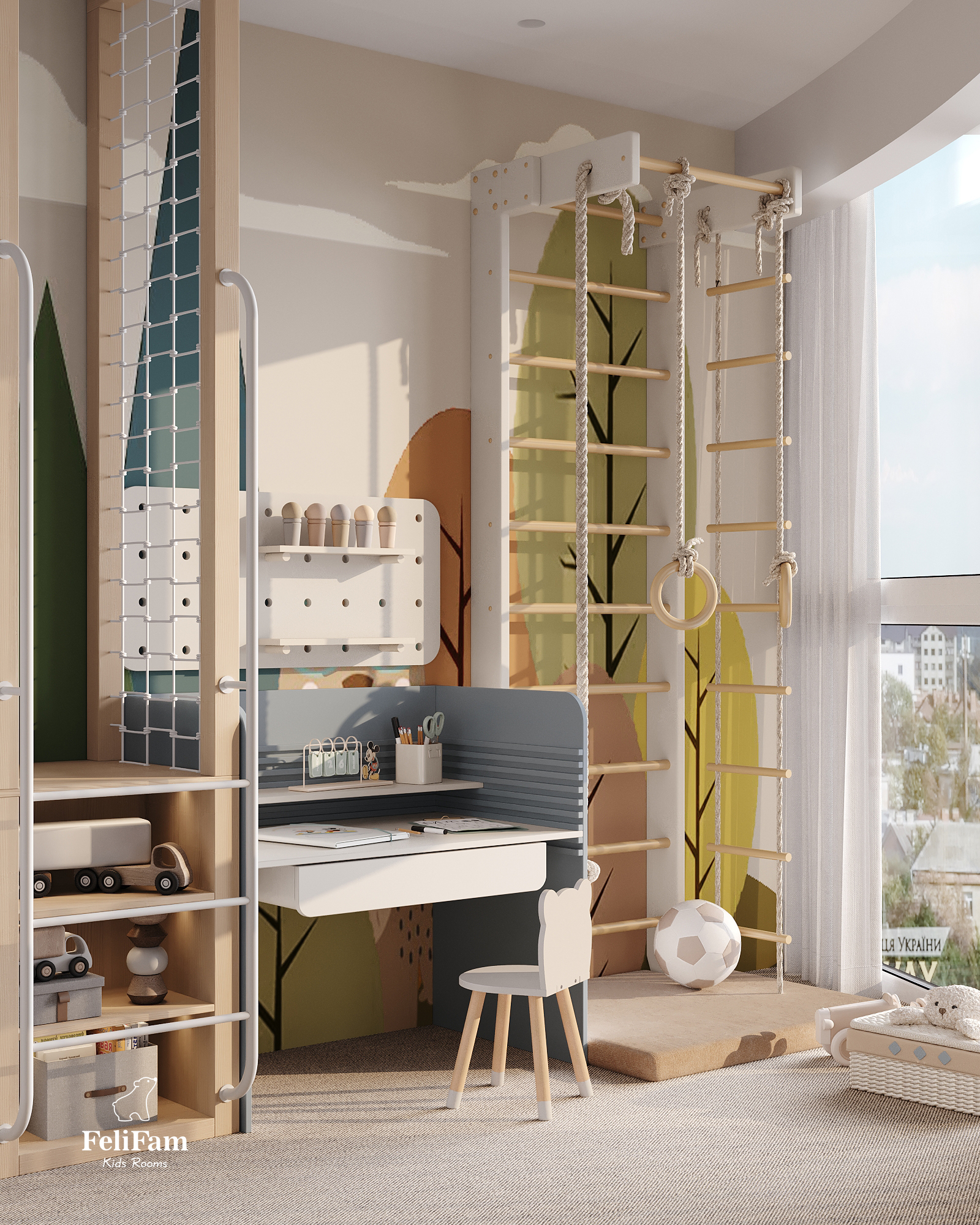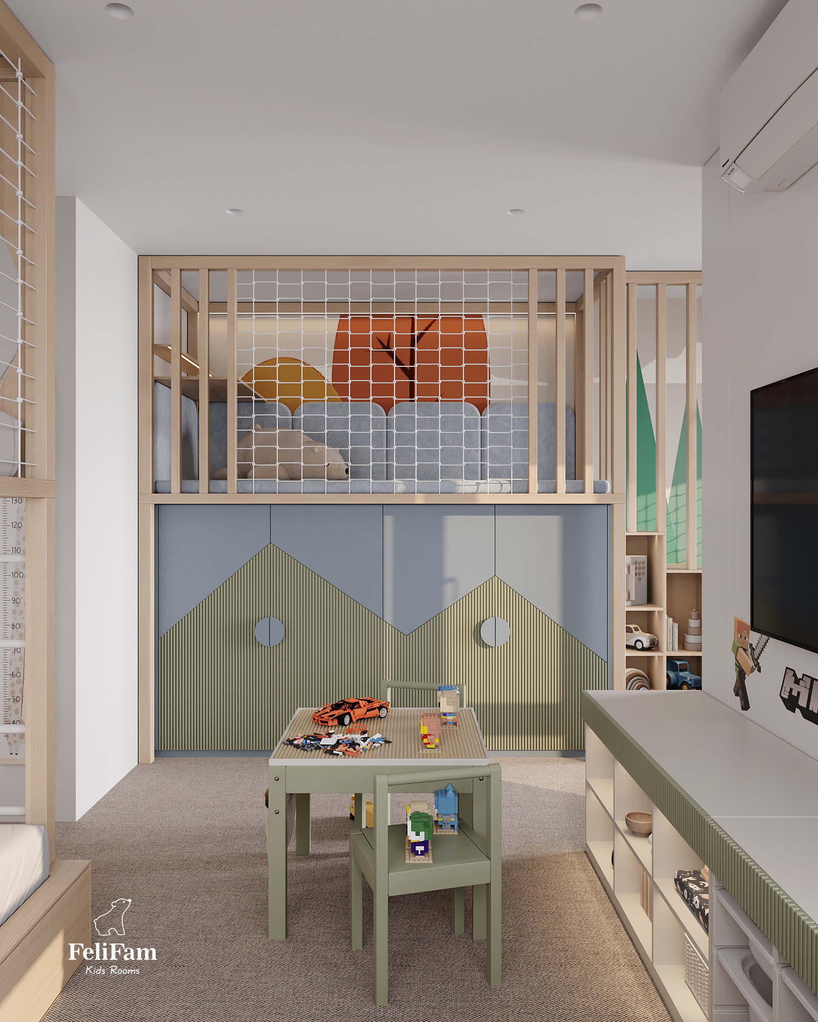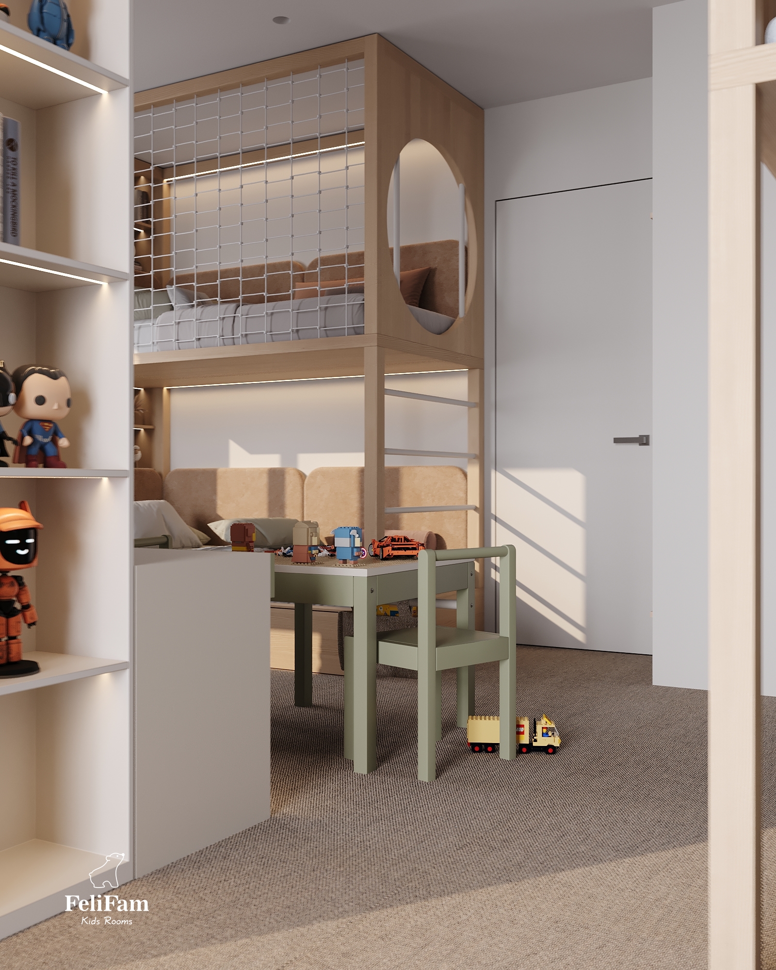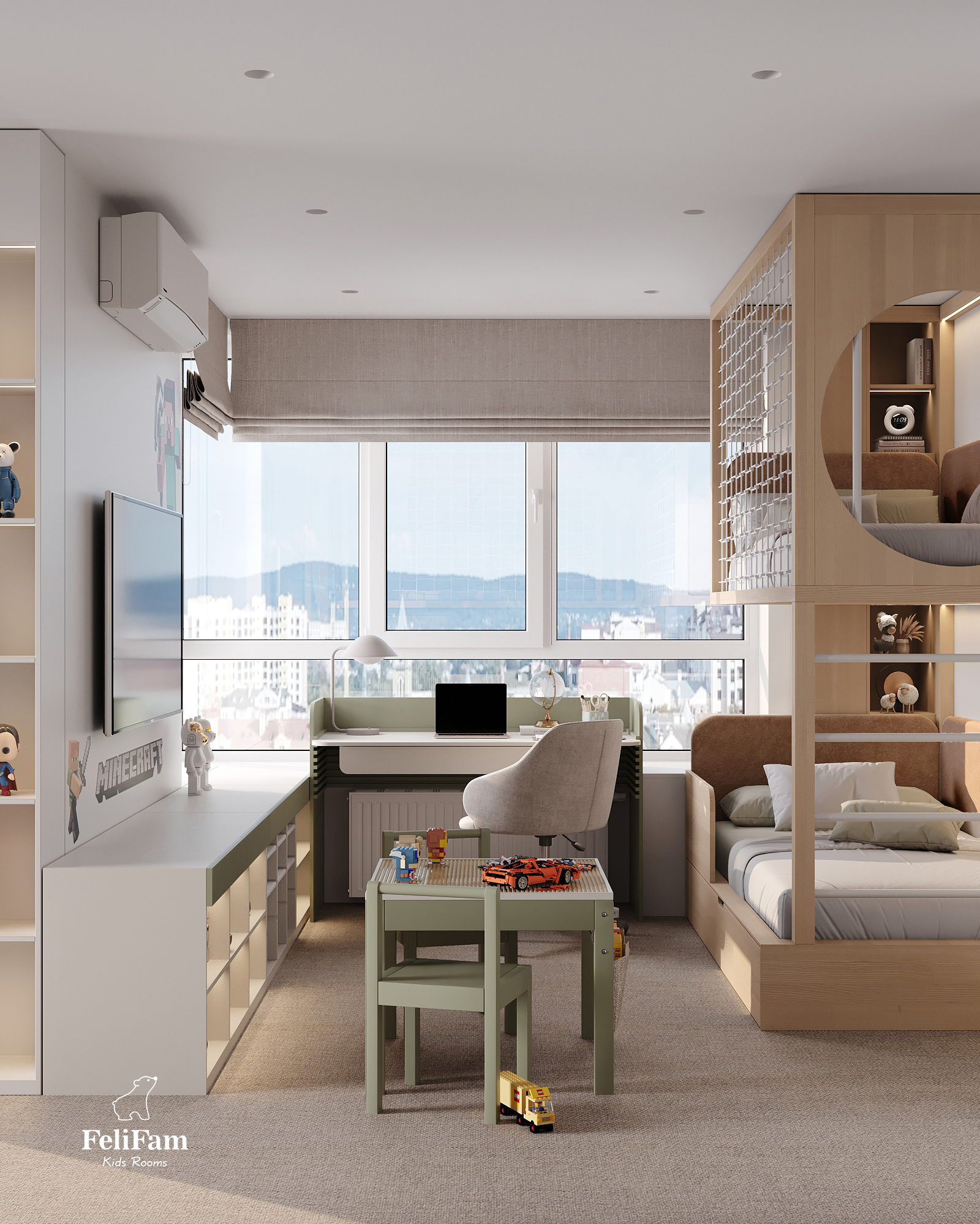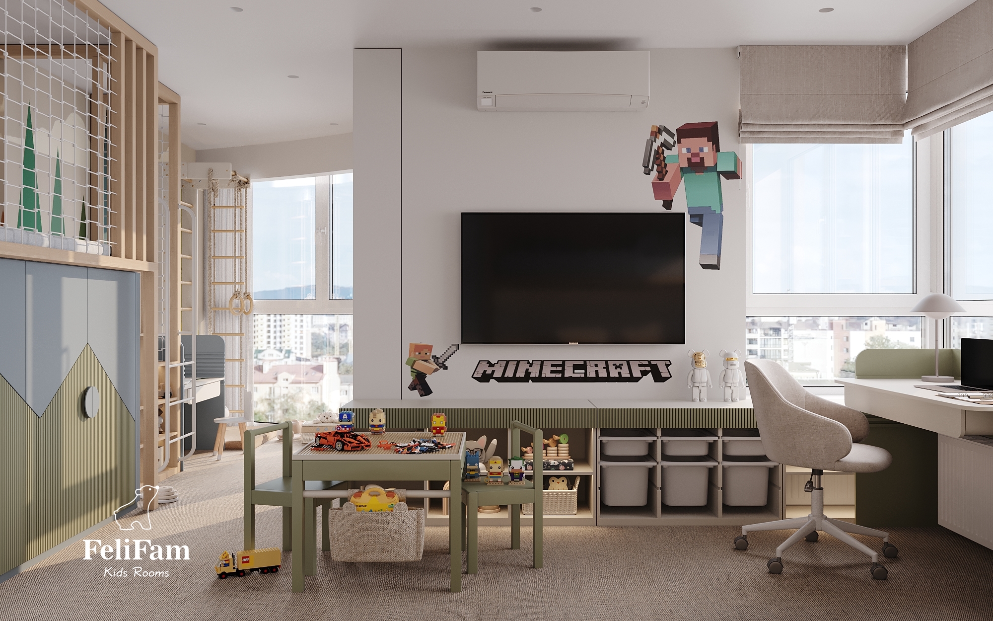 A Minecraft-style room: build, play, dream! This room for two boys is a real pixelated world in reality! The design is inspired by their favorite game where every detail is part of a great adventure. Bright colors, themed elements, and unique decor create an atmosphere inspiring play, imagination, and development. Bunk beds are comfortable and perfectly fit the Minecraft aesthetic. A sports zone and spacious play area allow kids to implement any ideas. This is a space where children don’t just live — they play their own version of Minecraft daily in the real world!