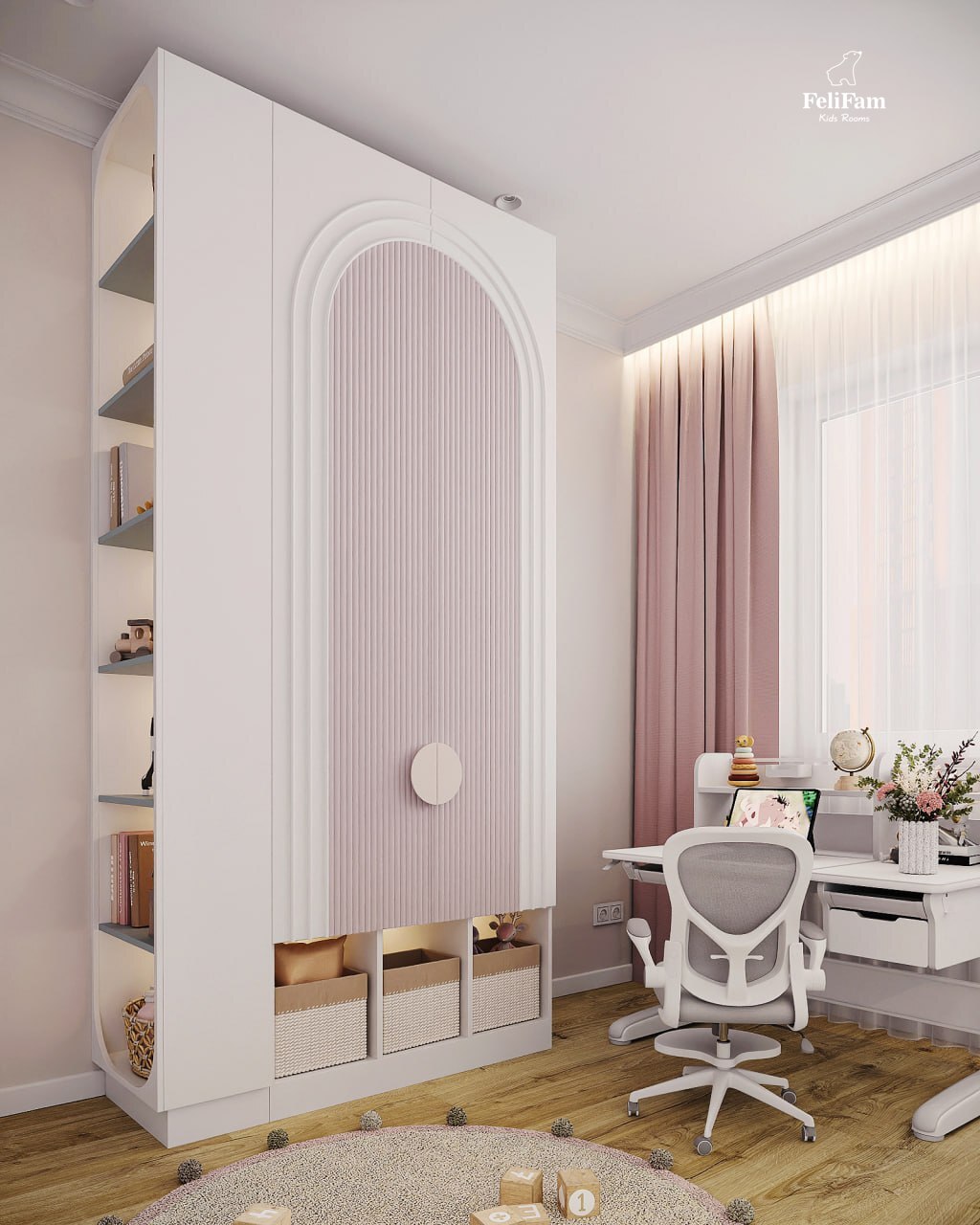 The study area is designed to adapt to changes in the child’s age and needs – from the first drawings to serious studies. Light tones give the room lightness, and carefully selected details make it a place where you want to dream, learn and relax.
