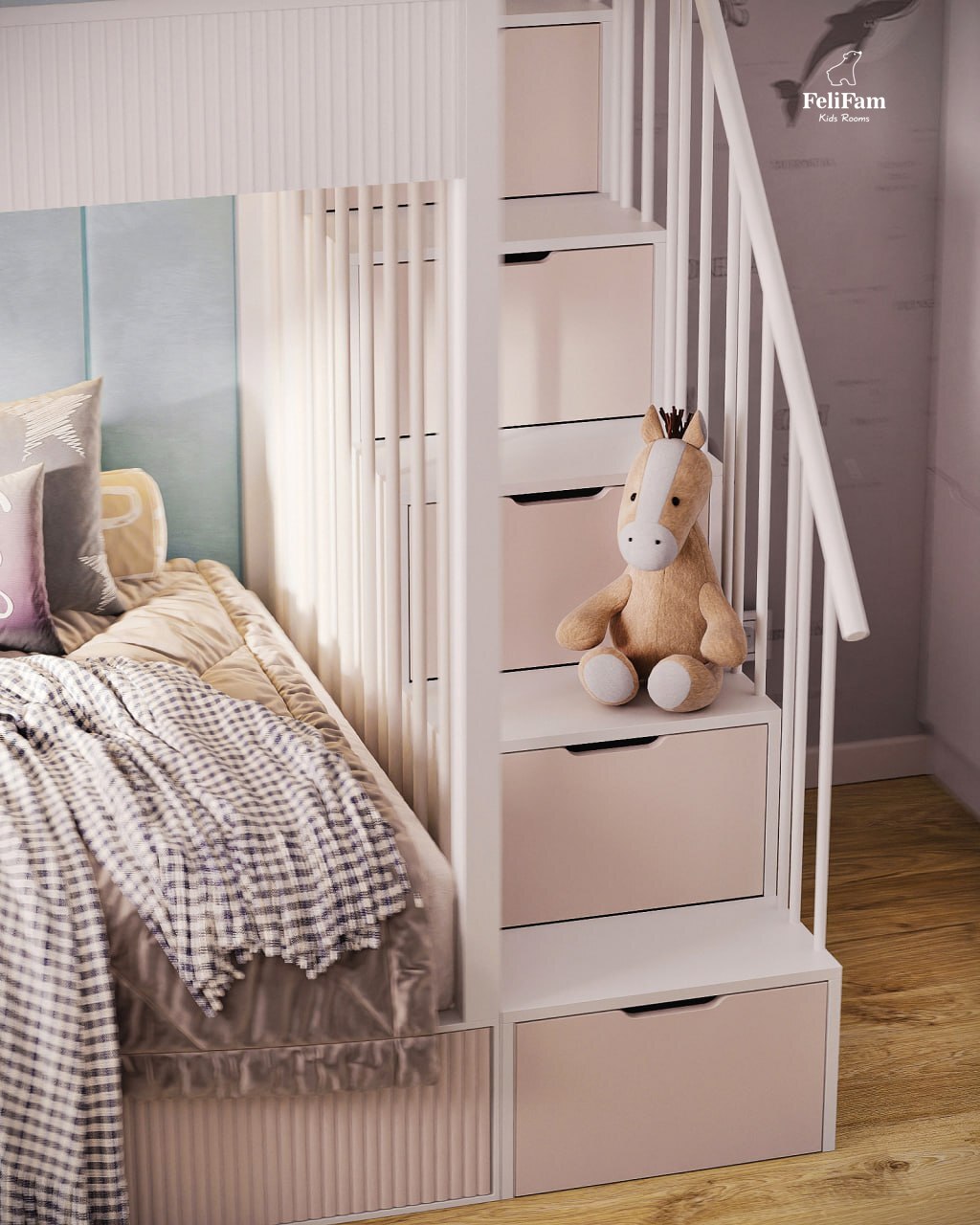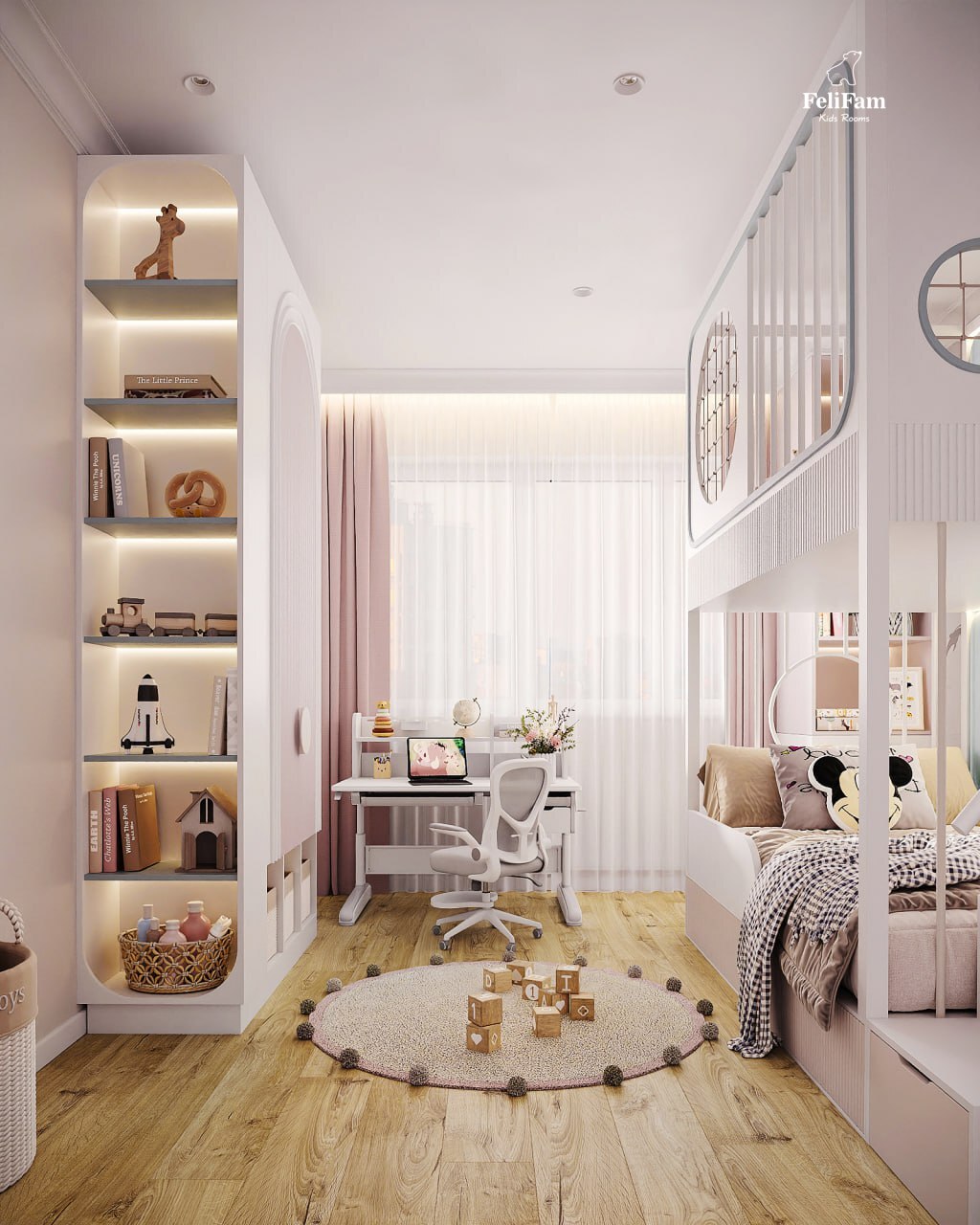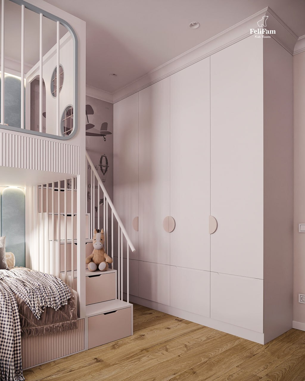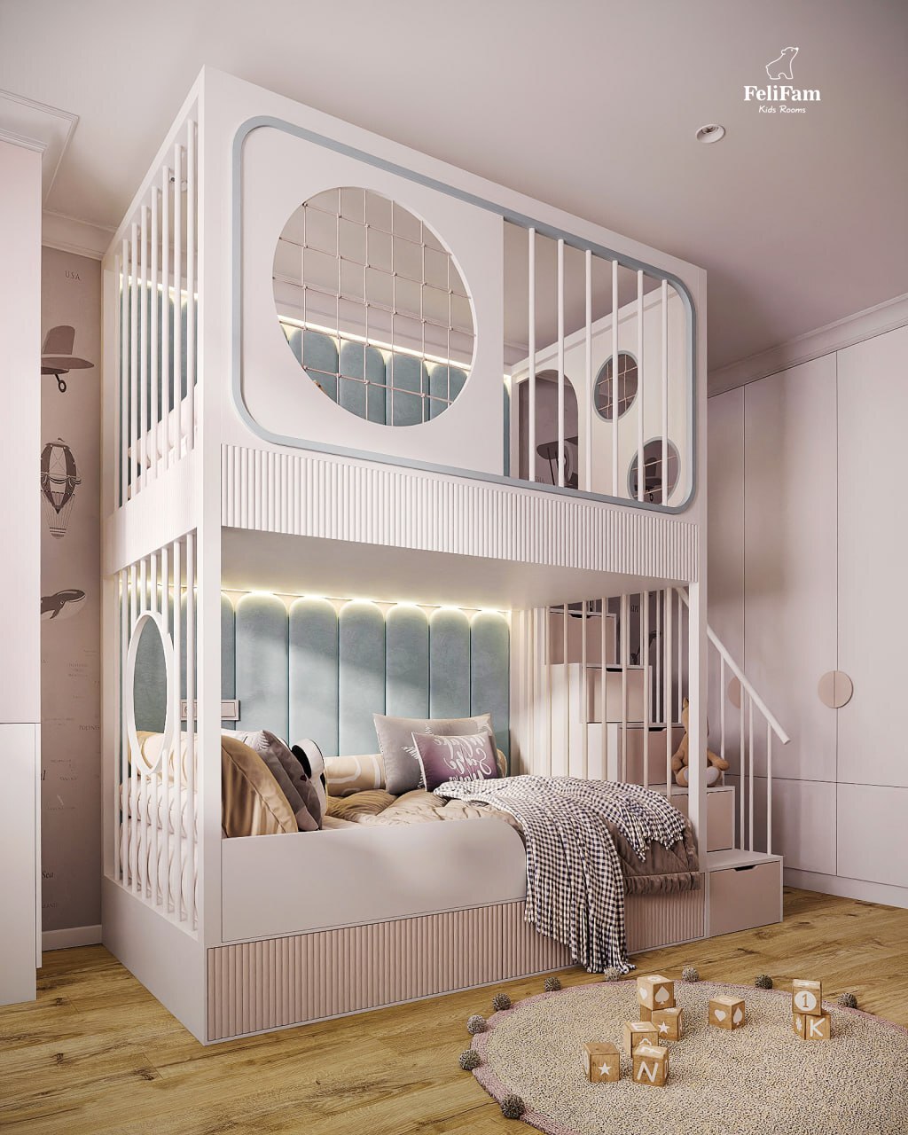 This interior is designed to grow with the child. A two-story bed with soft panels gives comfort and a sense of security, and a large wardrobe provides enough space to store all things.