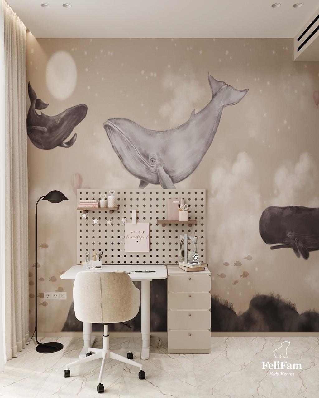The interior is decorated in natural shades that give peace and warmth, and the accent wall gives the room character and visual depth. This is a space that grows with the child, supporting its development and daily discoveries.