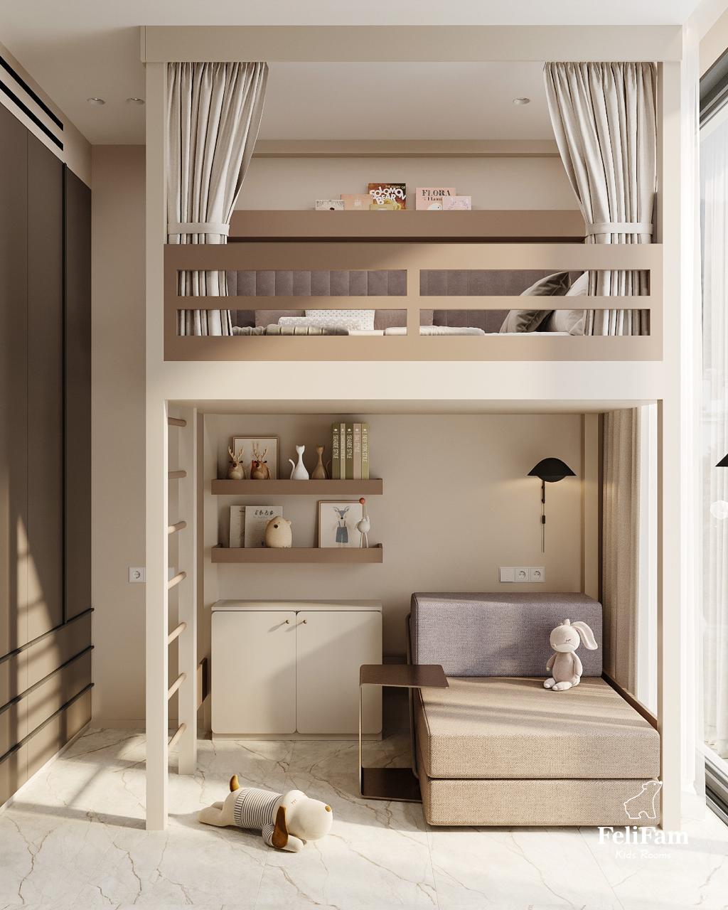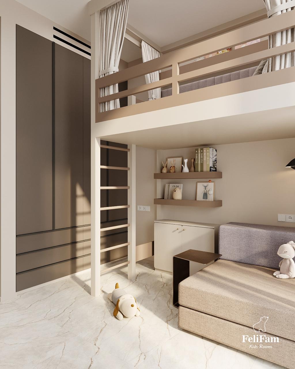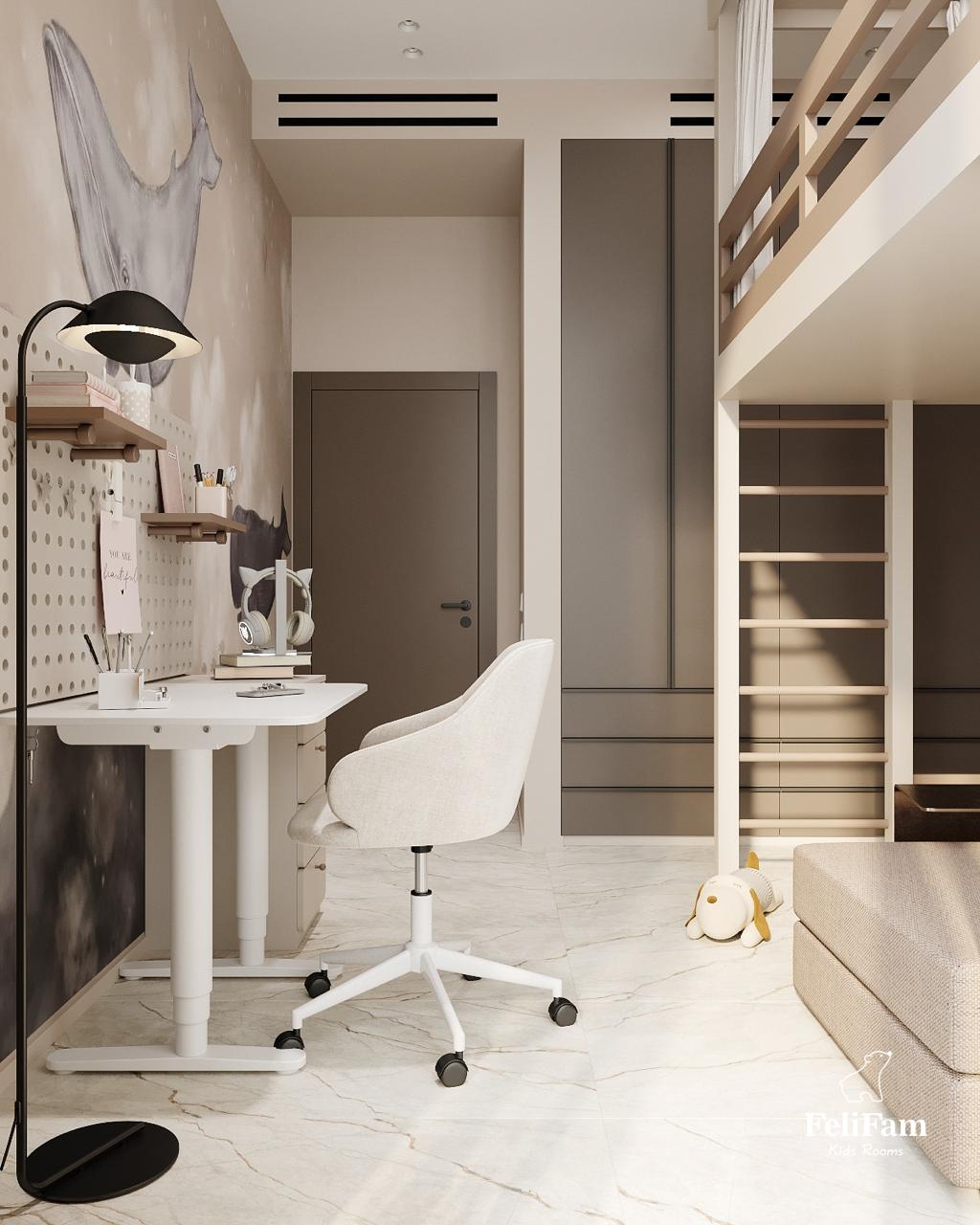 Despite the compact area, this room embodies maximum functionality and love for natural aesthetics. The two-story structure successfully zoned the space: on the first level there is a zone for studying and playing, and on the second – a cozy sleeping place, which adds a feeling of your own corner.