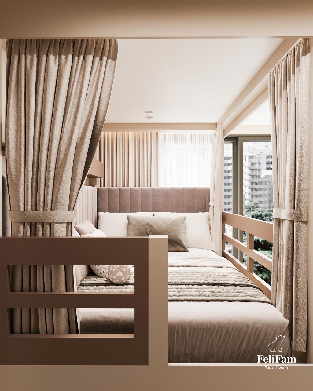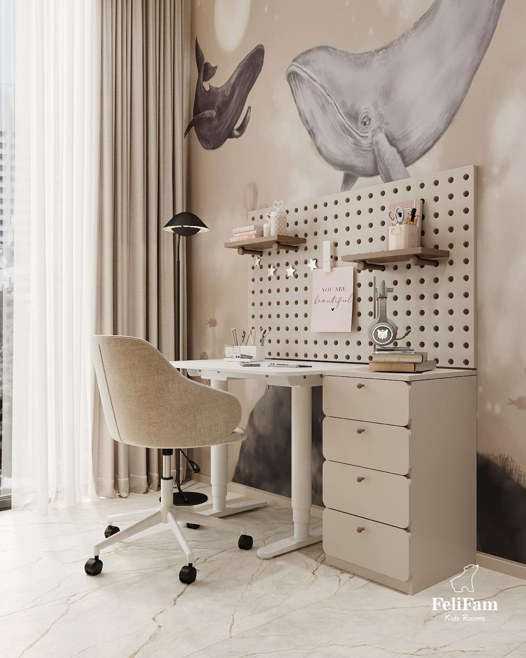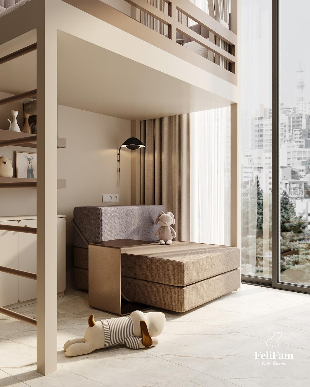 Despite the compact area, this room embodies maximum functionality and love for natural aesthetics. The two-story structure successfully zoned the space: on the first level there is a zone for studying and playing, and on the second – a cozy sleeping place, which adds a feeling of your own corner.