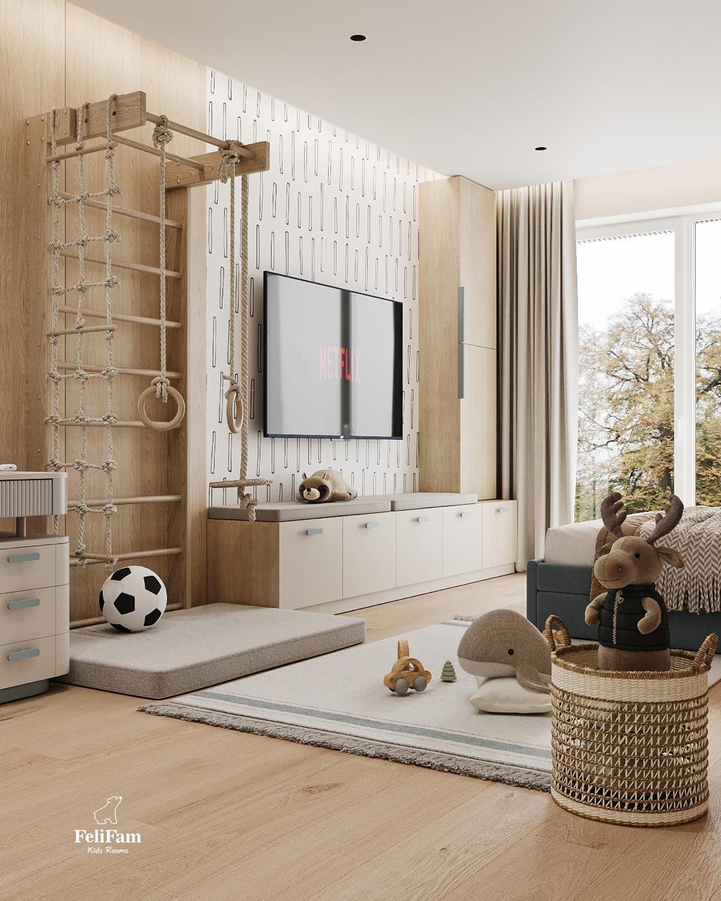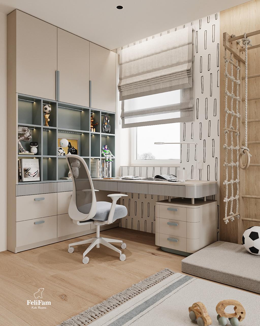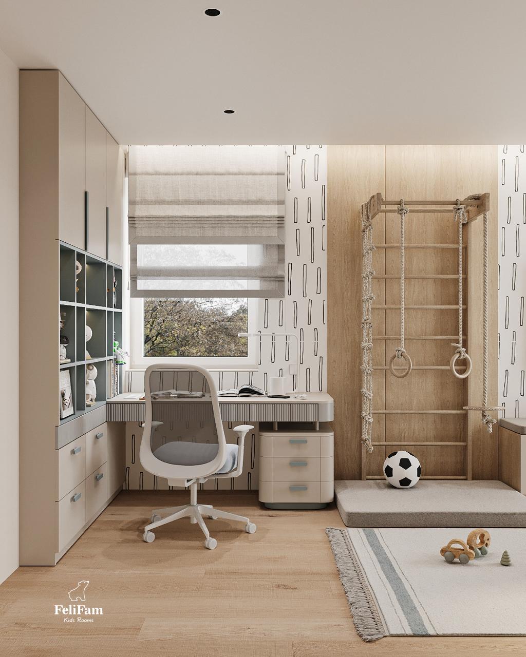 Boy’s Room – A Bright Space for Energy, Growth, and Rest — This interior is designed with the needs of an active child in mind: a spacious bed ensures restful sleep, while a physical activity zone encourages daily movement. A wardrobe with an integrated bed niche maximizes space without losing style. Light colors bring a sense of calm, freedom, and space to grow.