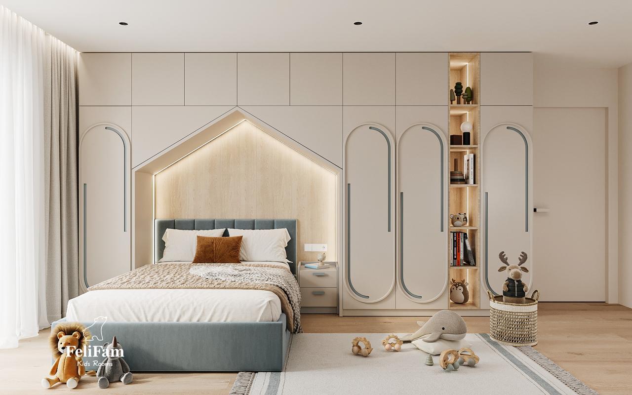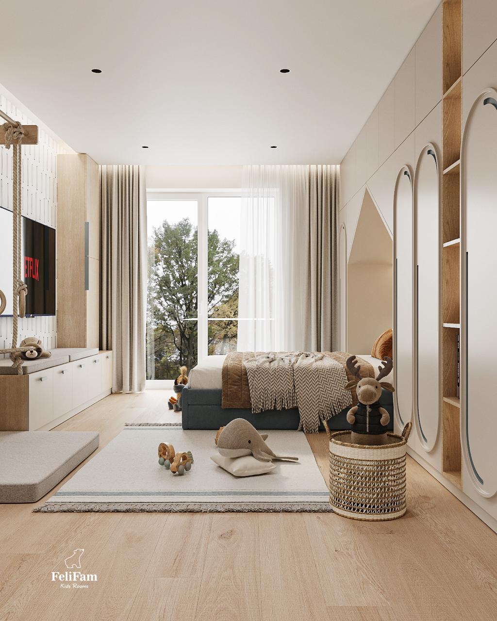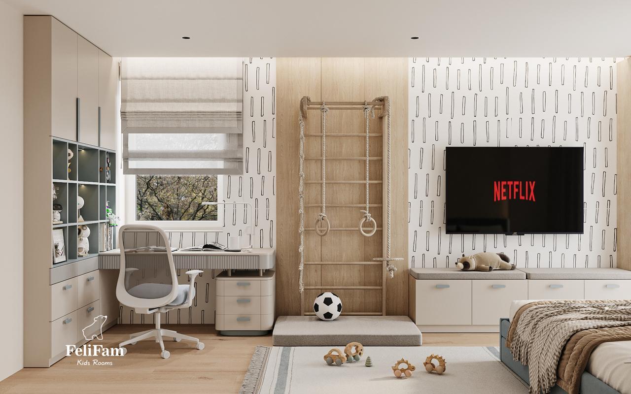 Boy’s Room – A Bright Space for Energy, Growth, and Rest — This interior is designed with the needs of an active child in mind: a spacious bed ensures restful sleep, while a physical activity zone encourages daily movement. A wardrobe with an integrated bed niche maximizes space without losing style. Light colors bring a sense of calm, freedom, and space to grow.