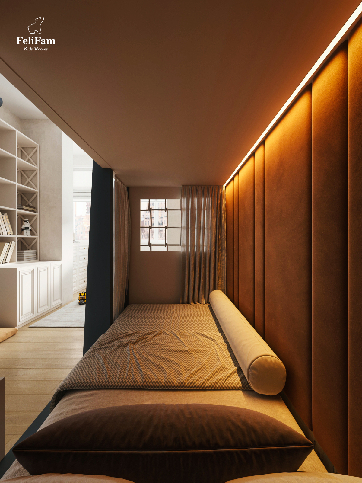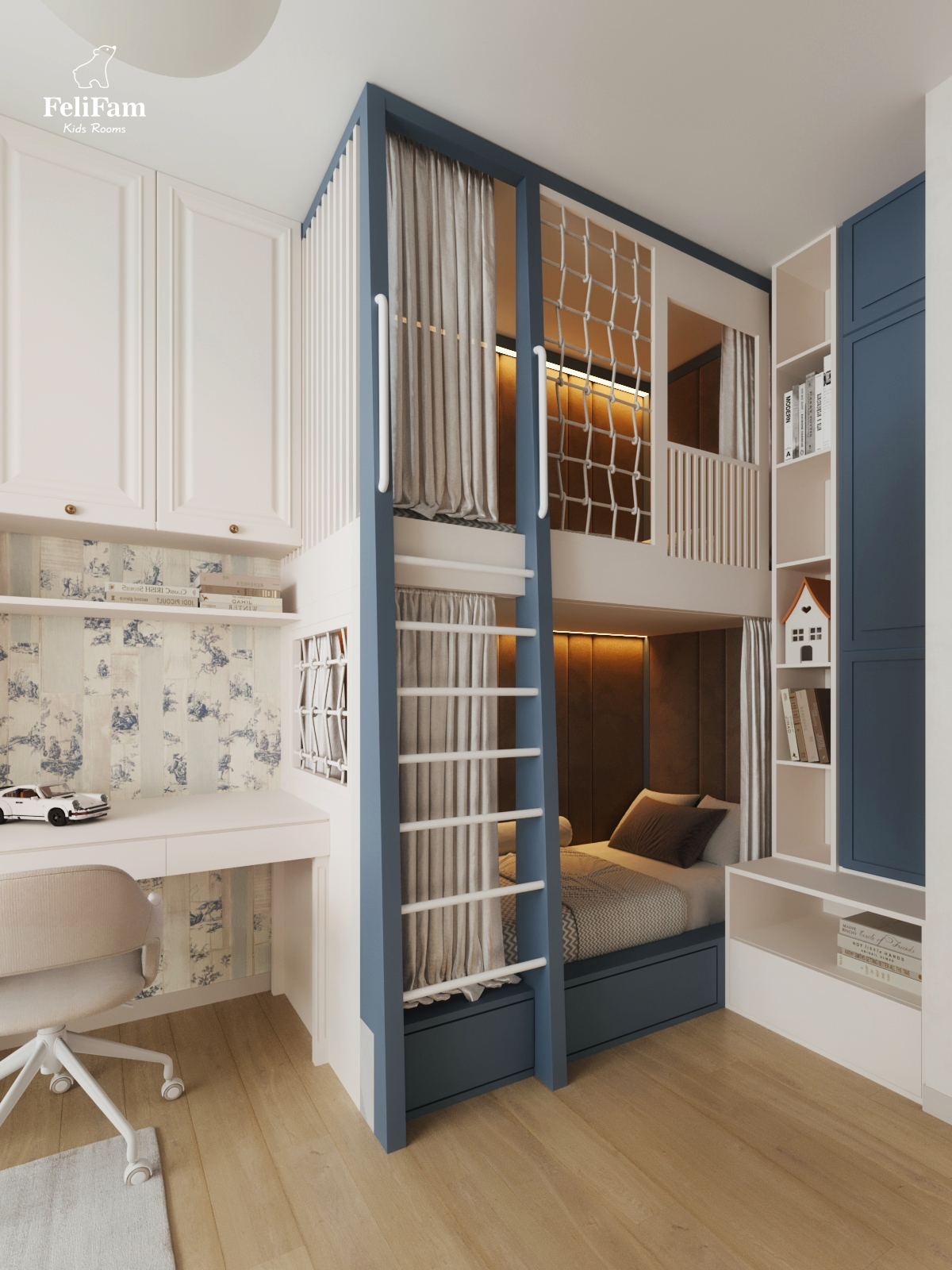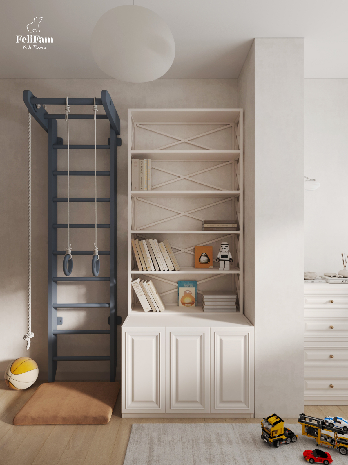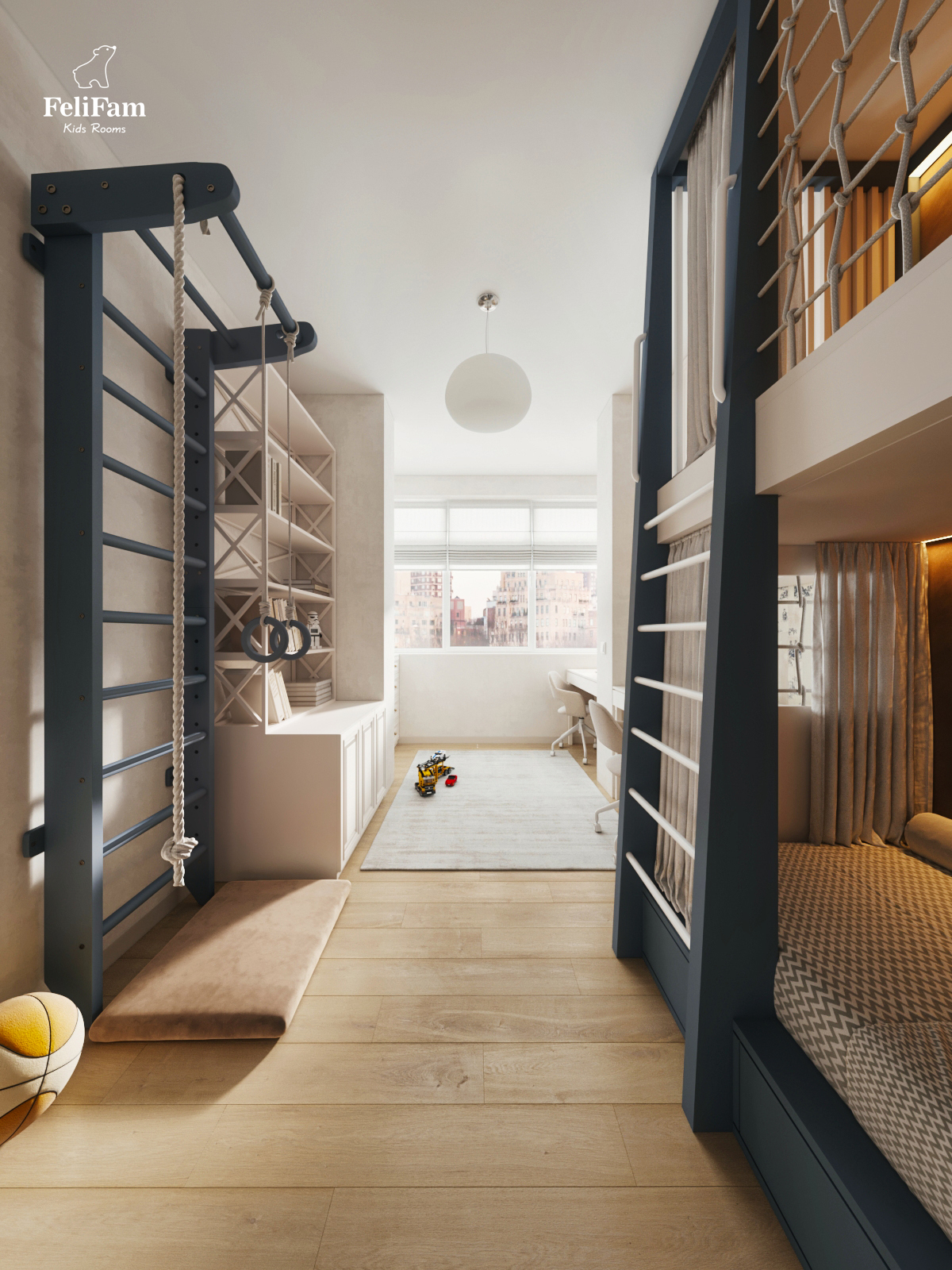 Though small in size, this room is big on possibilities, fitting everything needed for a joyful childhood. A bunk bed saves space, making room for a physical activity area where the boys can stay active and burn energy even indoors.