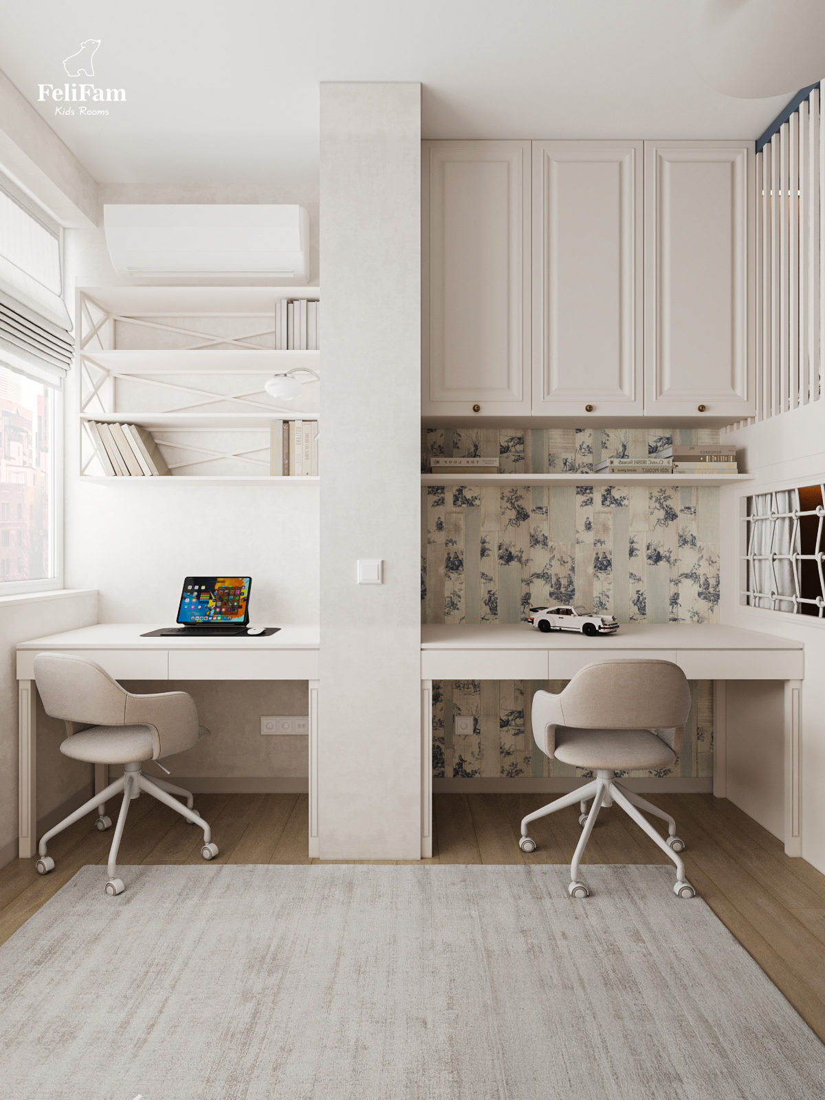 Separate workstations let each child study and create in their own rhythm. A calm color palette creates a harmonious vibe, while bright accents bring character and dynamism. An ideal space where brothers can feel at home.
