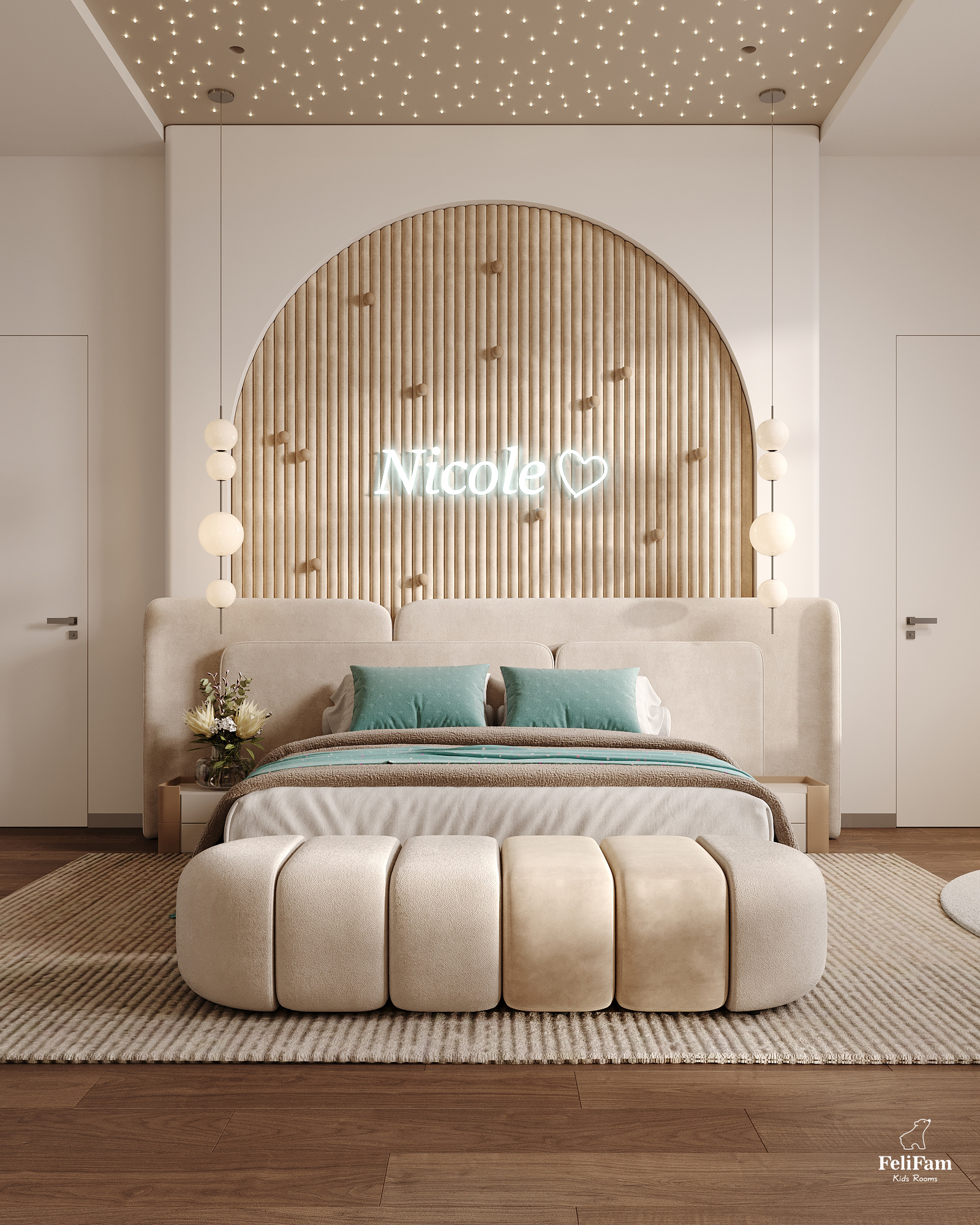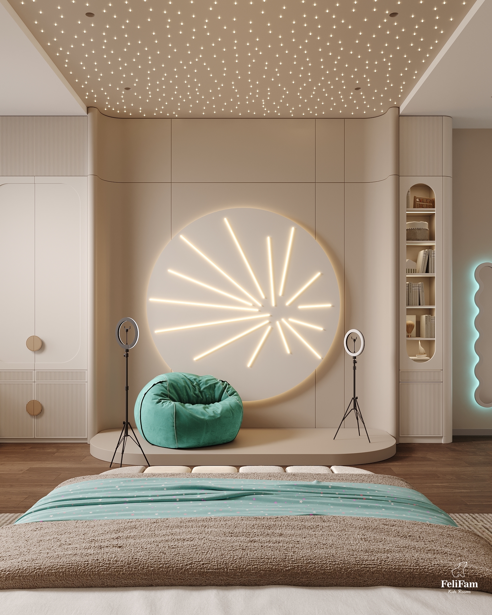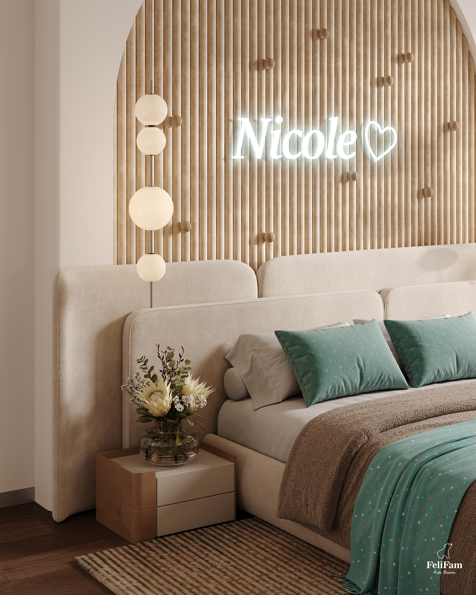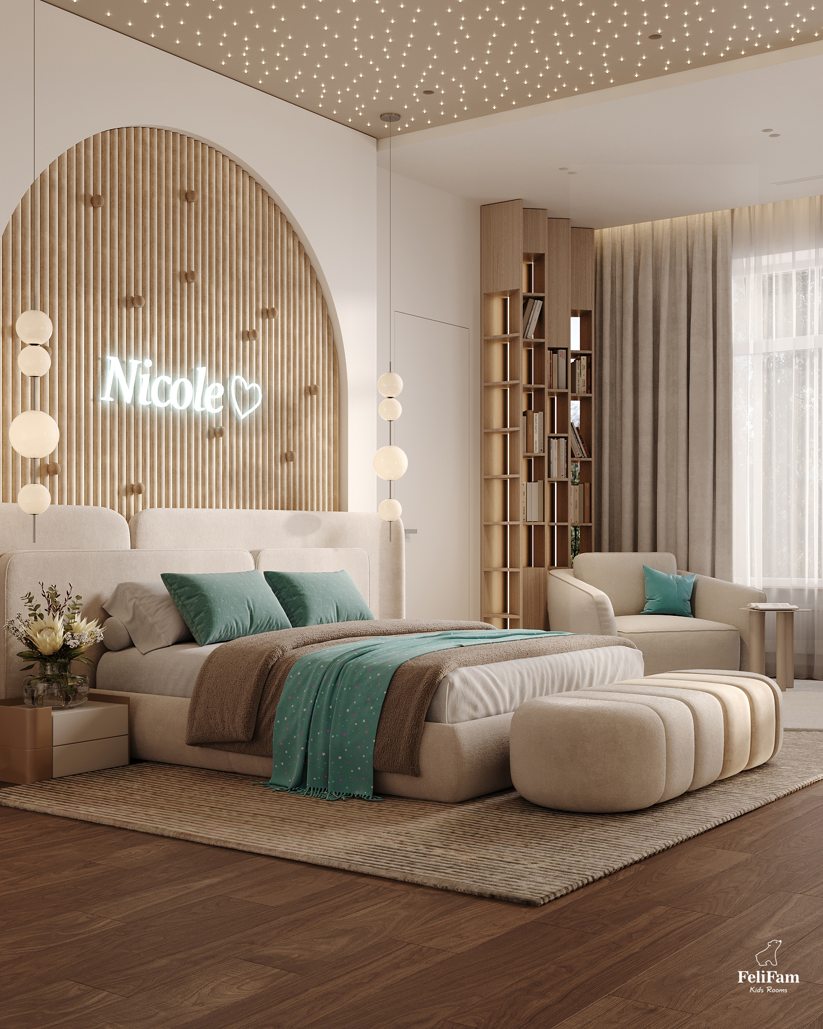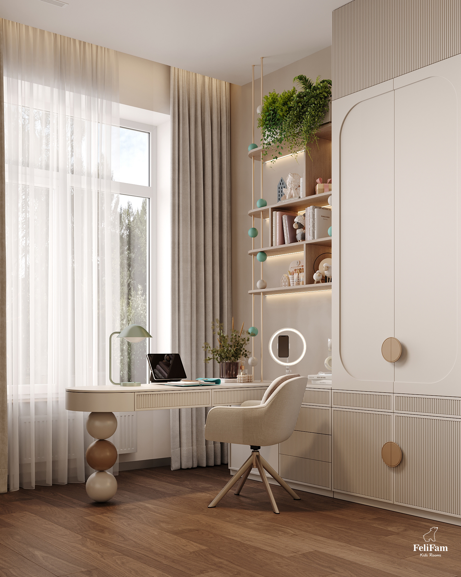 This space embodies a balance of aesthetics, functionality, and genuine care for the child’s needs. Warm sandy tones combined with soft mint create a calming, inspiring environment — perfect for creativity, learning, and relaxation.
