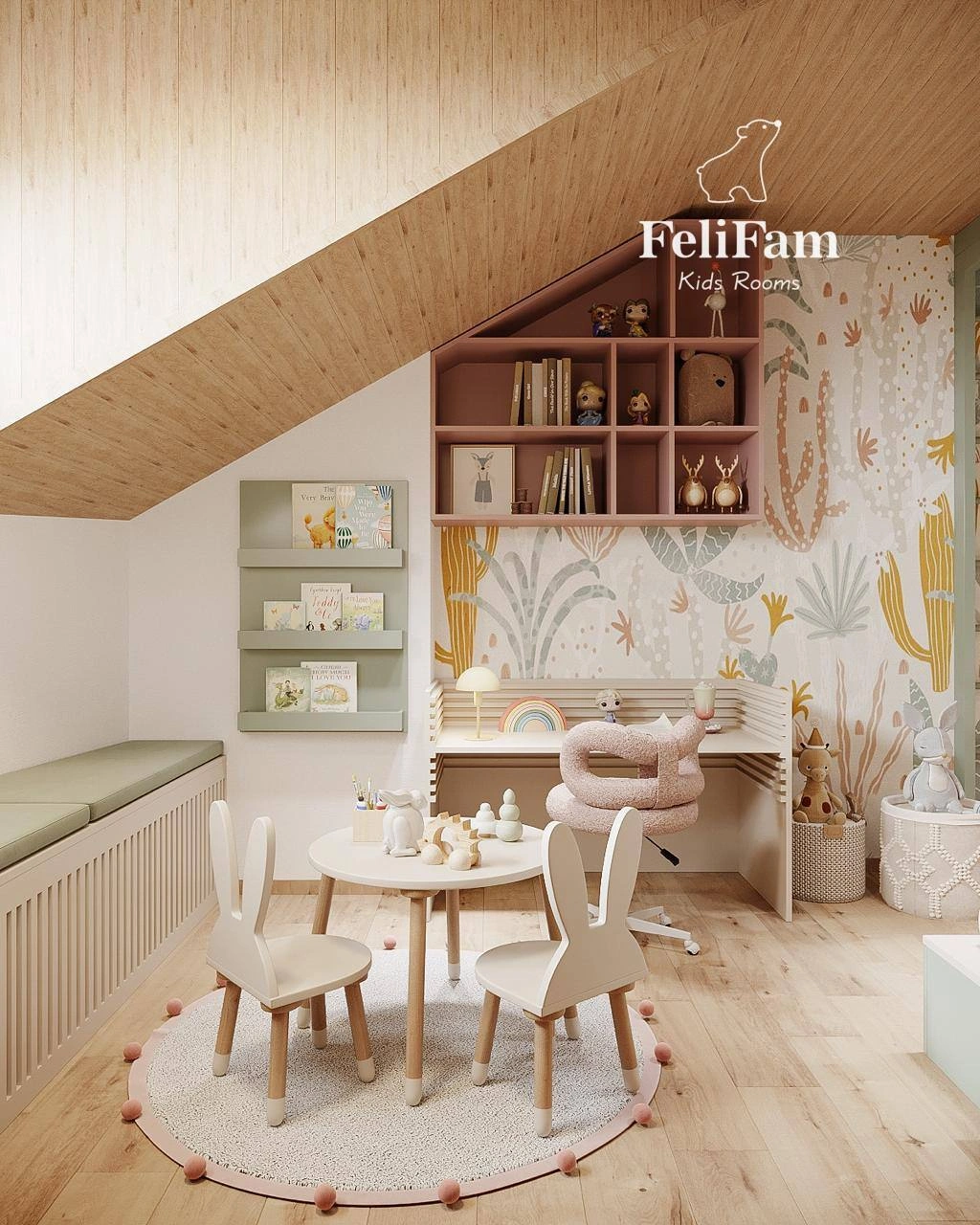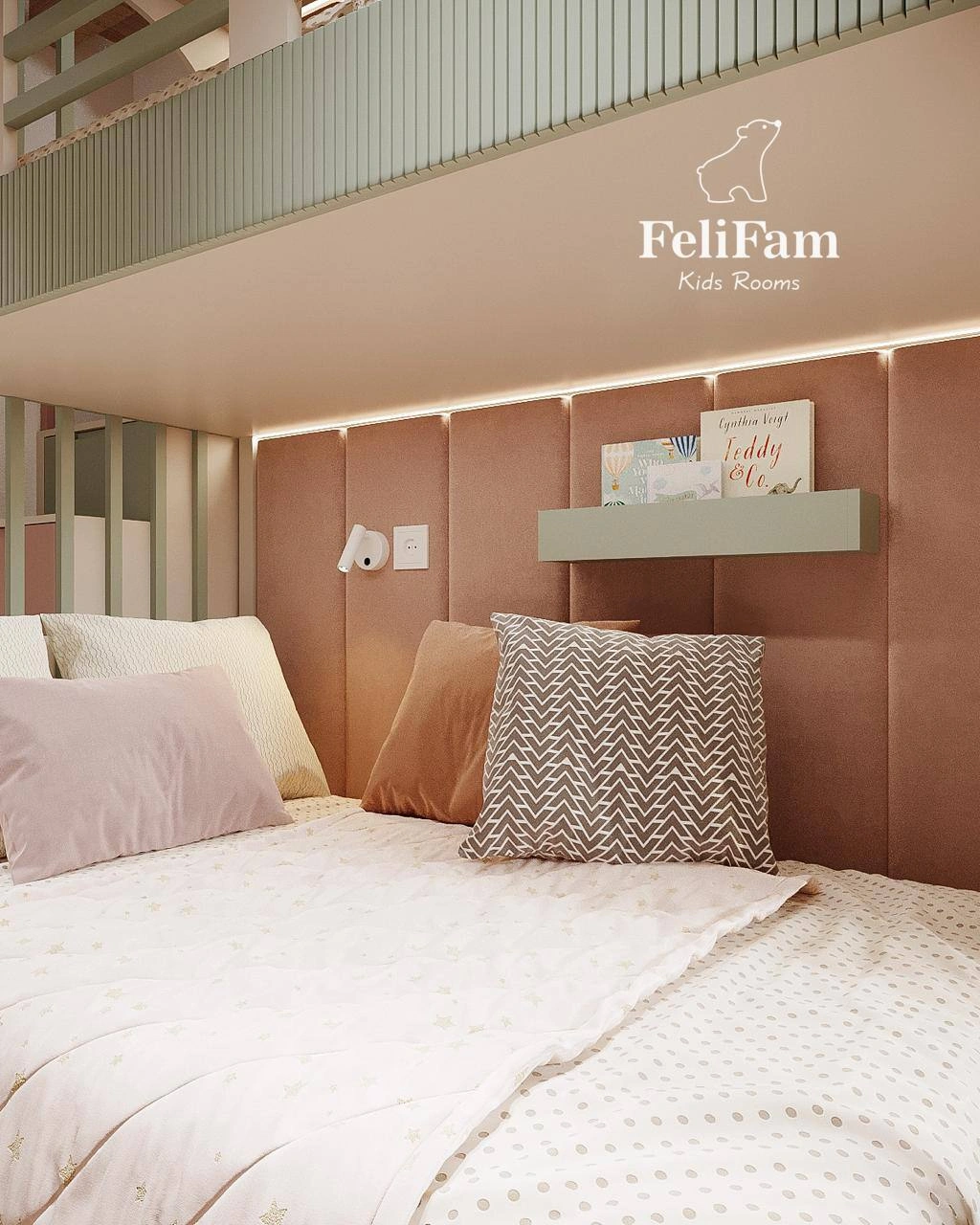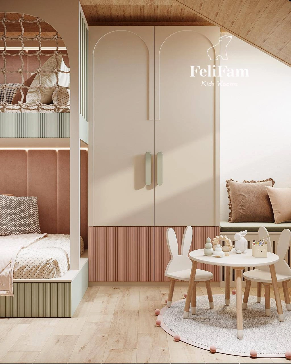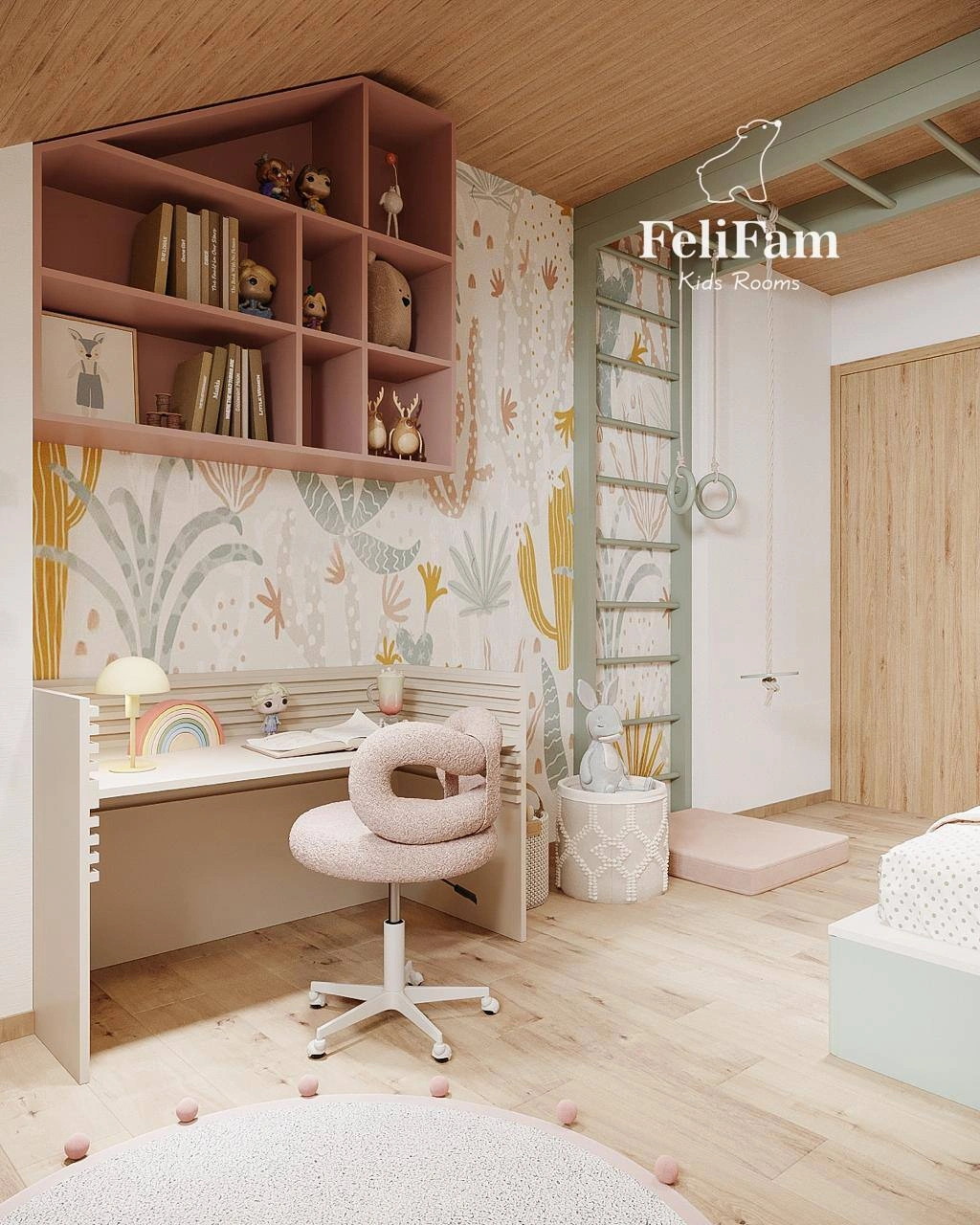 The design of a children’s room for a girl with an area of 14 m² combines aesthetics and practicality. Delicate shades of pink and olive create a calm and cozy mood, ideal for the child’s daily life.