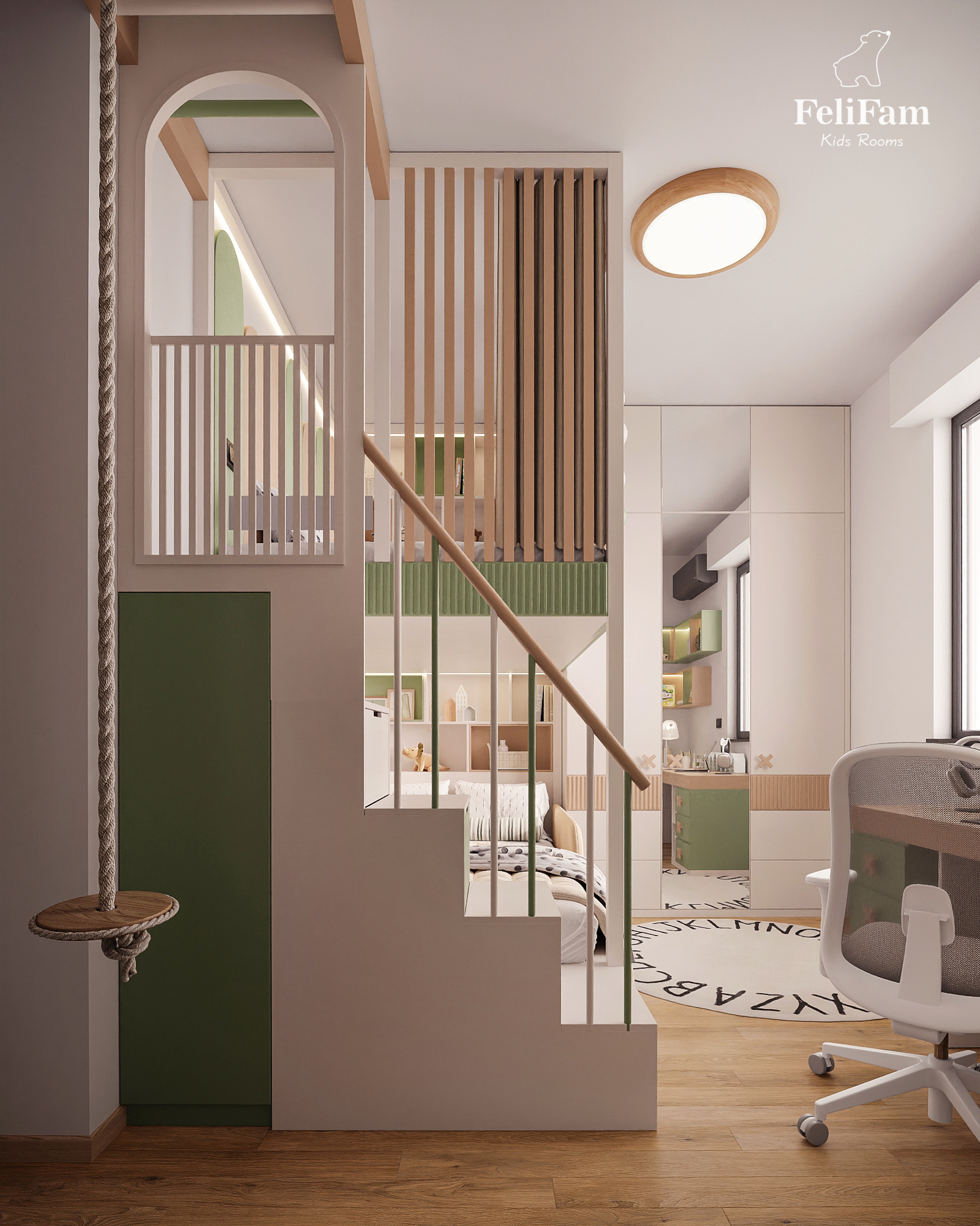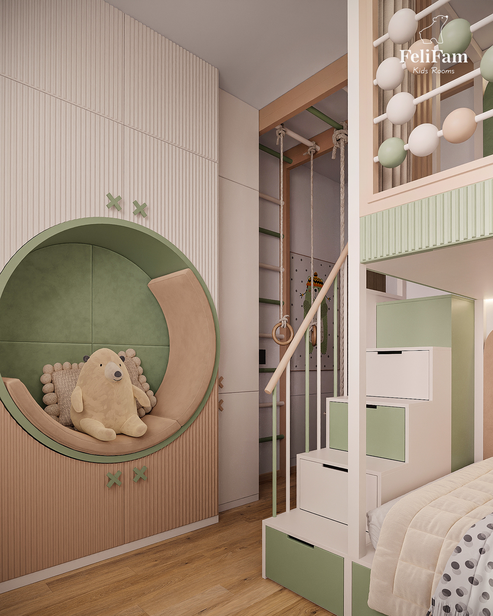 The accent on the green color harmoniously complements the calm palette of the interior. The original wardrobe with a built-in niche for reading or relaxation makes the space more individual and functional.
