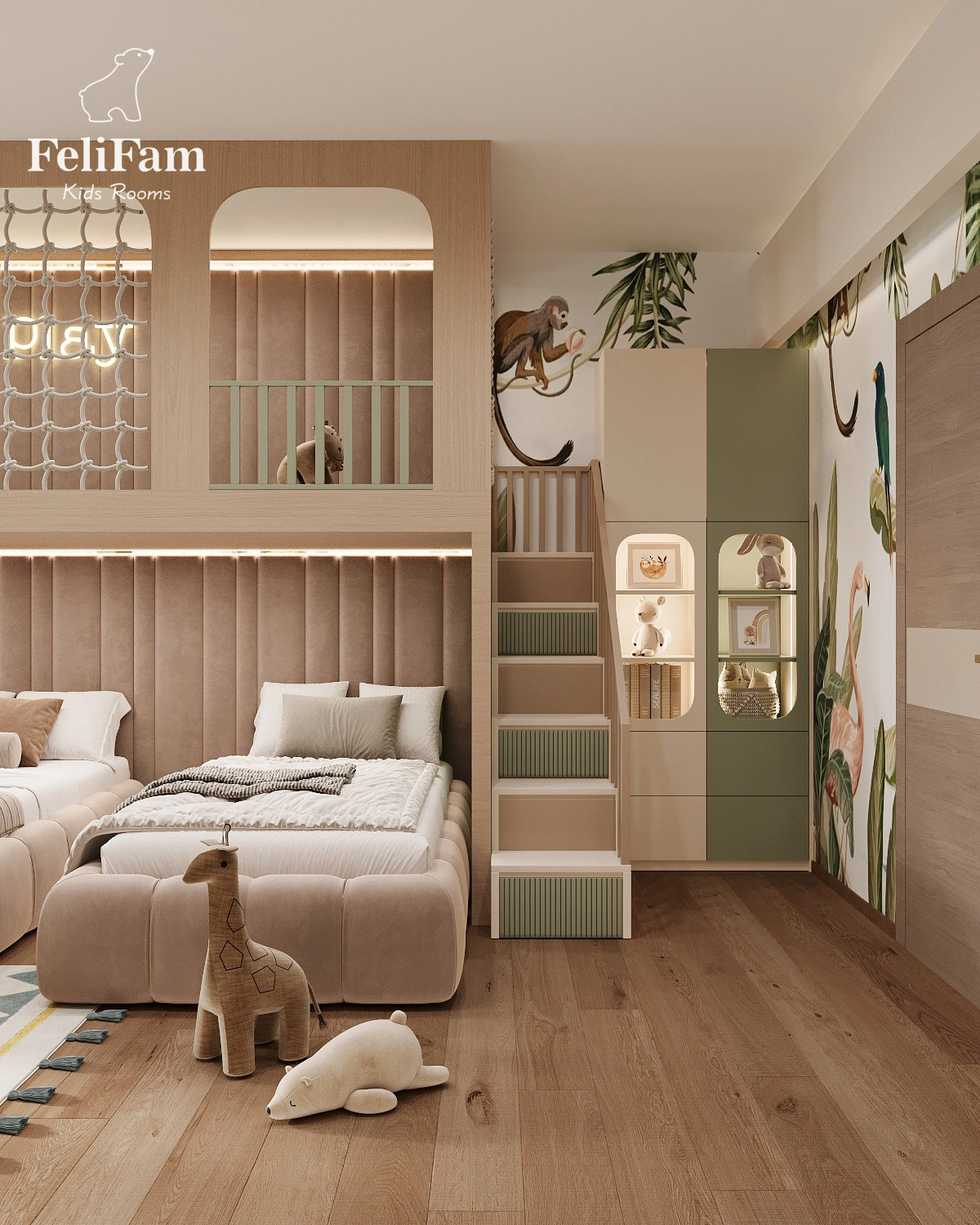 The upper level of the room is occupied by a structure for games and fantasies. The jungle theme enlivens the space, while the interior remains neutral and relevant for the future.