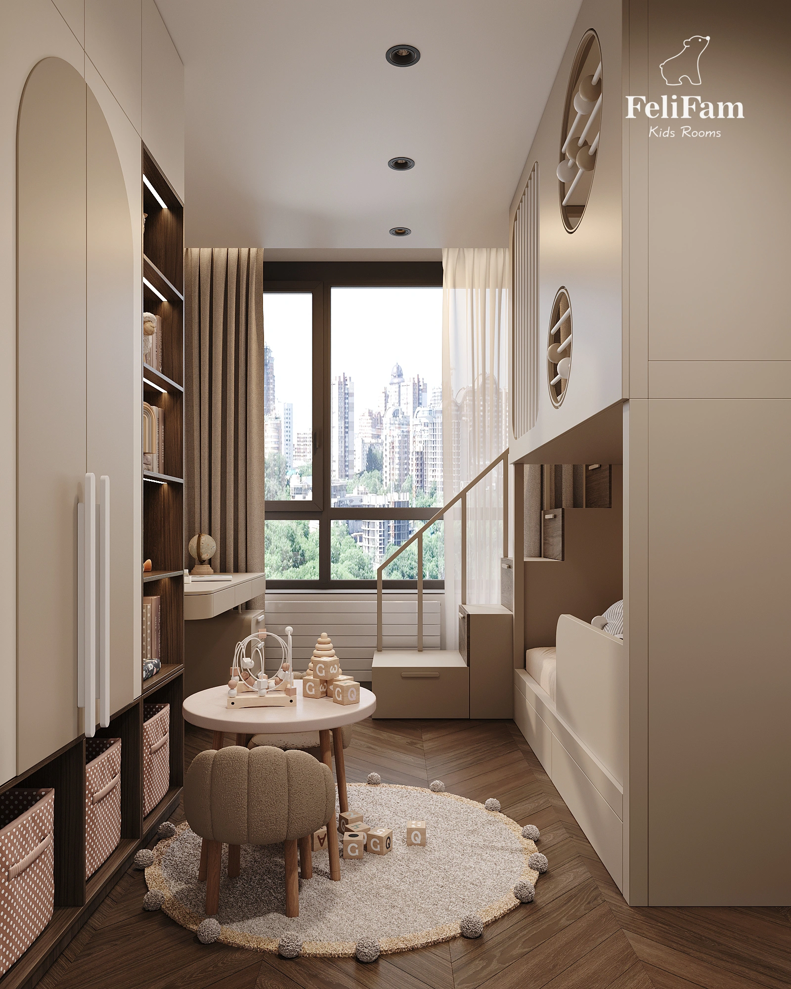 A bunk bed made of high-quality materials combines sleeping and playing areas. A corner wardrobe with open shelves and lighting provides convenient storage.