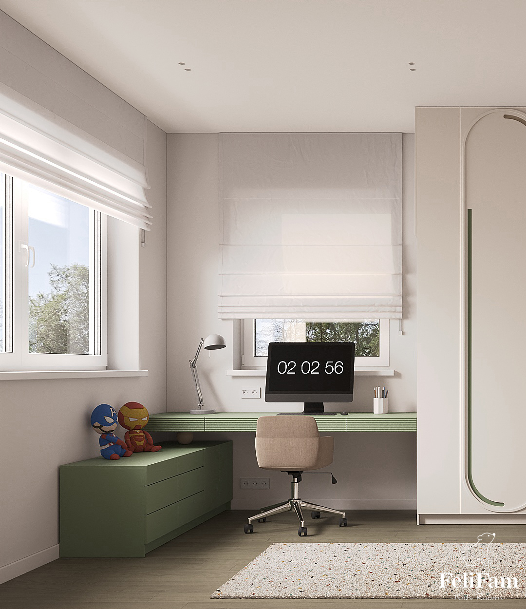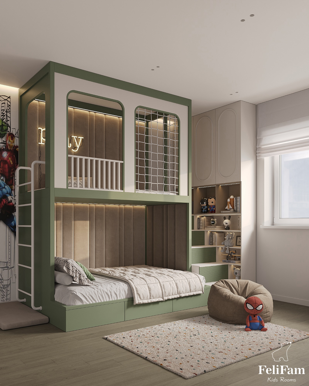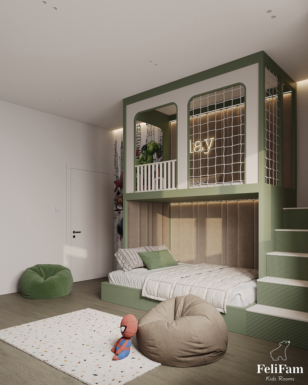 A bunk bed with a play area on top is a good solution for utilizing the space. To get there, we added both comfortable steps and a ladder on the other side. And the study area was placed near the window, which is the best location.