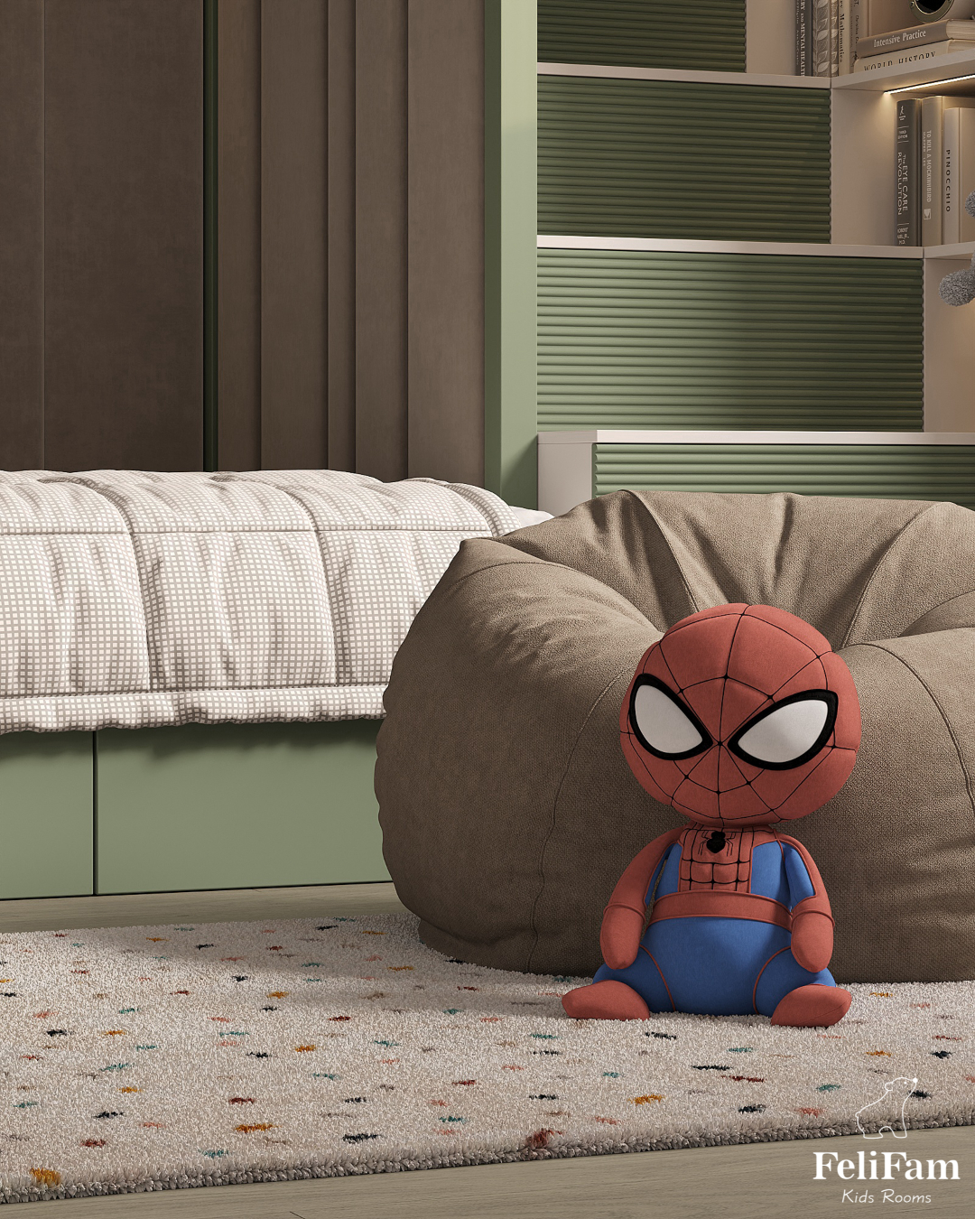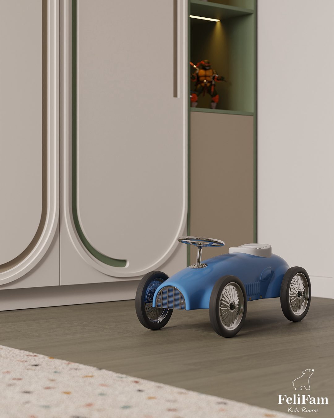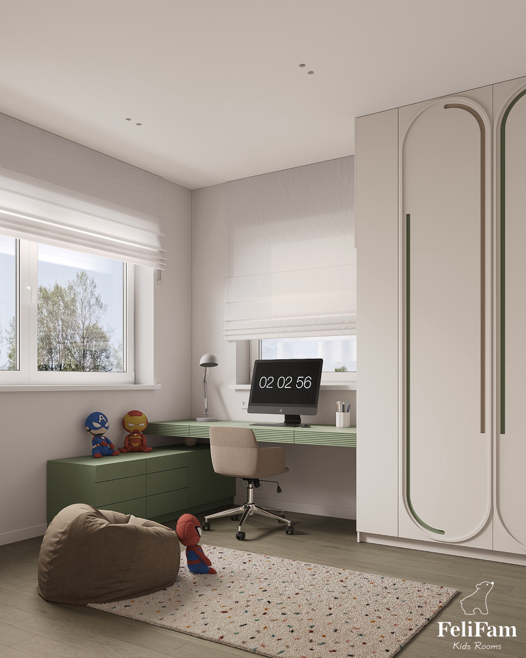 A bunk bed with a play area on top is a good solution for utilizing the space. To get there, we added both comfortable steps and a ladder on the other side. And the study area was placed near the window, which is the best location.