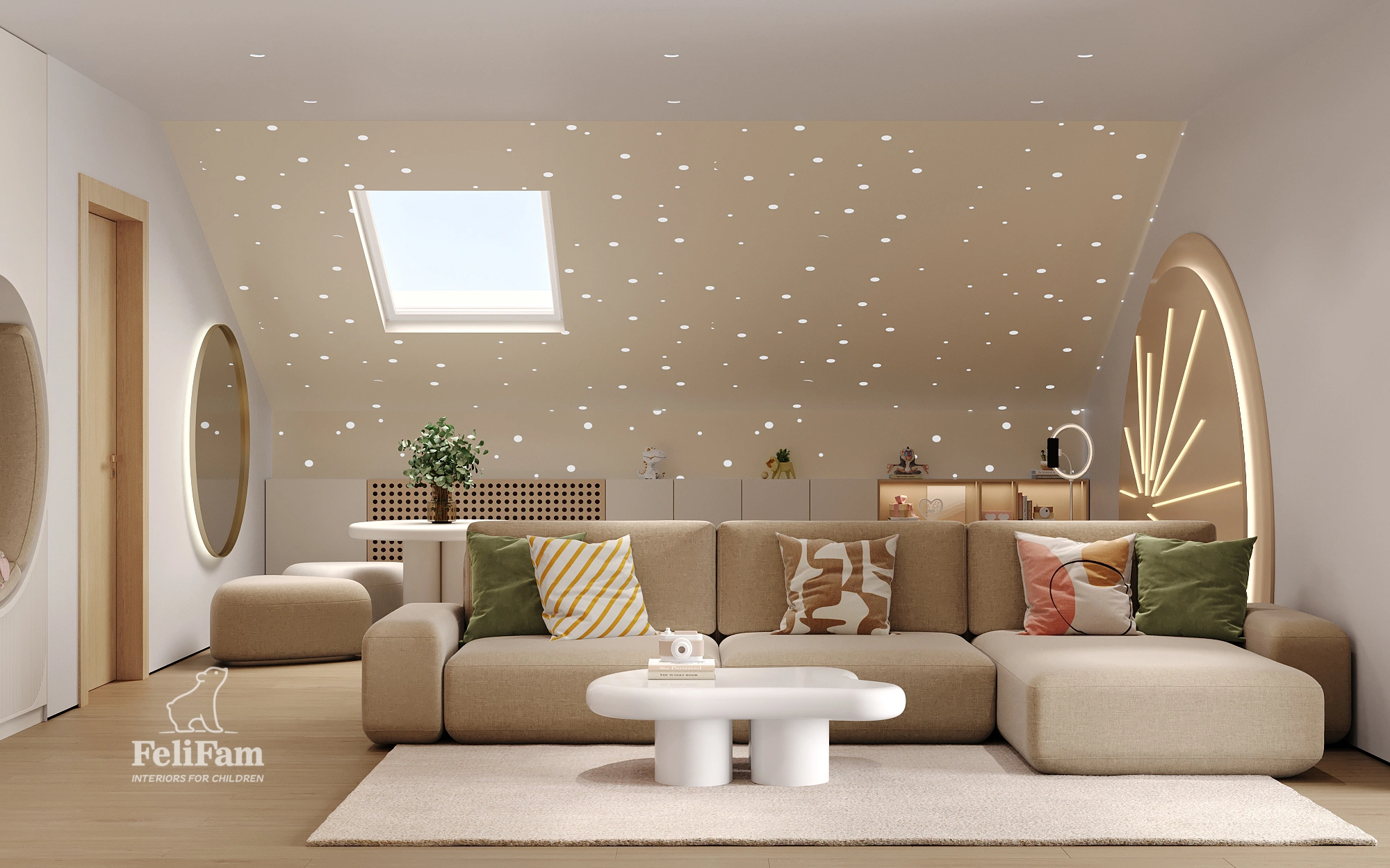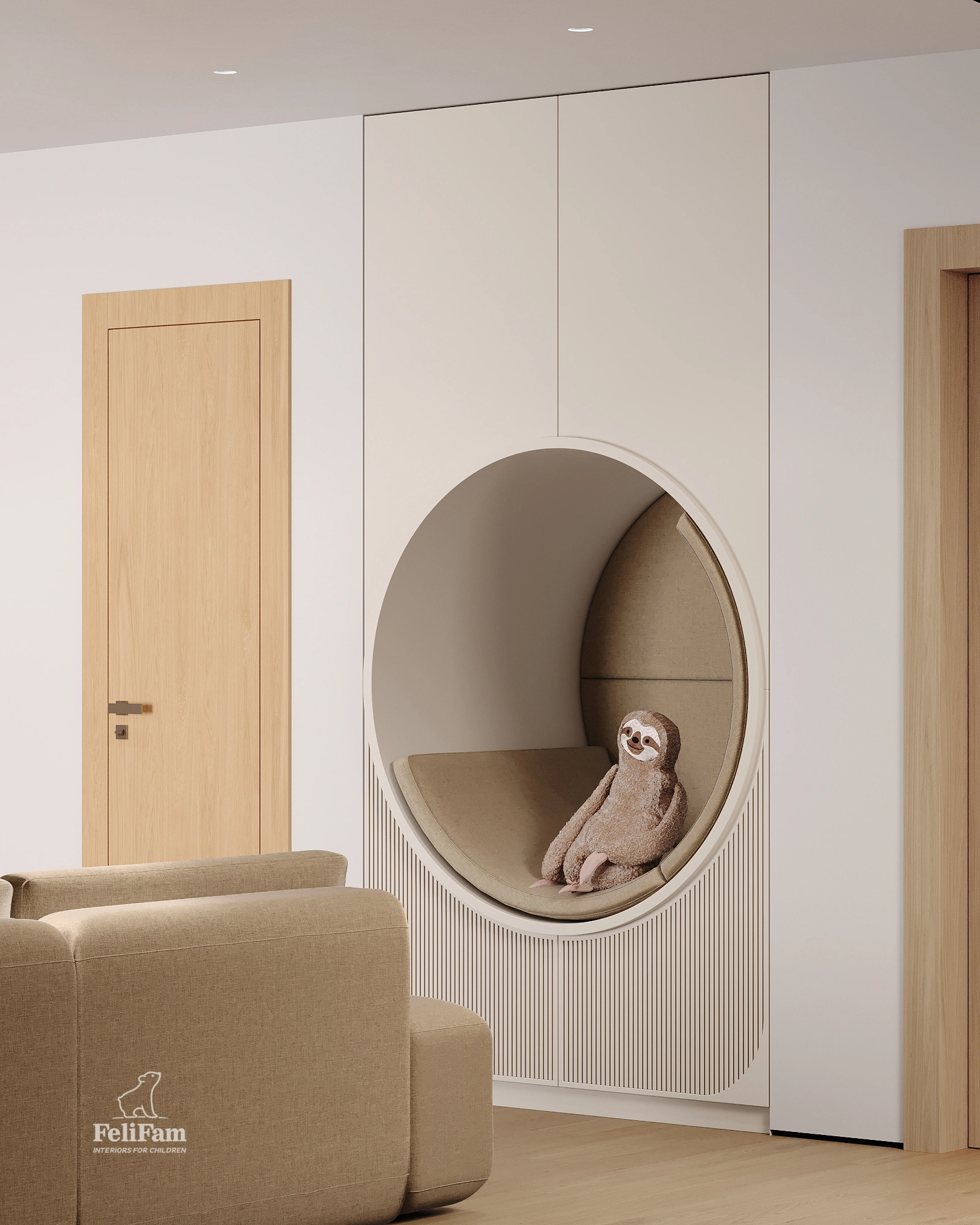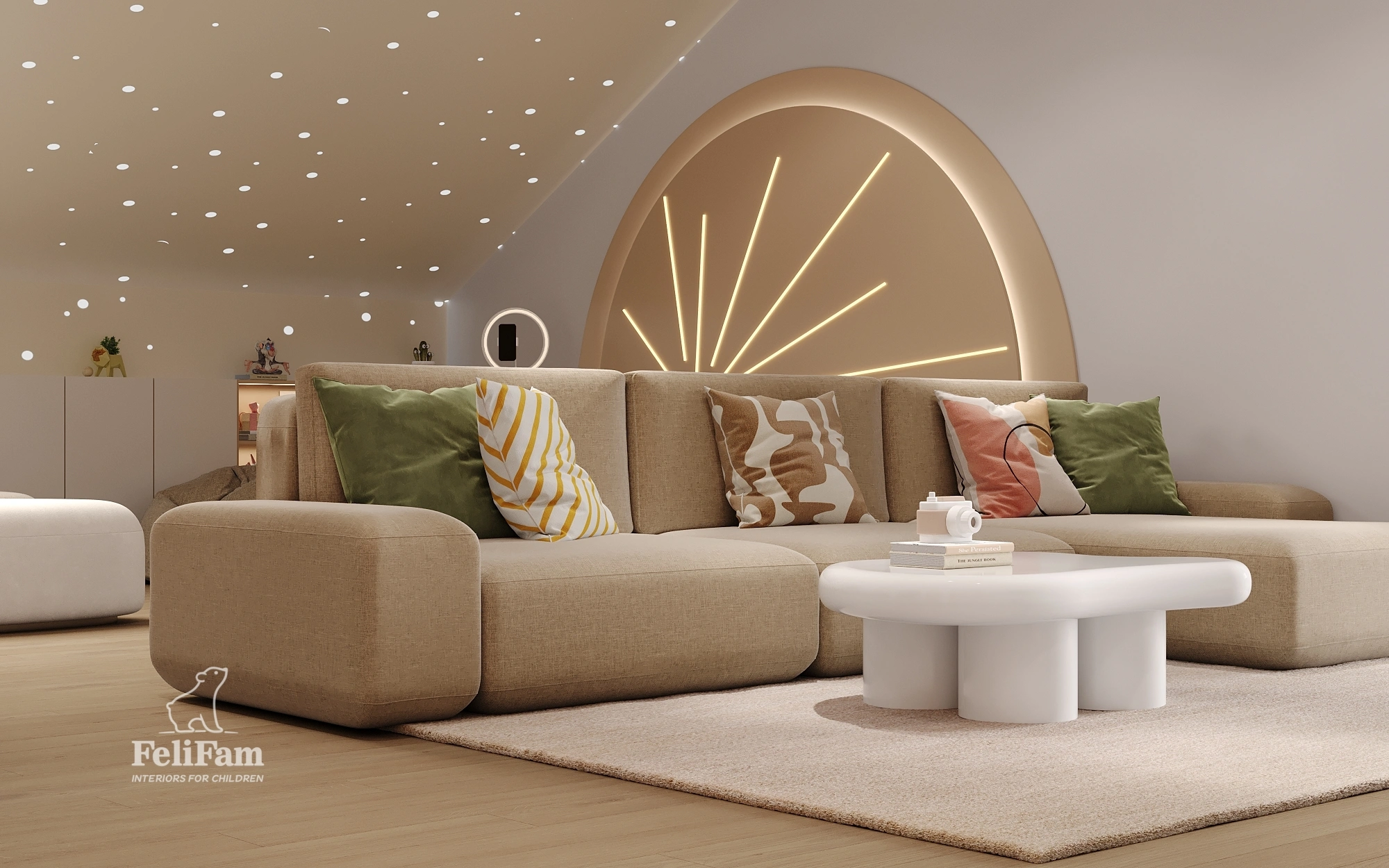 A standout feature of the project is an interactive photo zone that sparks children’s creativity and allows them to create lasting memories. The space is organized with functional zones, storage solutions, and flexibility, making it engaging, safe, and convenient for children of all ages.