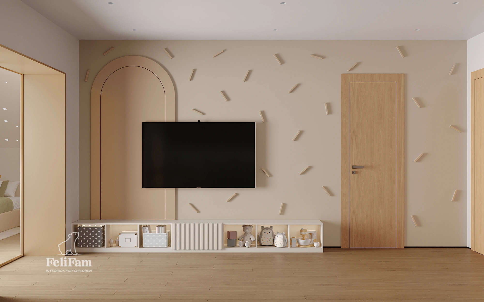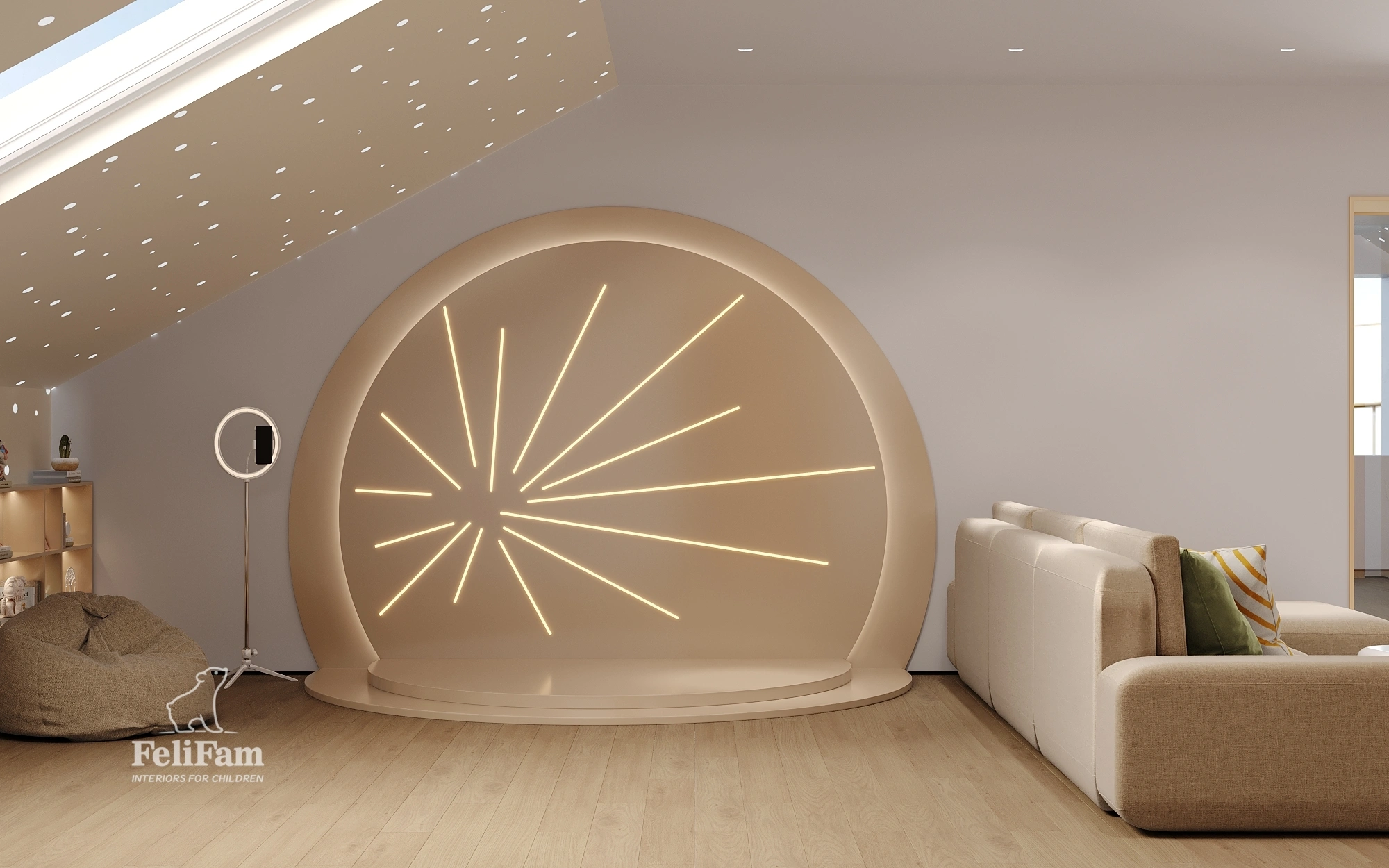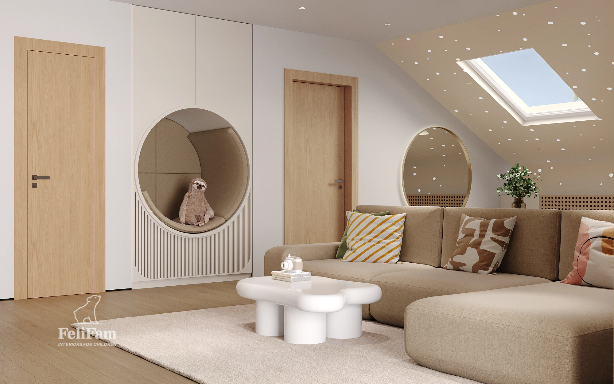 A standout feature of the project is an interactive photo zone that sparks children’s creativity and allows them to create lasting memories. The space is organized with functional zones, storage solutions, and flexibility, making it engaging, safe, and convenient for children of all ages.