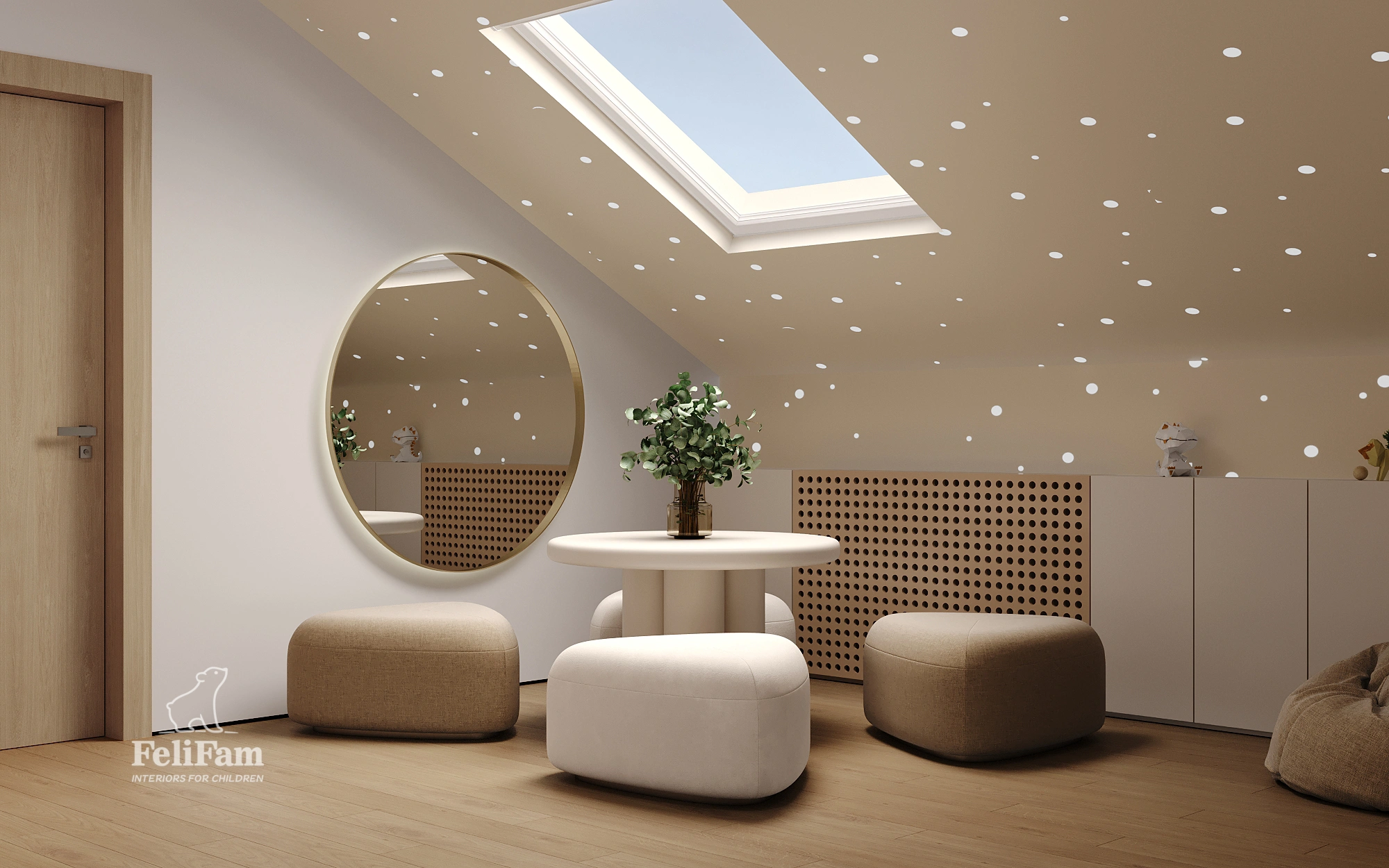 A thoughtfully designed attic beautiful playroom transforms a compact space into a multifunctional area for active play, socializing, and relaxation. The layout ensures openness and plenty of room for group games, table activities, and creative projects, while carefully planned zones make the space maximally comfortable.