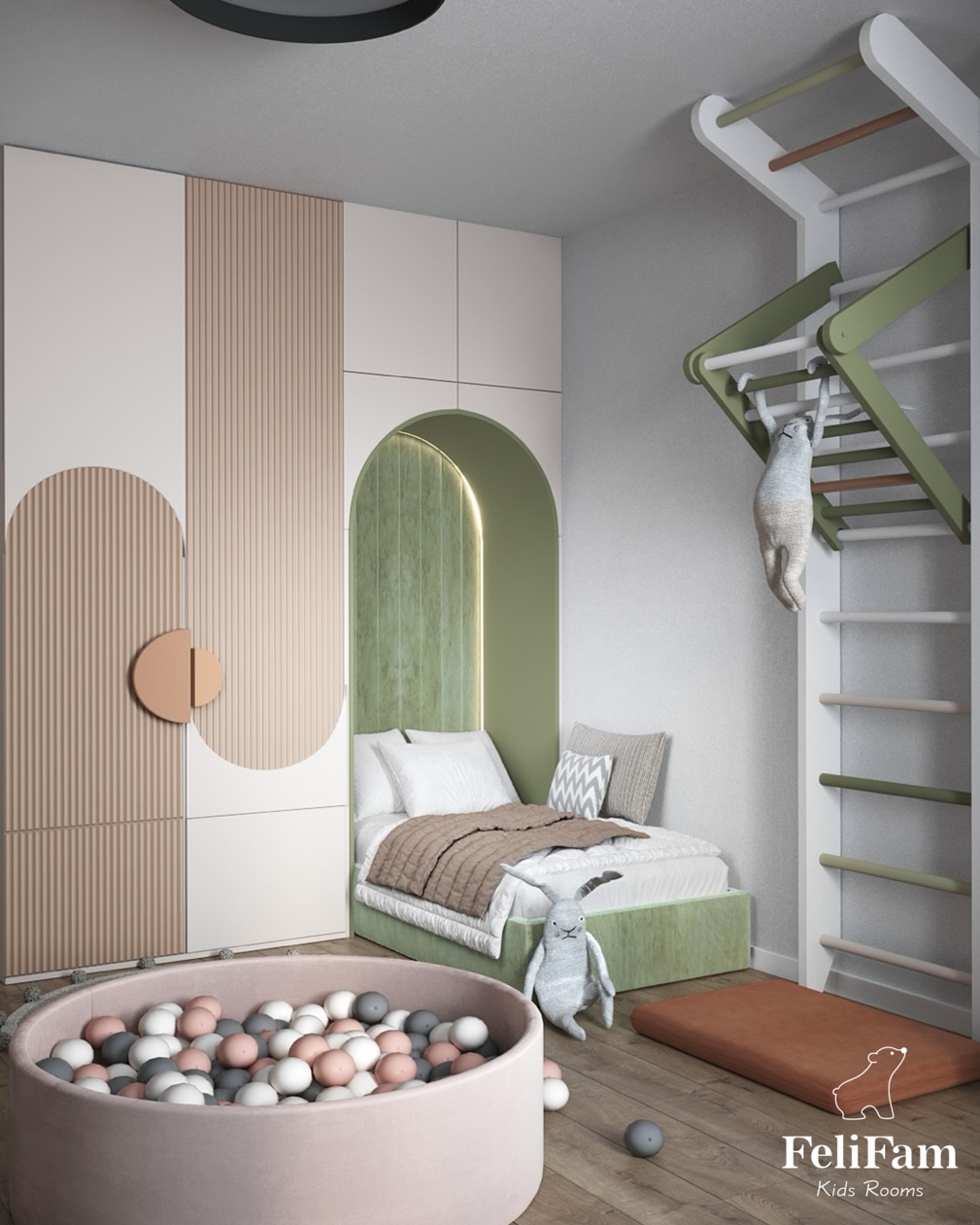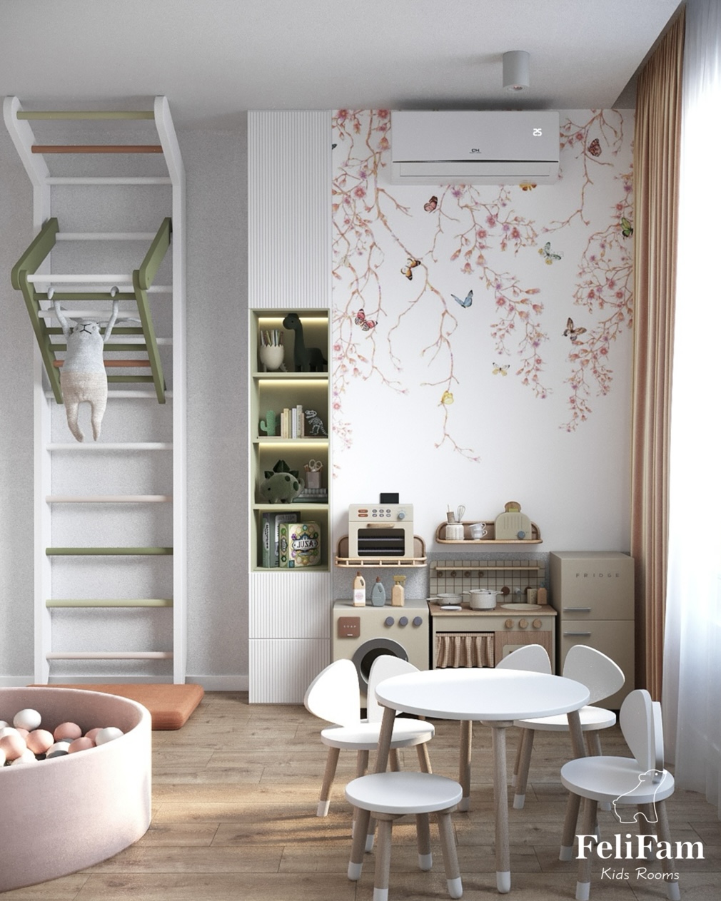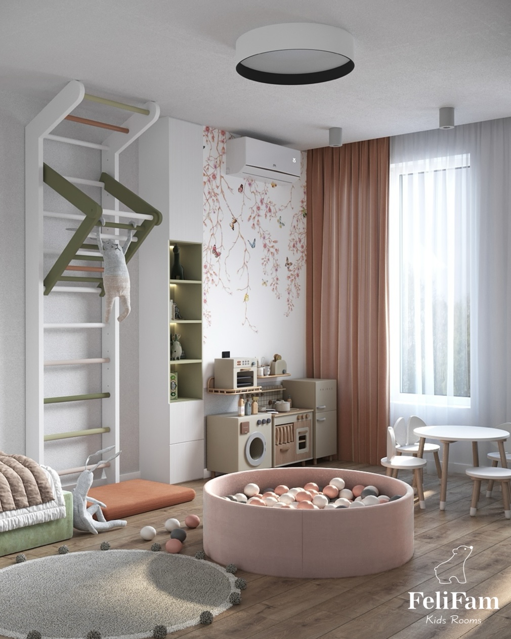 In this project, we thought of everything that is needed for an active 1.5-year-old girl. A Swedish wall for exercising, a drawing table, a chalkboard, a kitchen develops organization and independence, and a dry ball pool is a great place to play.