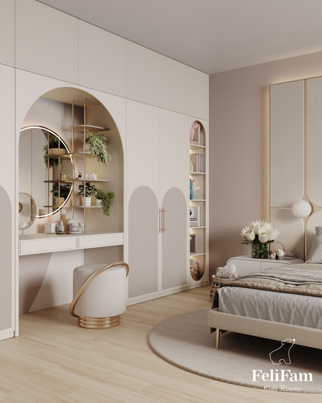We also placed all the necessary areas – a sleeping area, a dressing table, a study area with shelves for things and a wardrobe.