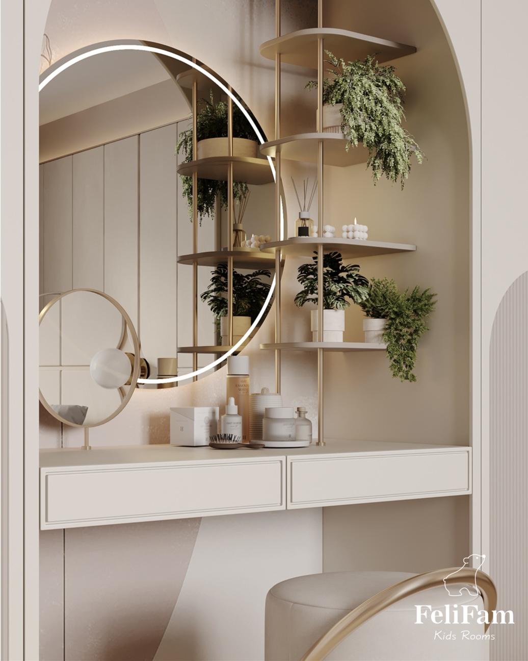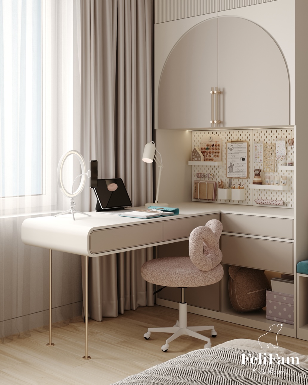 Polina’s room. We created a cozy space for the girl, using pastel and light shades as the main colors and adding accent colors with textiles.