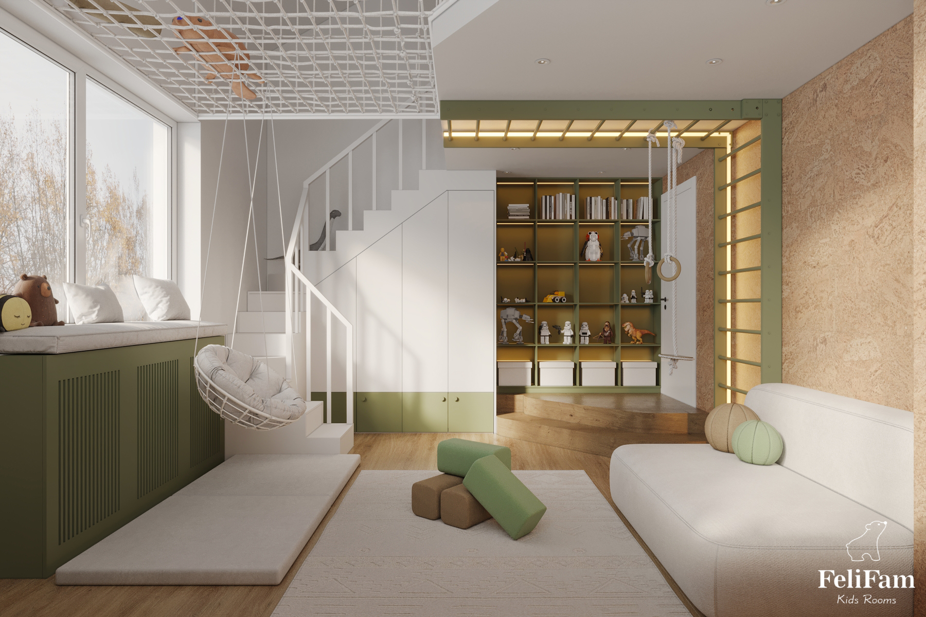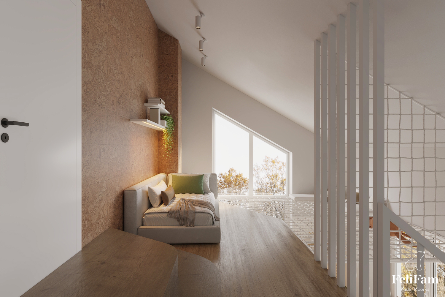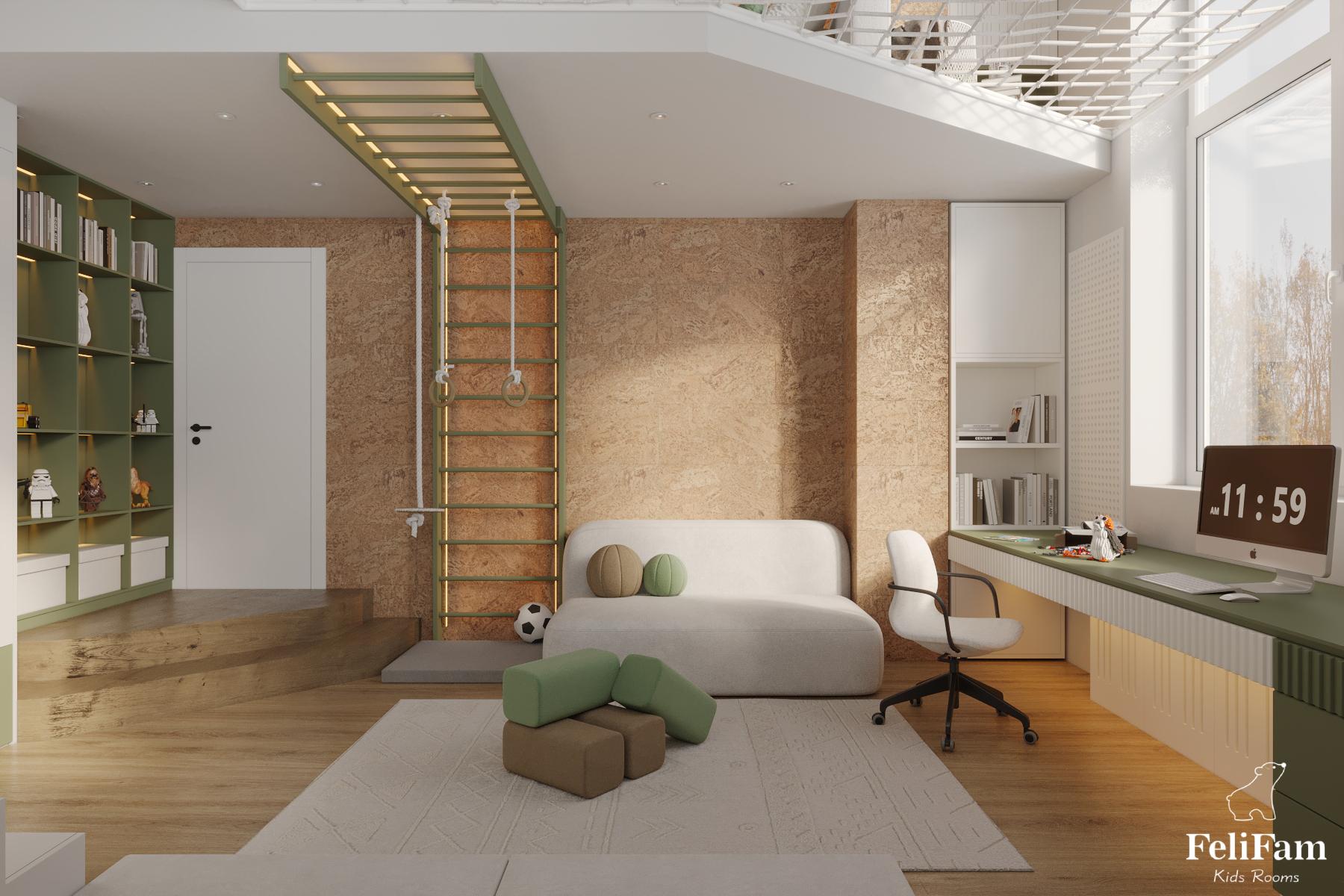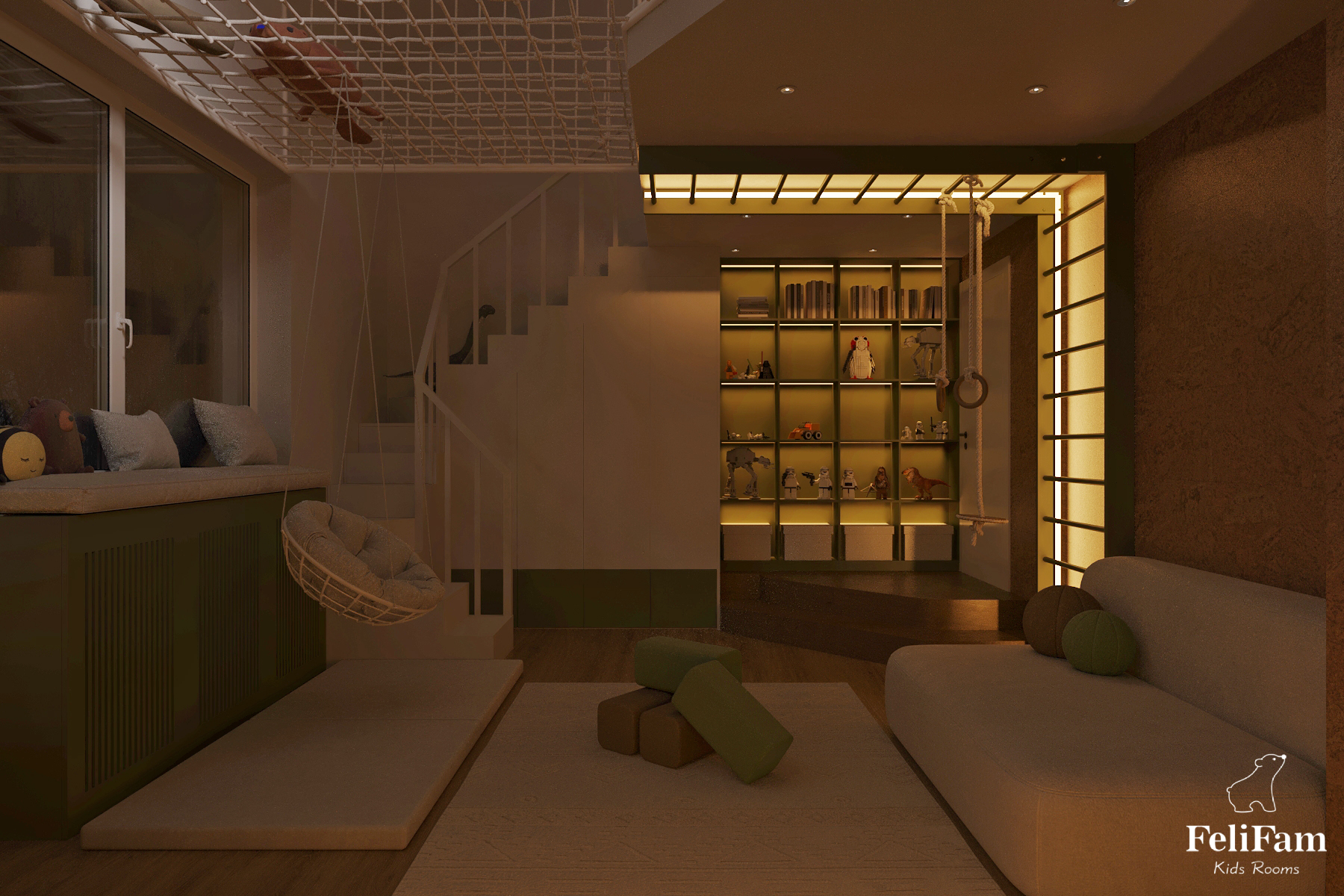 Downstairs there is an area for studying, relaxing, playing games and sports. And above is a sleeping area with a rope weaving above the first floor. This area is also a space for relaxation.