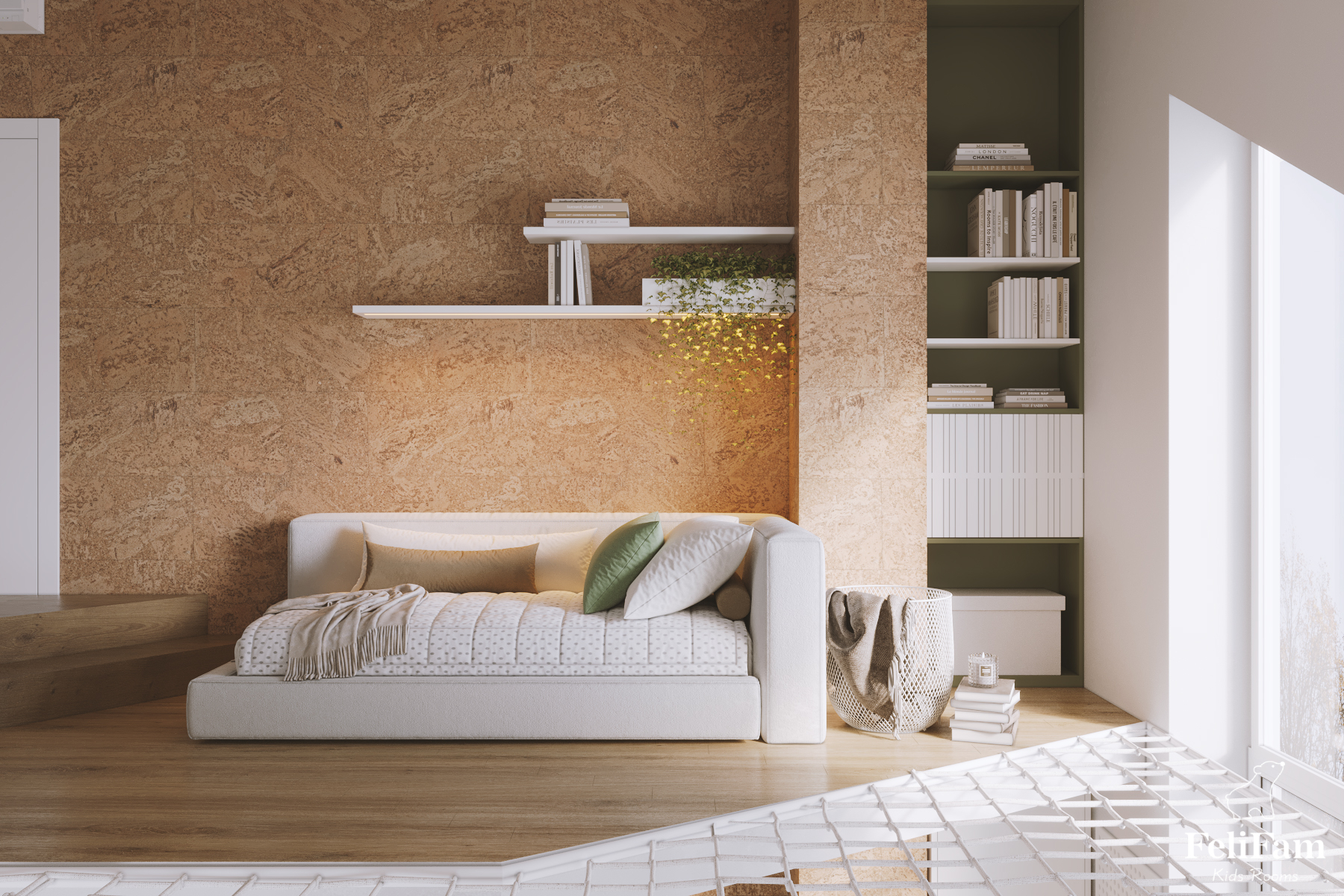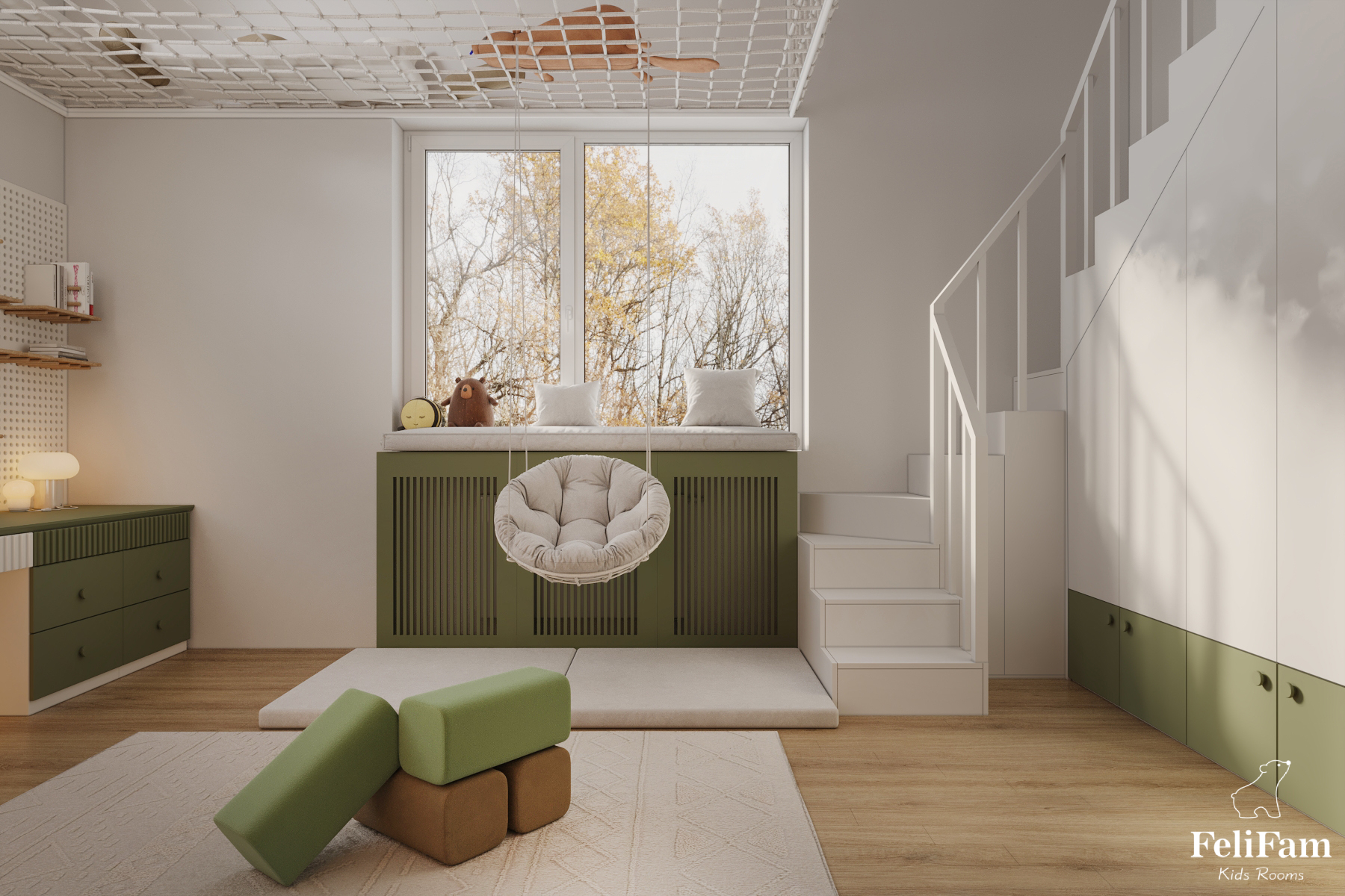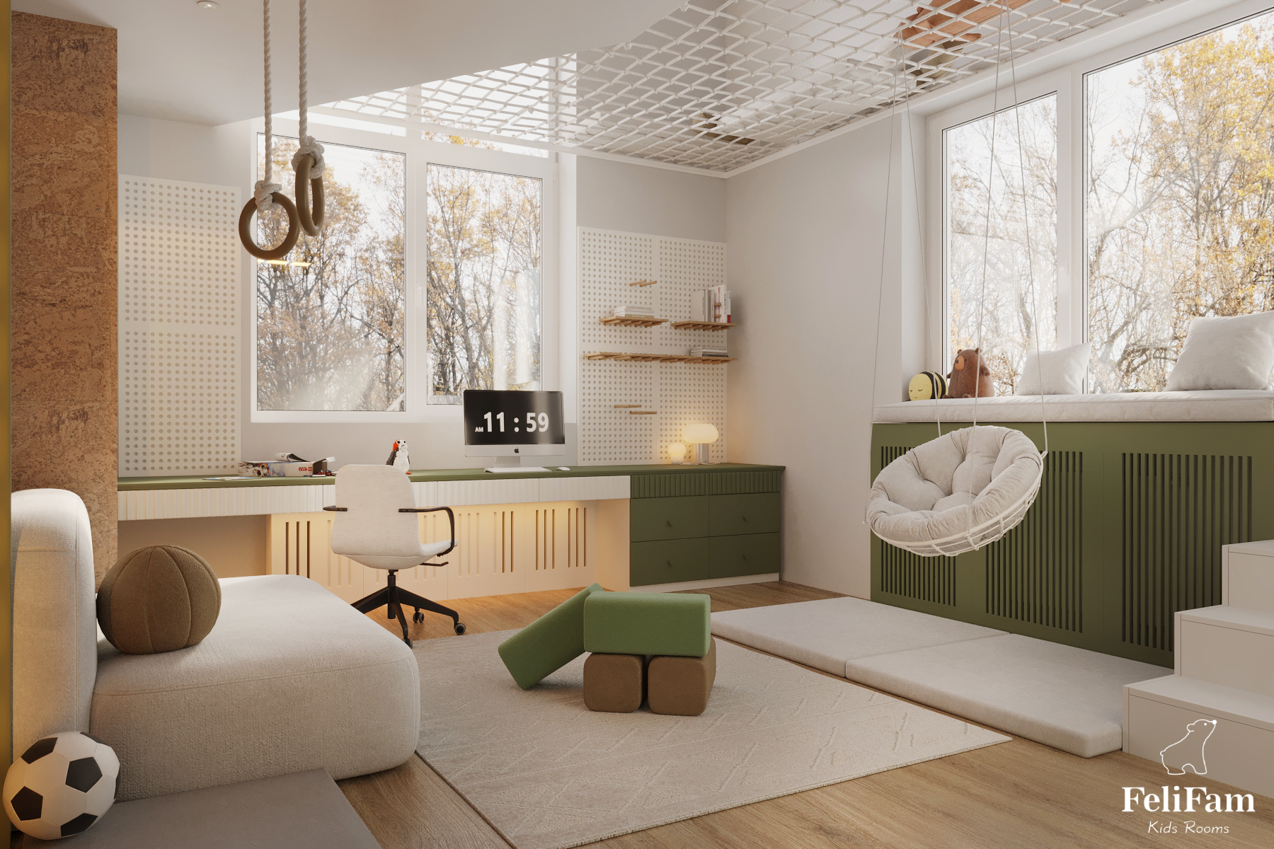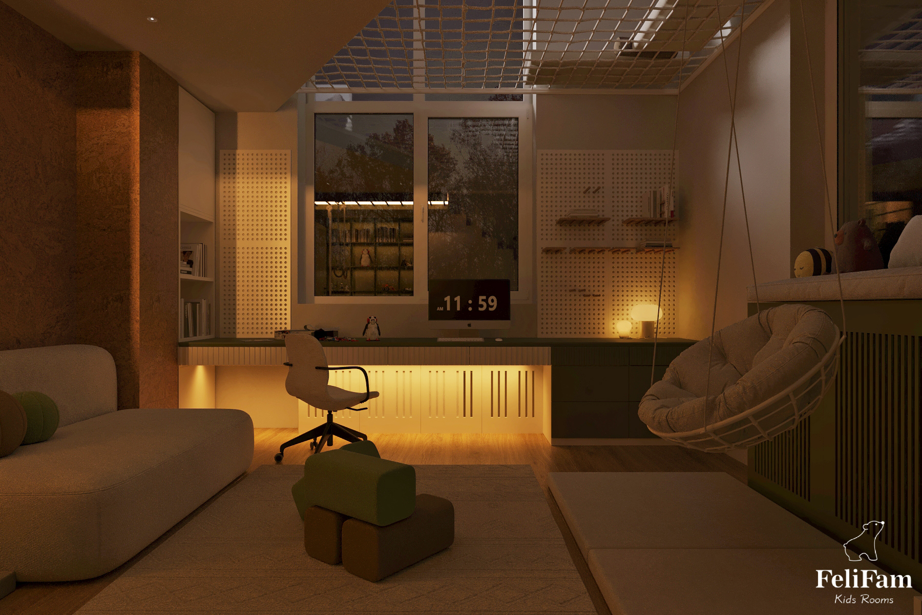 Downstairs there is an area for studying, relaxing, playing games and sports. And above is a sleeping area with a rope weaving above the first floor. This area is also a space for relaxation.