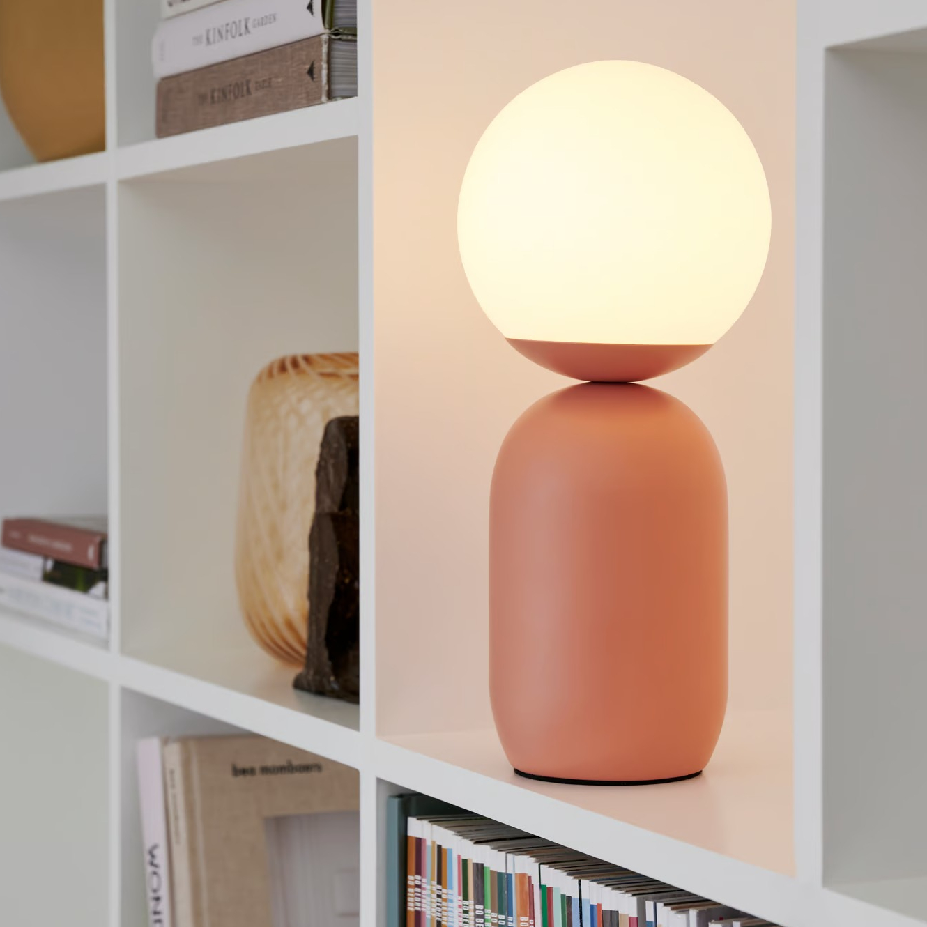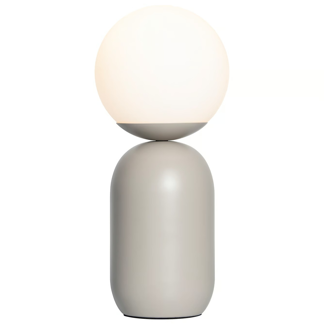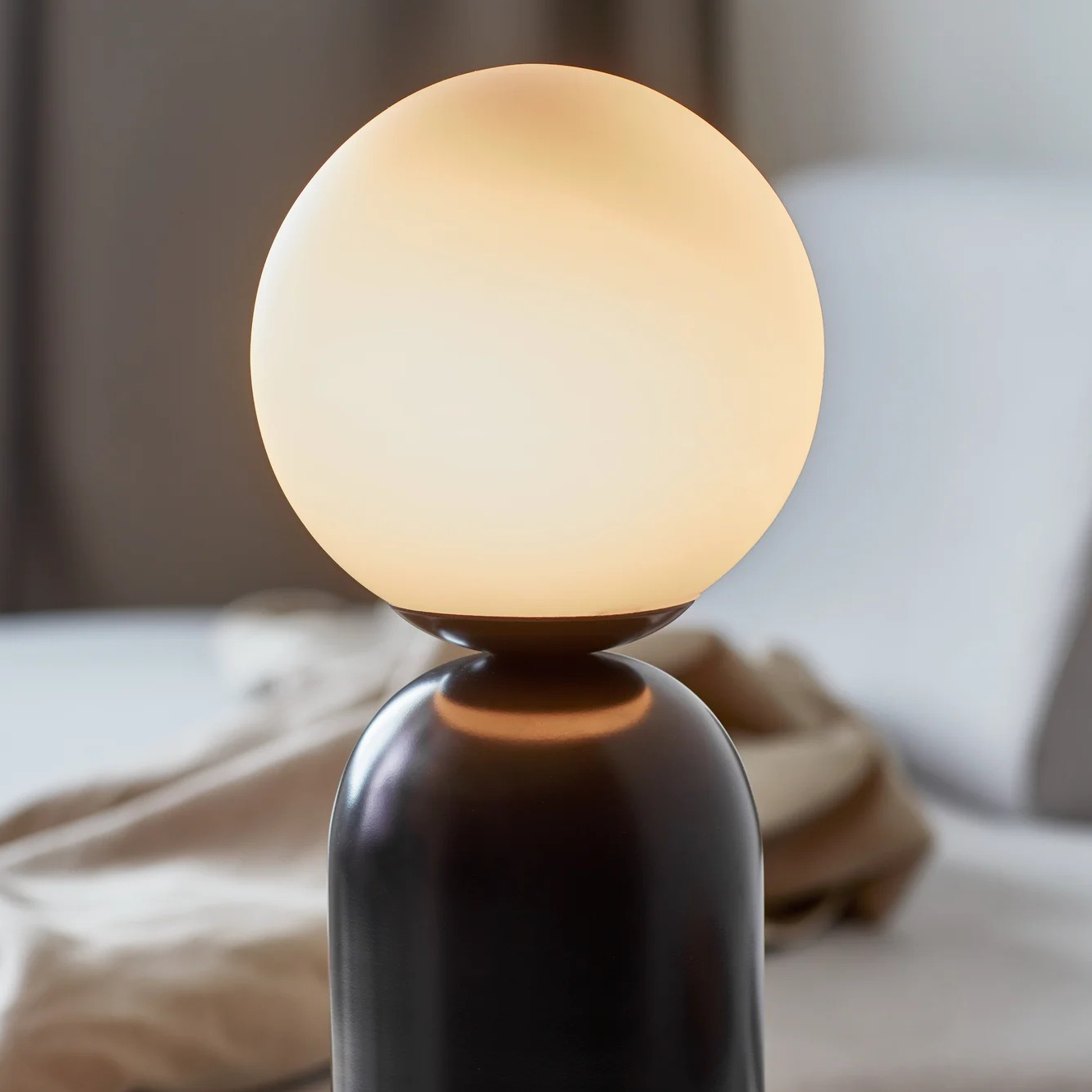 Notti lamp, which has an organic and harmonious shape in a light Scandinavian style. The glass in the lamp is made by hand, thanks to this unique process, the glass has its own unique character and bright appearance. The base of the lamp is made of metal and can be black, gray, green or terracotta.