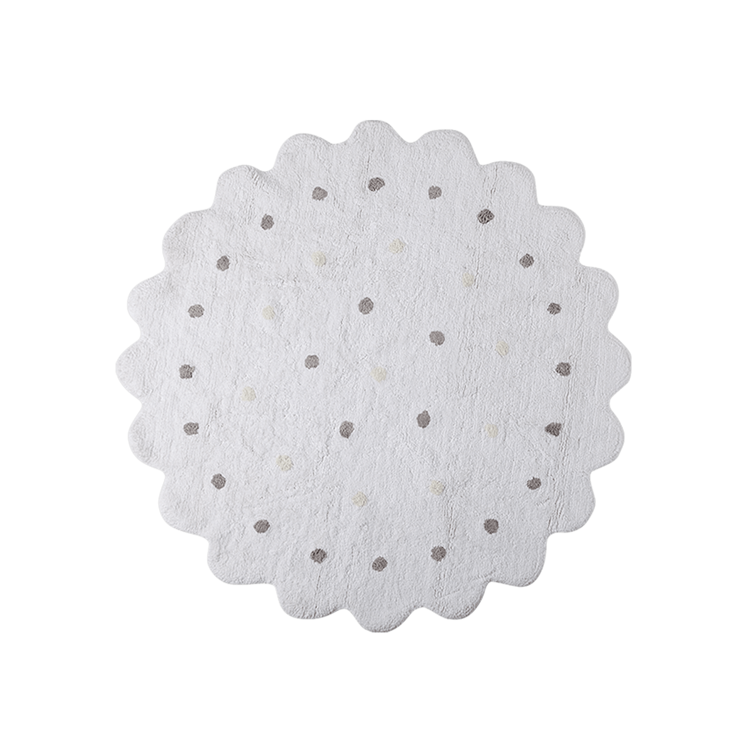 A rug shaped like a cookie? Yuummm! Round cookie shaped mat with jagged edges and small dots that mimic cookie holes for a more realistic look. Handwork and product safety thanks to the use of exclusively natural dyes.