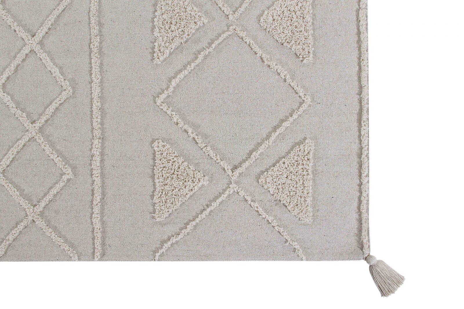 Rug in natural color with a pattern and tassels in each corner. Ideal for an adult interior, it is of exceptional quality and, above all, the possibility of washing in a domestic washing machine. Made from cotton.