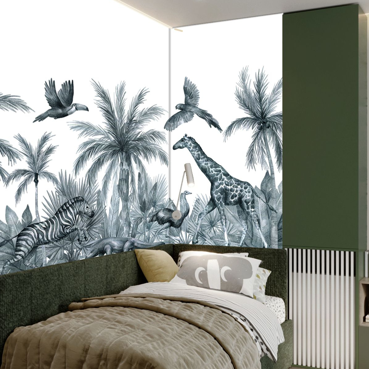 Create a striking ambiance in your child’s room with our black and white jungle wallpaper from Jolly Wall. Designed for both style and developmental stimulation, these wallpapers are made from high-quality vinyl on non-woven fabric. Featuring vivid images and interactive elements, they inspire imagination and learning. Our wallpapers are easy to install, washable, and eco-friendly, ensuring a safe environment for children. Choose this timeless design to bring a touch of adventure and comfort to any kids’ space.