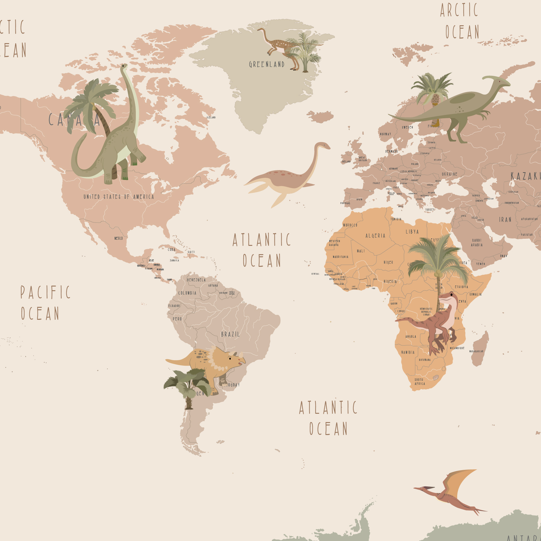 Transform your child’s room with our Country’s Dinosaurs Map Vinyl Wallpaper from Jolly Wall. These premium-quality wallpapers are not only a stylish decoration but also a powerful tool for stimulating development. Featuring realistic dinosaur prints that inspire learning and imagination, they create a unique atmosphere of adventure. Easy to clean and install, these wallpapers are crafted from washable vinyl and are environmentally safe for children. Ideal for creating a cozy and educational environment that sparks curiosity.