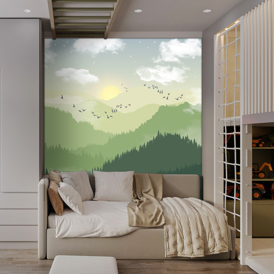 Immerse your child in a world of natural beauty with our green mountains sunshine wallpaper from Jolly Wall. Designed to spark imagination and stimulate development, these wallpapers feature high-quality vinyl on non-woven fabric. They boast vibrant colors, realistic imagery, and are easy to install and wash. Crafted with environmentally friendly materials, they ensure a safe and cozy atmosphere in any kids’ room. Choose from various designs to create a serene and inspiring space.