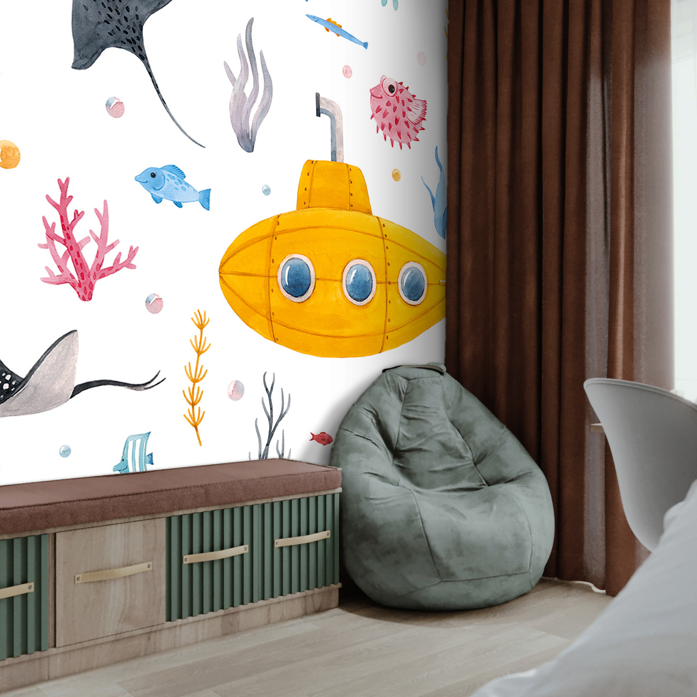Transform your child’s space into an underwater adventure with Jolly Wall’s yellow submarine vinyl photo wallpaper. Easy to install and washable, this premium wallpaper enhances any room with its captivating design and stimulating visuals.