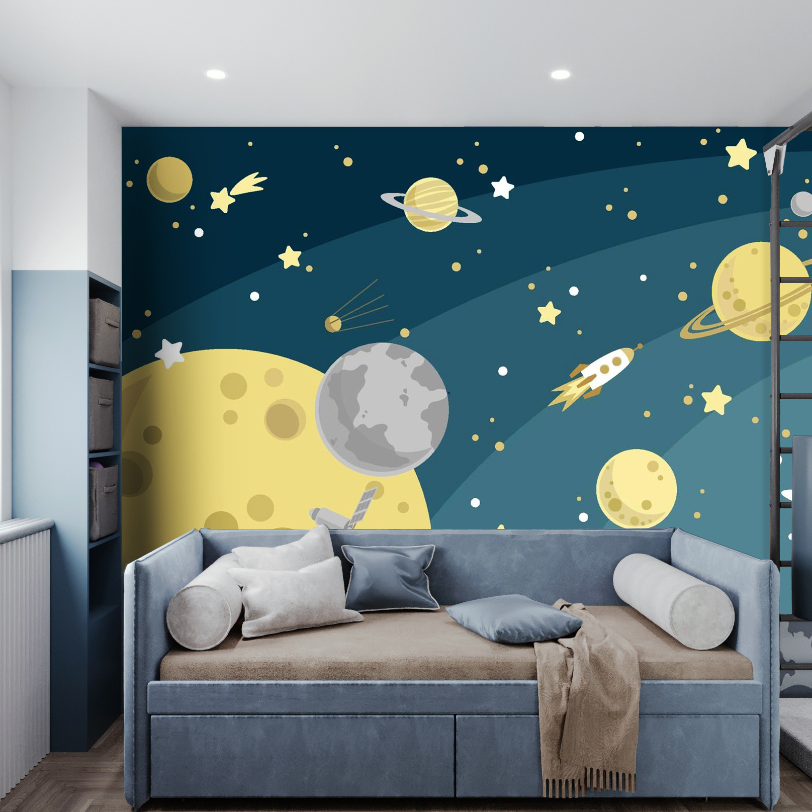 This is exactly the type of wallpaper we use in our projects — thanks to its quality, modern look, and ability to create a captivating and inspiring atmosphere. Made from eco-friendly materials, the wallpaper contains no harmful substances and is completely safe. It’s the perfect choice for children’s rooms, combining practicality with aesthetics to make the space comfortable, cozy, and exciting for little ones.