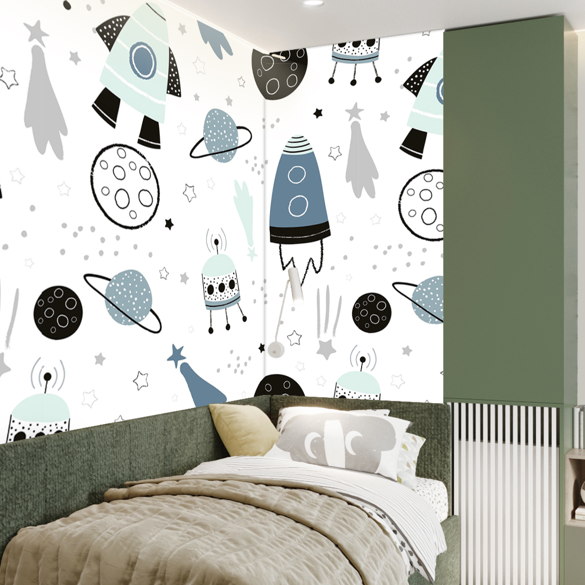 Jolly Wall presents premium vinyl photo wallpaper adorned with rockets on a stylish white background, ideal for enhancing children’s rooms with a blend of style and developmental benefits. These wallpapers are washable, easy to install, and crafted from environmentally safe materials, ensuring a cozy and stimulating environment for children.