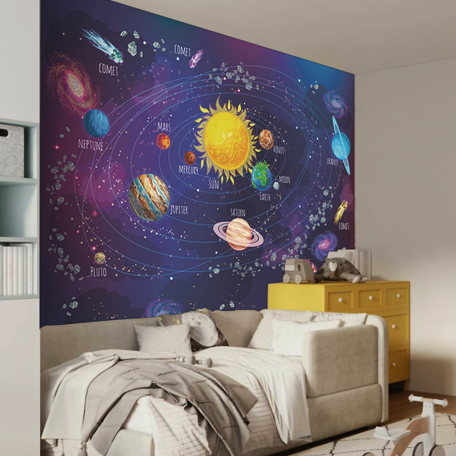 Enhance children’s rooms with Jolly Wall’s premium color map of planets vinyl photo wallpaper. Designed for both decoration and developmental benefits, featuring high-quality prints, washable material, easy installation, and safety for children.