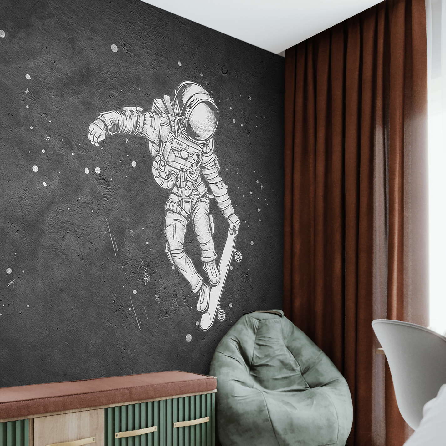 Bring adventure into your child’s room with Jolly Wall’s premium vinyl photo wallpaper featuring an astronaut on a skateboard. Designed for both aesthetics and developmental stimulation, it’s easy to install and wash.